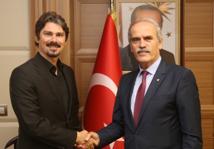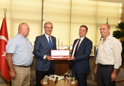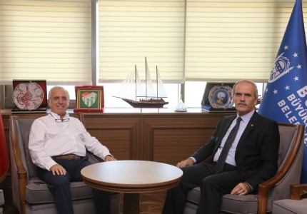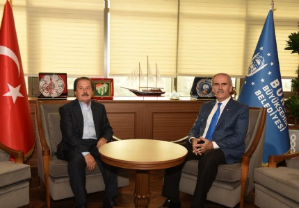 Devlet eski bakanlarından işadamı Cavit Çağlar, Büyükşehir Belediye Başkanı Recep Altepeyi yeni belediye binasında...