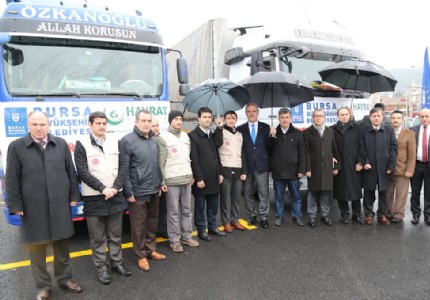 Bursa Büyükşehir Belediyesi, yiyecek ve giyecek maddelerinden oluşan 2 Tır yardım malzemesini daha Suriyedeki...