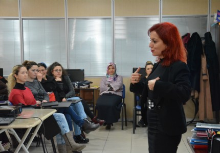 Bursa Hanımlar Lokalinde düzenlenen Beden dili ve etkili iletişim konulu seminerde jest ve mimikleri kullanarak...