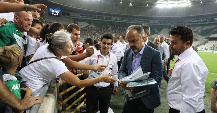 Büyükşehir Belediye Başkanı Alinur Aktaş, Bursaspor-Fenerbahçe hazırlık maçı öncesinde onlarca çocuğa Bursaspor...