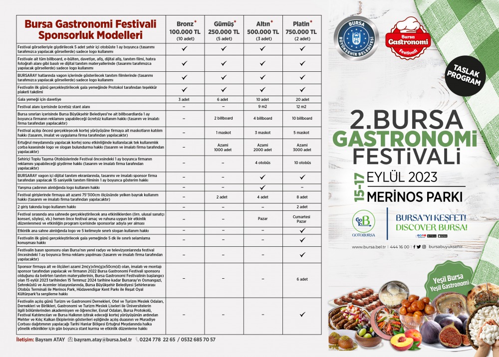 Bu yıl 15-17 Eylül tarihleri arasında Bursa Merinos Park’ta “Yeşil Bursa Yeşil Gastronomi” temasıyla gerçekleştireceğimiz “2. Bursa Gastronomi Festivali”, geçmişten geleceğe Bursa Mutfağını lezzet tutkunlarıyla buluştururken, Türk Mutfağının sürdürülebilirliği adına, ünlü şefler ve akademisyenlerin katkılarıyla birçok etkinlikte mutfak mirasımıza katkı sağlayacak.