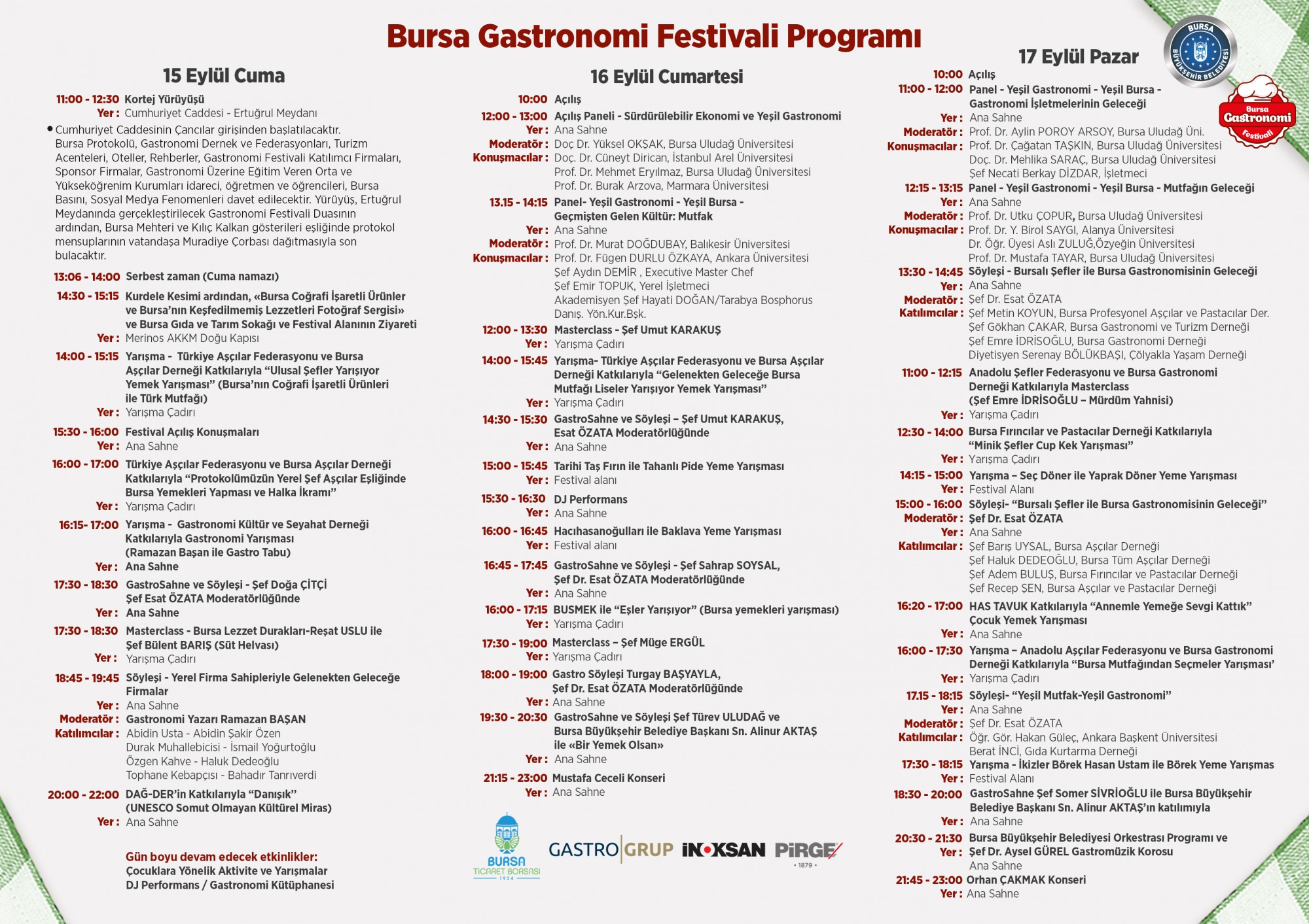 Bursa turizim Fuarı ve Bursa gıda Fuarı ile entegreli bir şekilde gerçekleşen 1. Bursa Gastronomi Festivali kapsamında 5 farklı panelde Bursa’nın gastronomi değerleri ele alınmıştır. Festival öncesinde ise Bursa Gastronomisine yönelik çalıştay düzenlenmiştir. Bu çalıştaya 50’nin üzerinde akademik, gastronomi, firma, işletme vb. alanlarla ilgili uzman kişilerle Bursa’nın Gastronomisi mercek altına alınmıştır. Turizm dünyasının önemli temsilcileri, acenta yetkilileri, sosyal medya fenomenleri, ulusal ve yerel basın mensuplarının dahil edildiği bir gastronomi turu düzenlenmiştir.