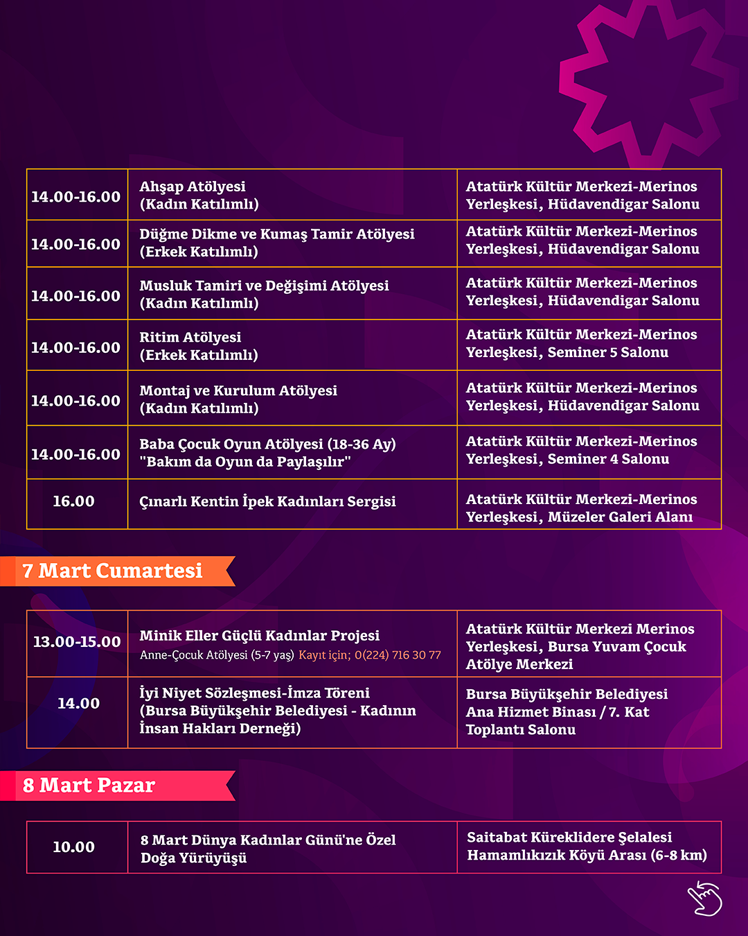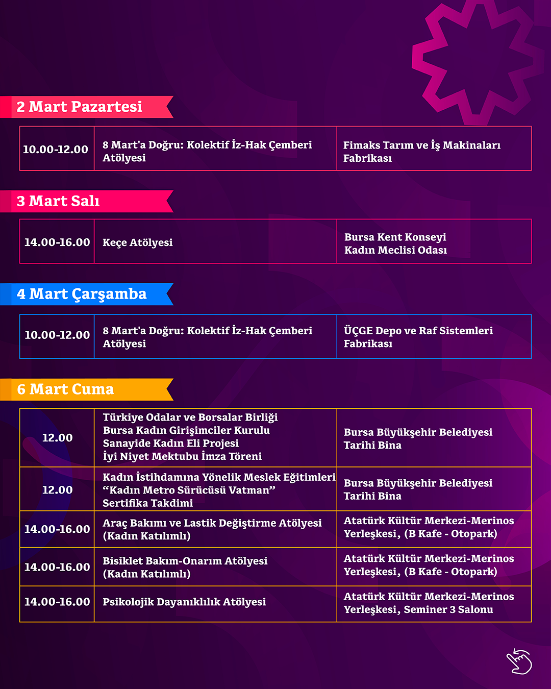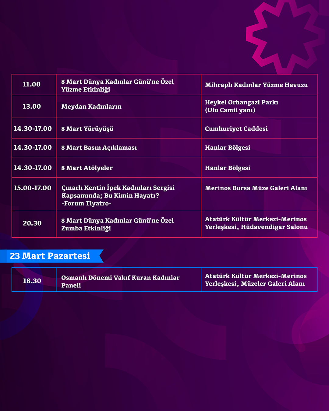 2-23 Mart 2026 tarihleri arasında, Bursa Kent Konseyi iş birliği ile düzenleyeceğimiz ve dayanışmamızı büyütecek etkinliklerimizde buluşalım; her arenada “Ben de varım!” diyen kadınların sesine ses katalım.