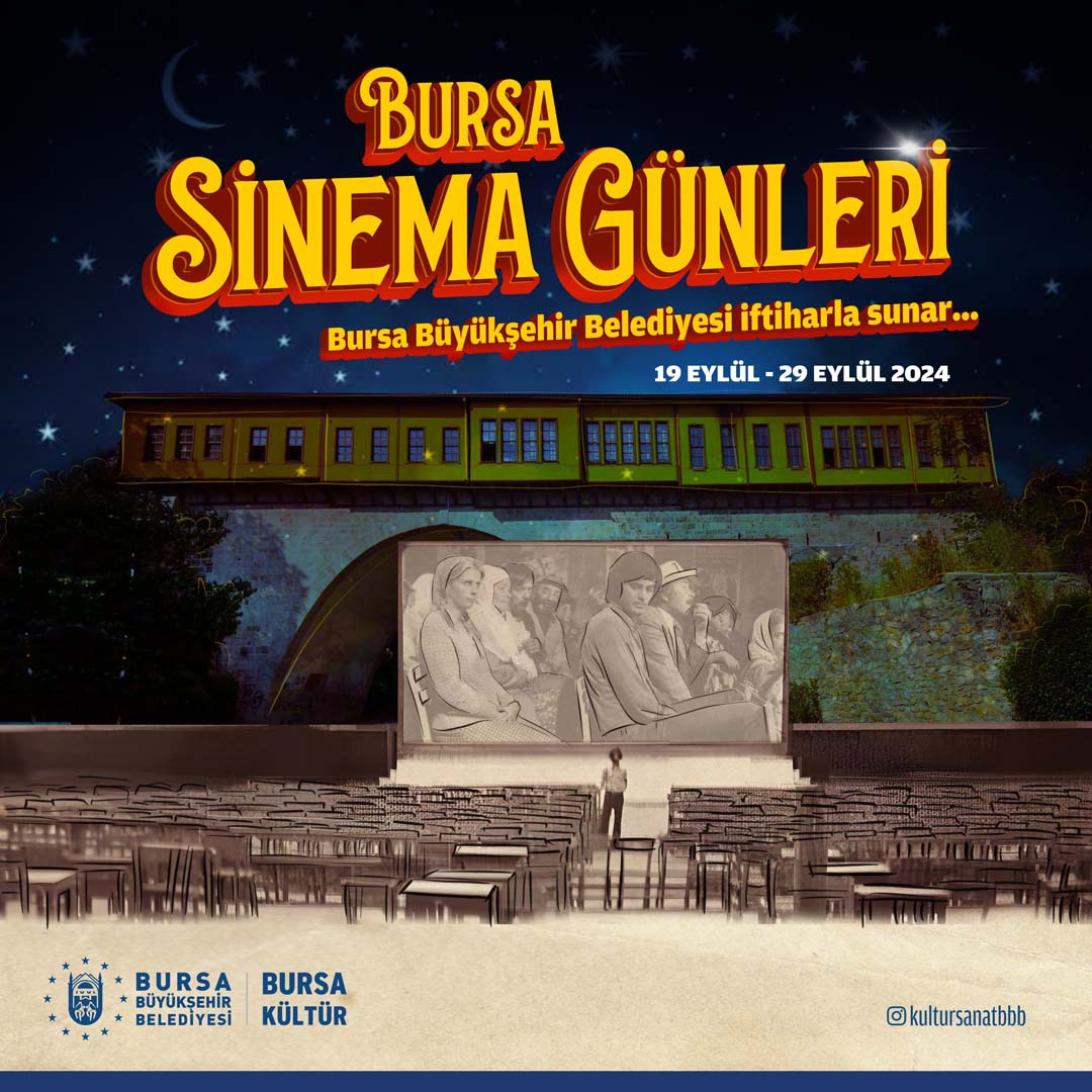 Bursa Sinema Günleri başlıyor. Birbirinden etkileyici oyunculuklar ve hikayeler ile açık hava sinemasının keyfini çıkaracağız. Gökdere Vadisi (Setbaşı Şehir Kütüphanesi Üftade Salon Girişi) ve Kültürpark Atatürk Stadyumu Kütüphanesi önünde gerçekleşecek olan açık hava sinema gösterimlerimize davetlisiniz. Etkinliklerimiz ücretsizdir. Bilet gerektirmez.