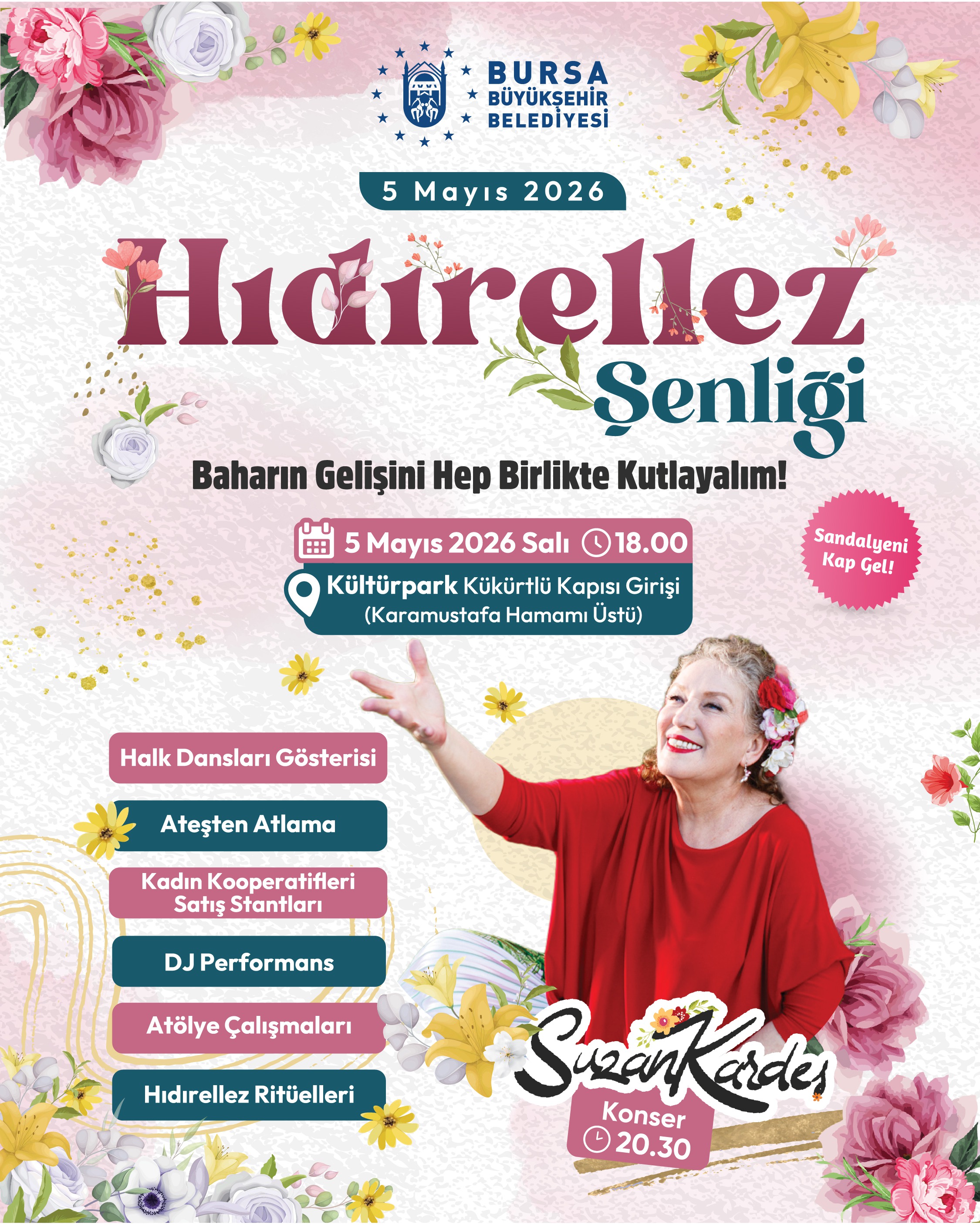Bursa Büyükşehir Belediyesi’nin düzenlediği Hıdırellez Şenliği’nde, Suzan Kardeş’in enerjisiyle baharı kucaklamaya davetlisiniz. Hıdırellez gelenekleri, keyifli atölyeler ve ateşten atlama etkinliği ile bu özel günü Kültürpark’ta hep beraber kutlayalım!