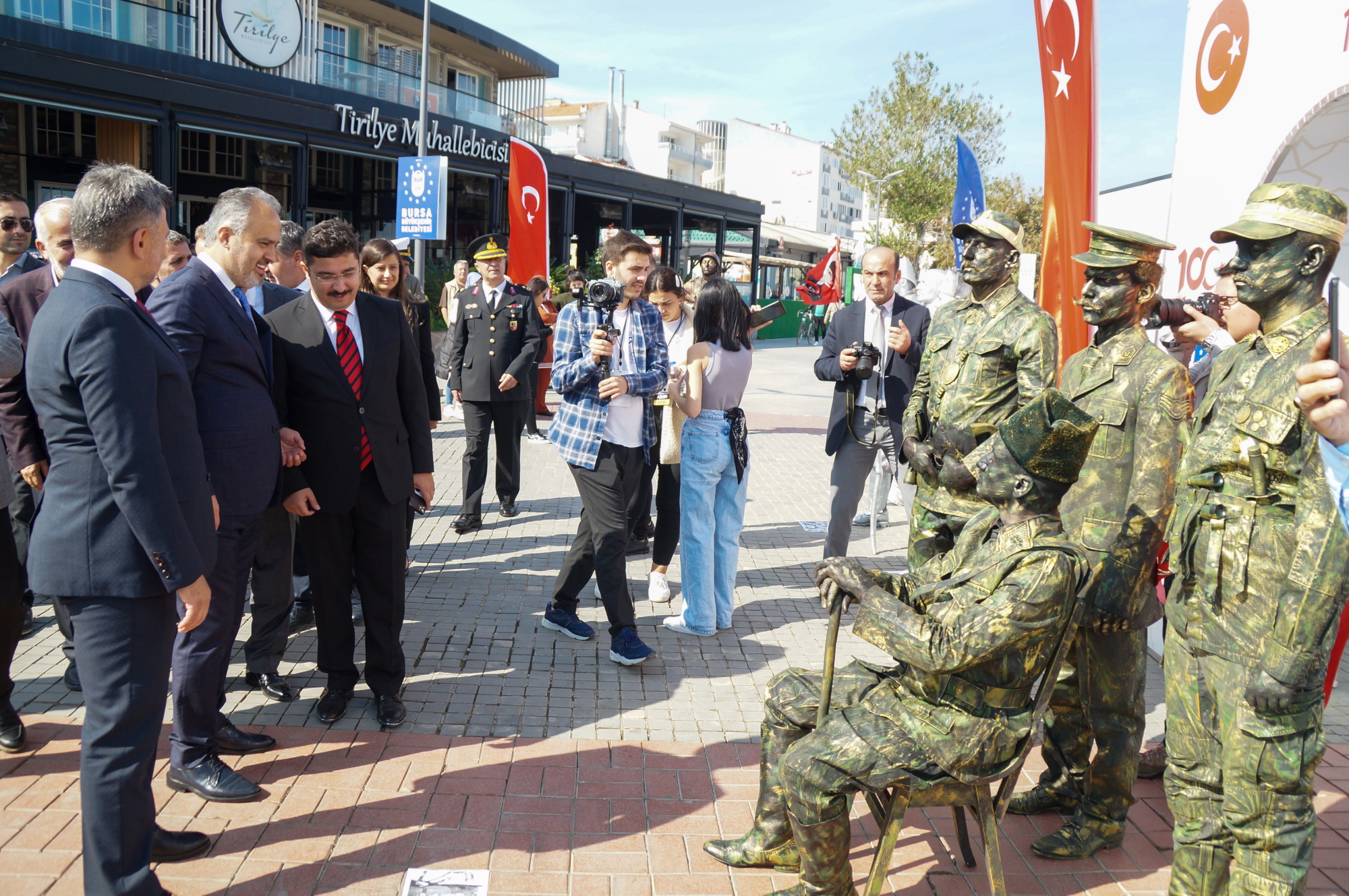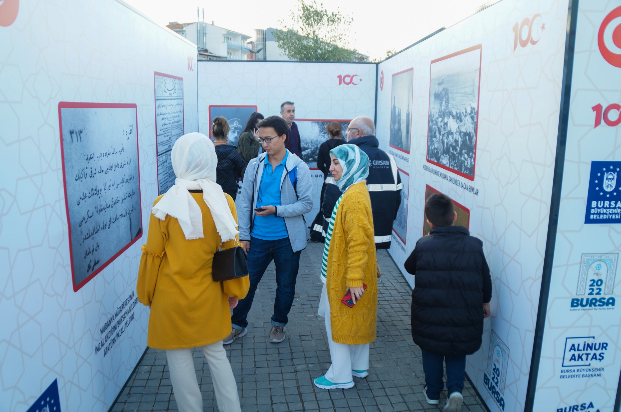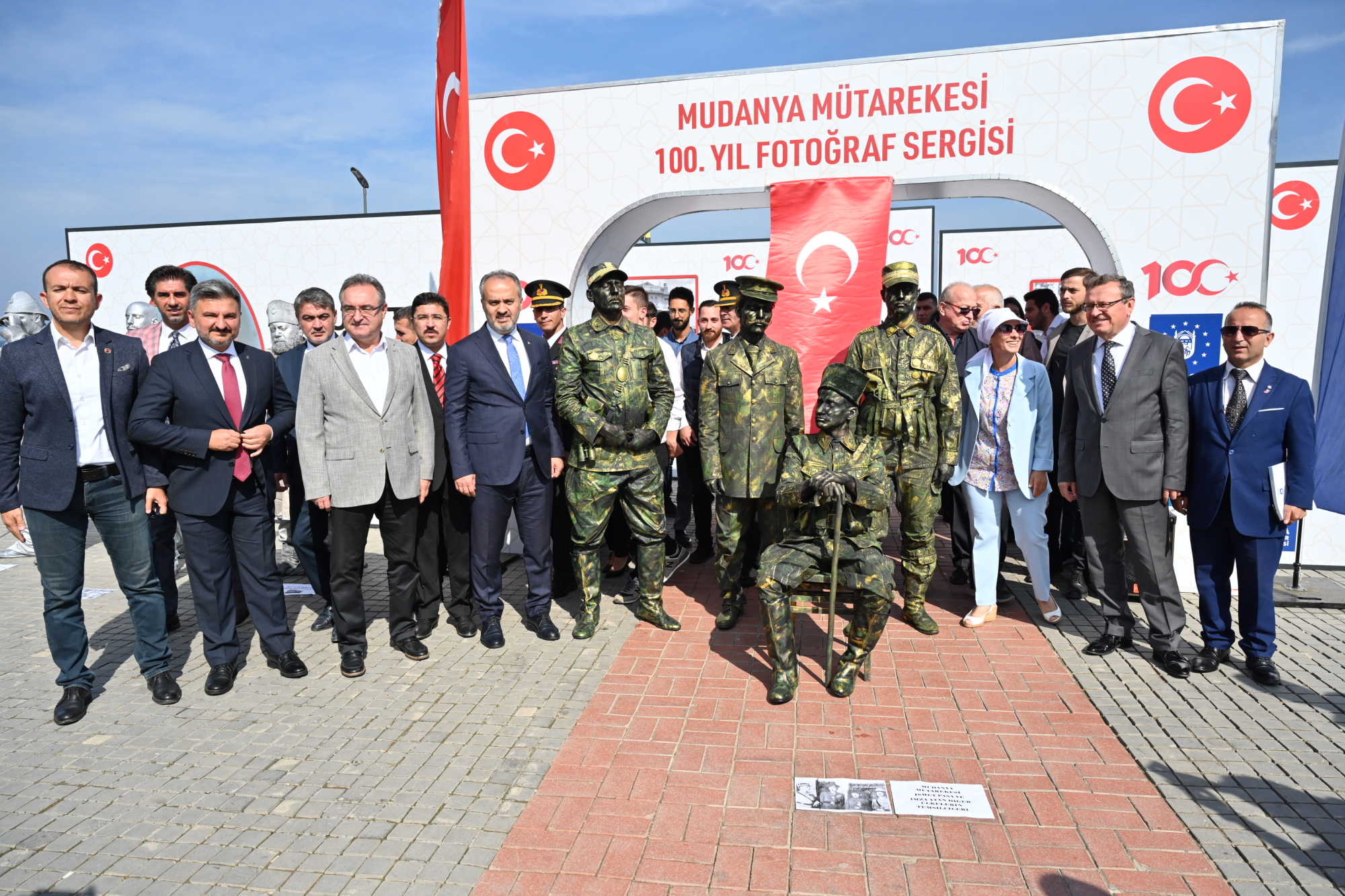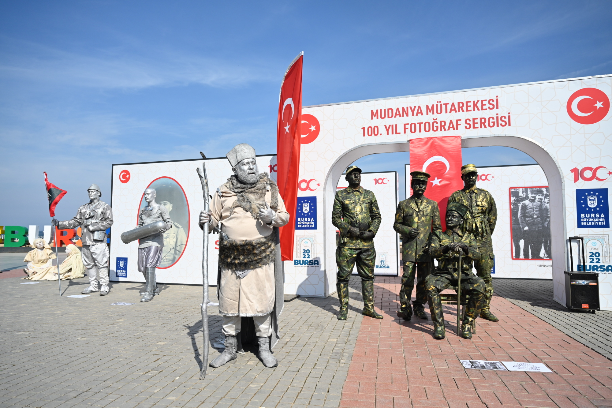Mudanya Mütarekesi’nin 100’üncü yılı, Mütareke Evi önündeki resmi törenlerin ardından, Büyükşehir Belediyesi tarafından düzenlenen ve gün boyu devam eden birbirinden farklı etkinlikle kutlandı. Mudanya sahili Türk bayraklarıyla donatılırken, Kültür ve Sosyal İşler Daire Başkanlığı tarafından BUDO iskelesi önünde ‘Mütarekenin 100. Yılı Fotoğraf Sergisi’ açıldı. Mudanya Mütareke Evi’nde gerçekleştirilen barış görüşmelerini ve Cumhuriyetin ilk yıllarında tarihi bina önünde yapılan kutlama etkinliklerini konu alan görseller, Mudanyalılar tarafından ilgiyle izlendi. Büyükşehir Belediye Başkanı Alinur Aktaş, Mudanya Kaymakamı Ayhan Terzi ve Uludağ Üniversitesi Rektörü Prof.Dr. Ahmet Saim Kılavuz ile birlikte fotoğraf sergisini gezdi. Sergi alanında Sokak Sanatları Atölyesi’nin 15 kişilik ekiple yaptığı canlı heykel gösterisi, vatandaşlar tarafından ilgiyle izlendi. Vatandaşlar canlı heykellerle hatıra fotoğrafı çektirmek için adeta sıraya girerken, saat başı yapılan canlı performanslarla Mudanya Mütarekesi anlatıldı.