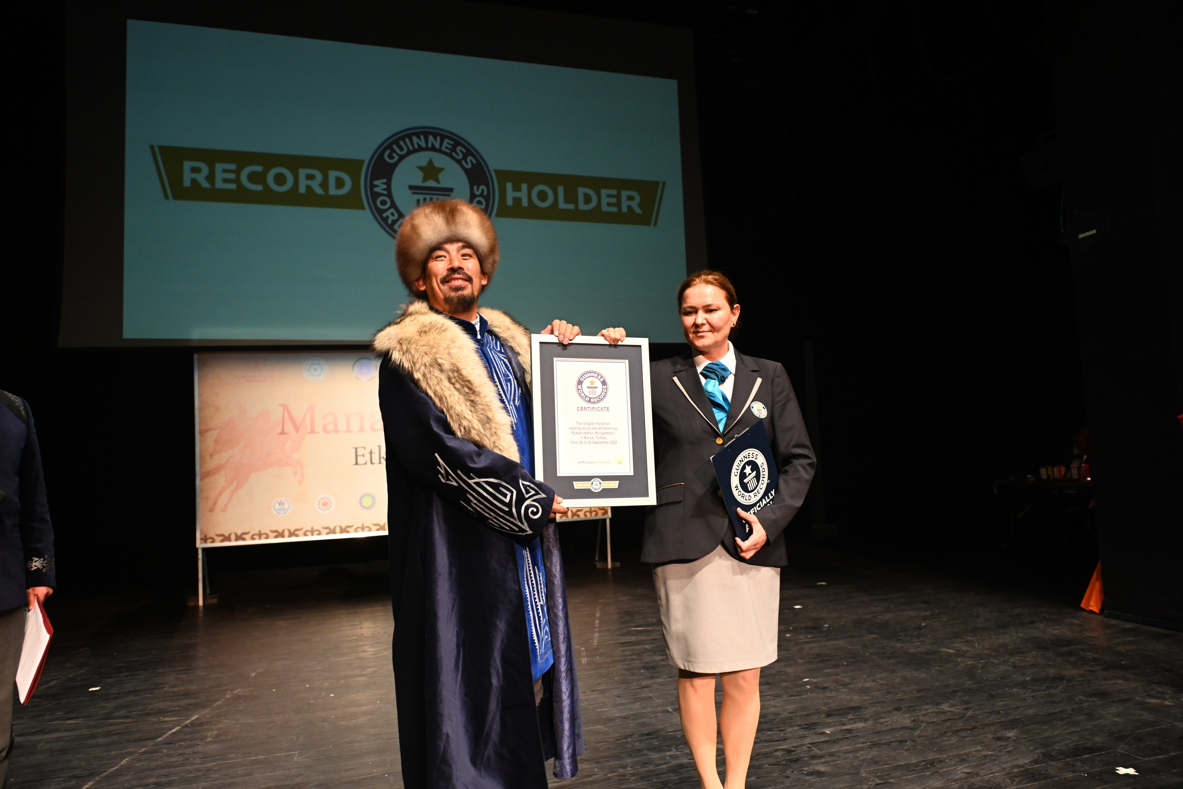 Tayyare Kültür Merkezi’nde düzenlenen Manas Haftası etkinliklerinin kapanış töreninde Kırgız Manasçı Rısbai İsakov, rekor sertifikasını Guinness Dünya Rekorları Türkiye Temsilcisi Şeyda Subaşı Gemici’nin elinden aldı. Törene Bursa Büyükşehir Belediye Başkanı Alinur Aktaş, Uluslararası Türk Kültürü Teşkilatı Genel Sekreteri Sultan Raev, Kırgız Cumhuriyeti Devlet Sekreteri Süyünbek Kasmambetovun, Bursa İl Kültür ve Turizm Müdürü Kamil Özer, Kırgız ve Türk davetiler katıldı.