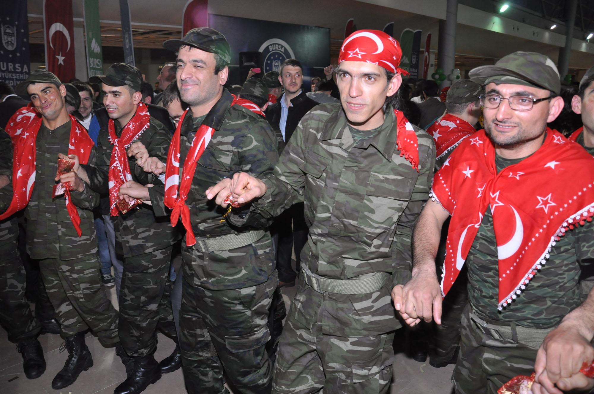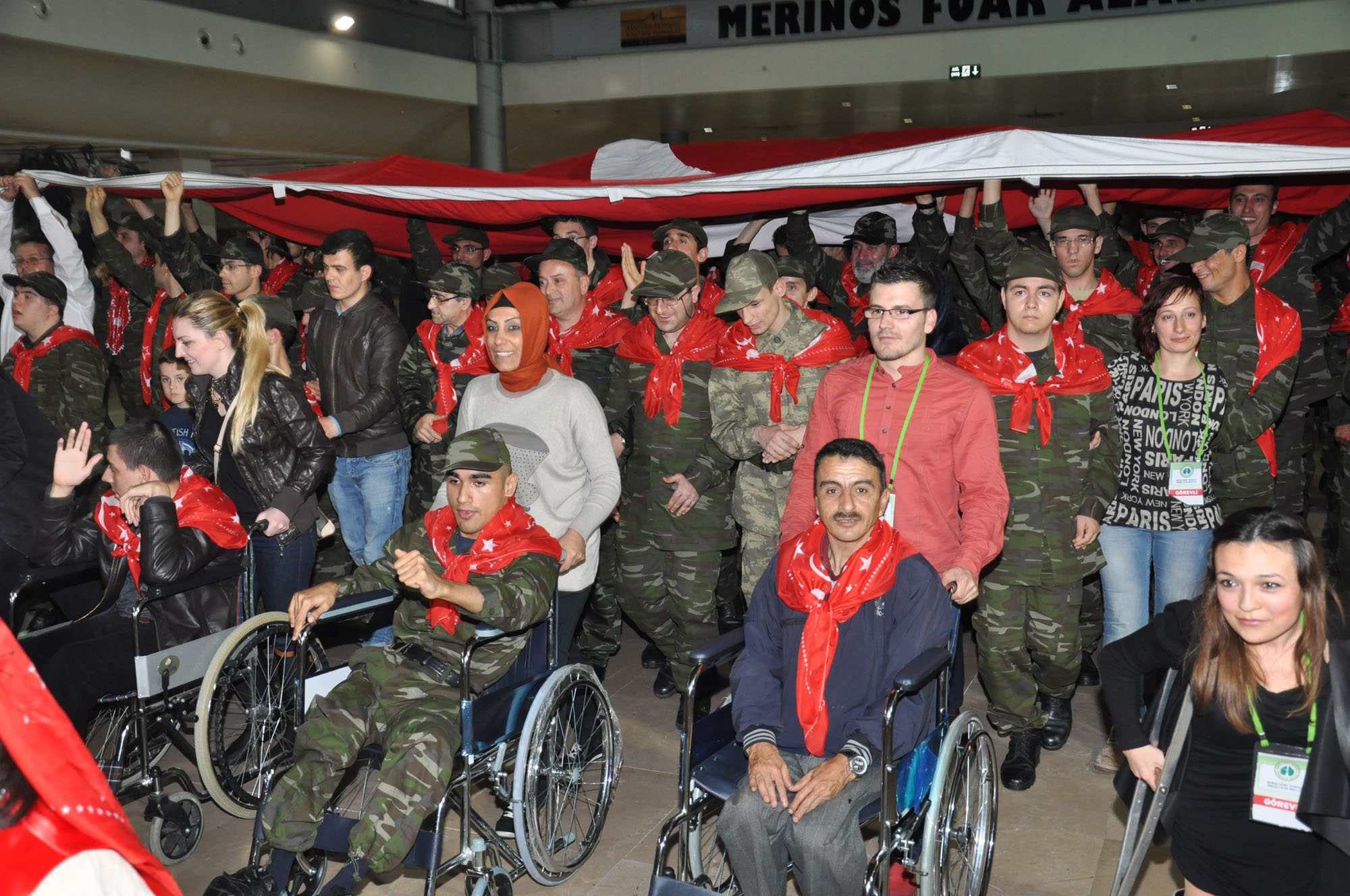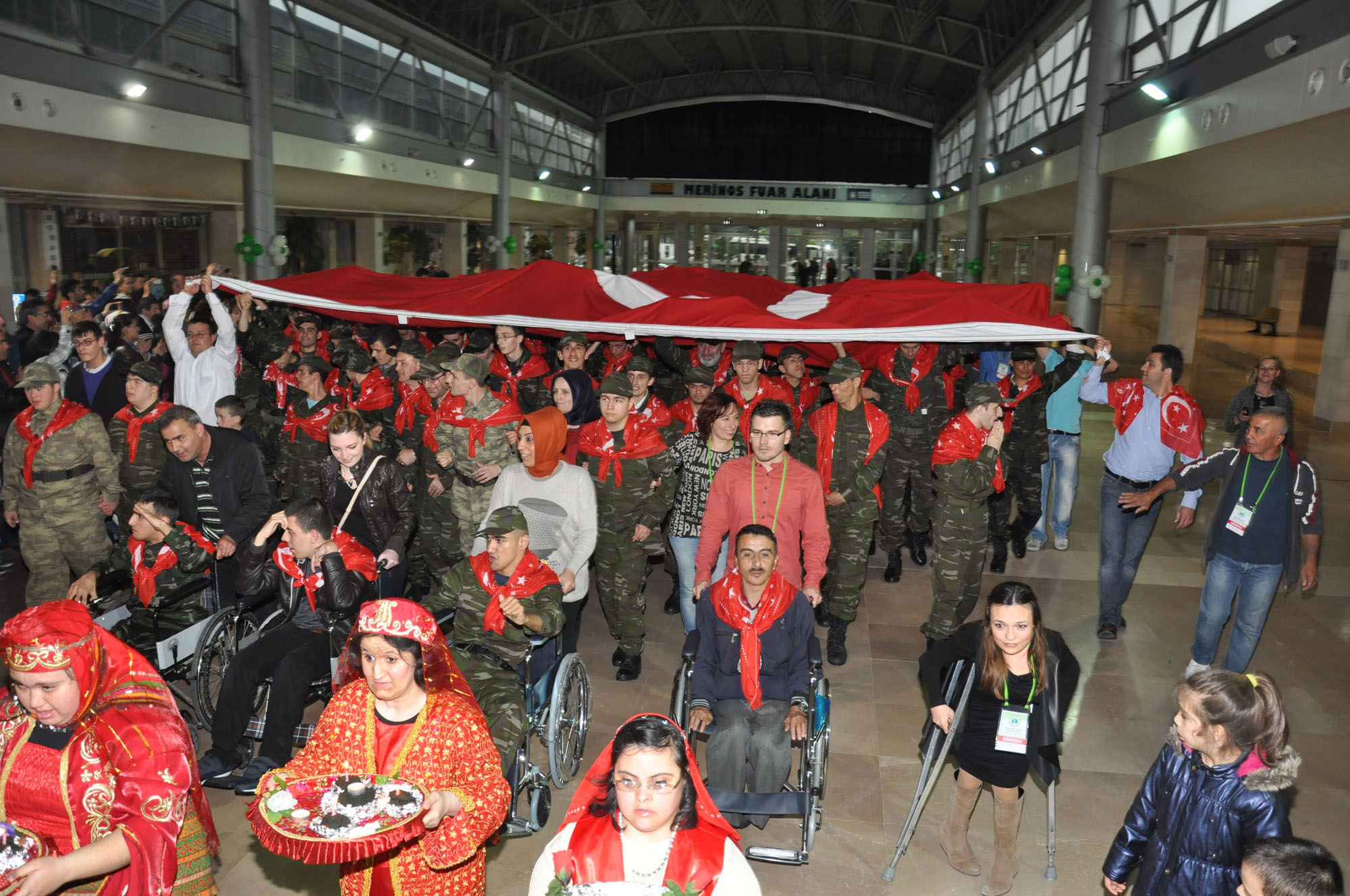 130 engelli asker adayı, Merinos AKKM Fuar Alanı’na dev Türk Bayrağı’nın altında geldi. Türk bayrağı işlemeli yazmaları boyunlarına takan engelli gençler, ailelerin ‘En büyük asker, bizim asker’ sloganları eşliğinde karşılandı. Ellerine kınalar yakılan engelli gençler, daha sonra aileleriyle beraber davul zurna eşliğinde doyasıya eğlendi.