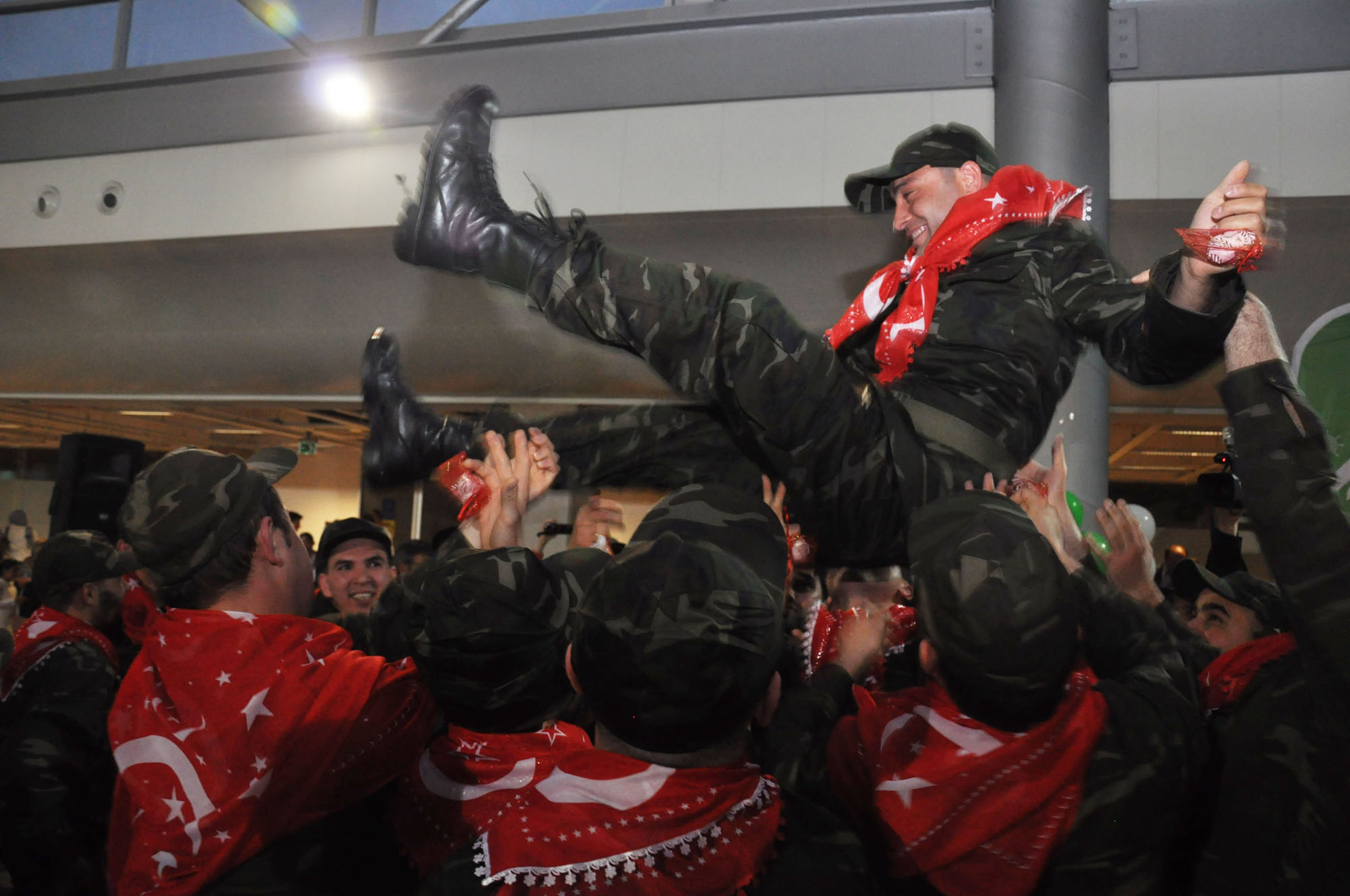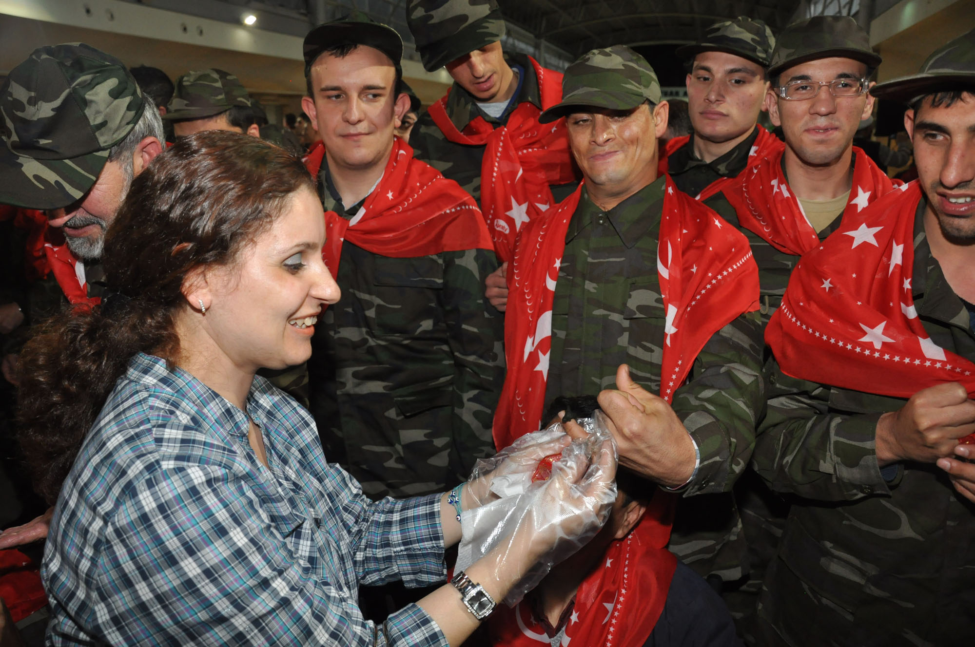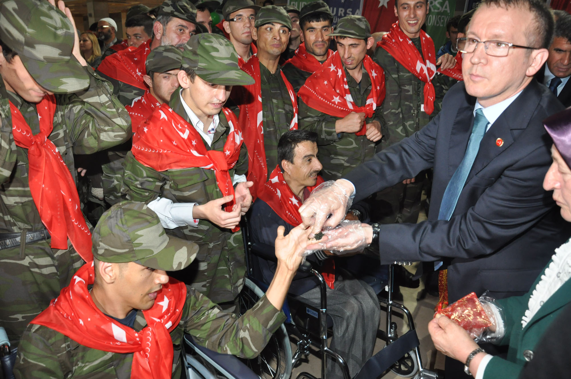 130 engelli asker adayı, Merinos AKKM Fuar Alanı’na dev Türk Bayrağı’nın altında geldi. Türk bayrağı işlemeli yazmaları boyunlarına takan engelli gençler, ailelerin ‘En büyük asker, bizim asker’ sloganları eşliğinde karşılandı. Ellerine kınalar yakılan engelli gençler, daha sonra aileleriyle beraber davul zurna eşliğinde doyasıya eğlendi.
