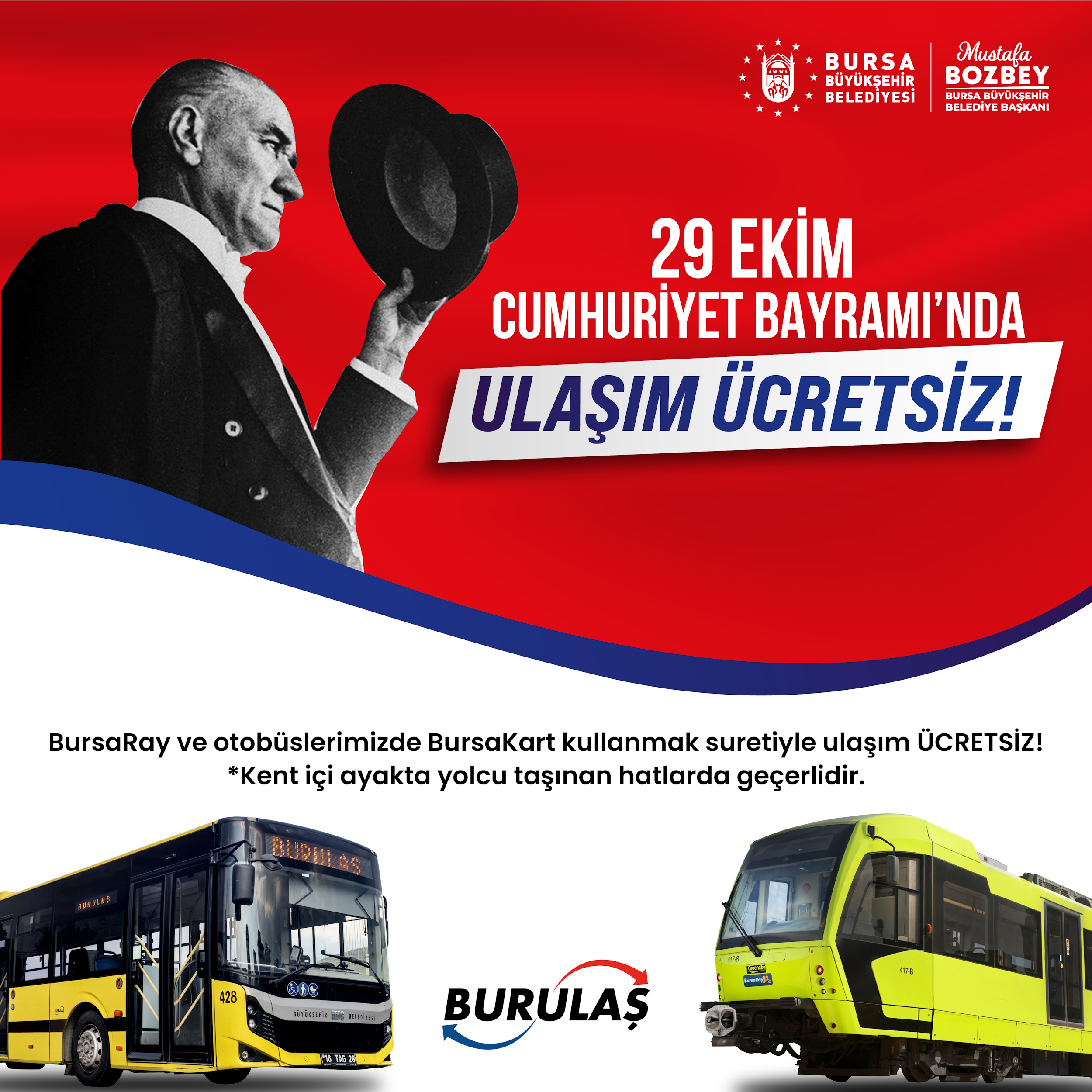 Bursa Büyükşehir Belediyesi, Cumhuriyet Bayramı kutlama ve etkinliklerinin coşkulu kalabalıklarla yapılabilmesi için BursaRay, tramvay hatları ve otobüslerde 29 Ekim Salı günü ulaşımın ücretsiz olacağını açıkladı. Ücretsiz uygulamadan yararlanmak için vatandaşların Bursakart’larını kullanmaları gerekirken, uygulama kent içi yolcu taşınan hatlarda geçerli olacak.