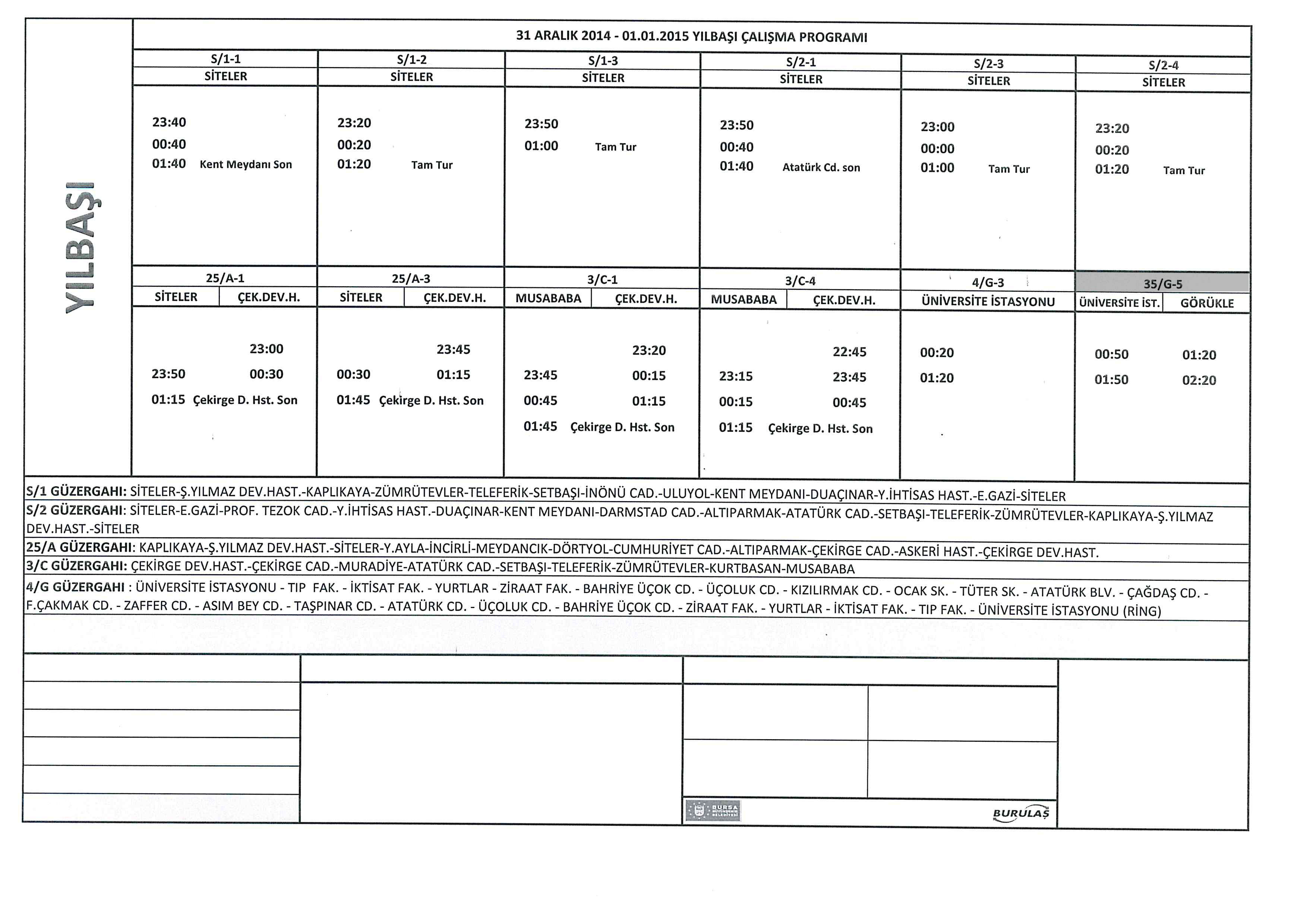 BURSA – BURULAŞ tarafından yapılan düzenlemeye göre, 31 Aralık – 1 Ocak tarihlerinde çalışacak otobüs seferleri ekli listedeki gibidir.