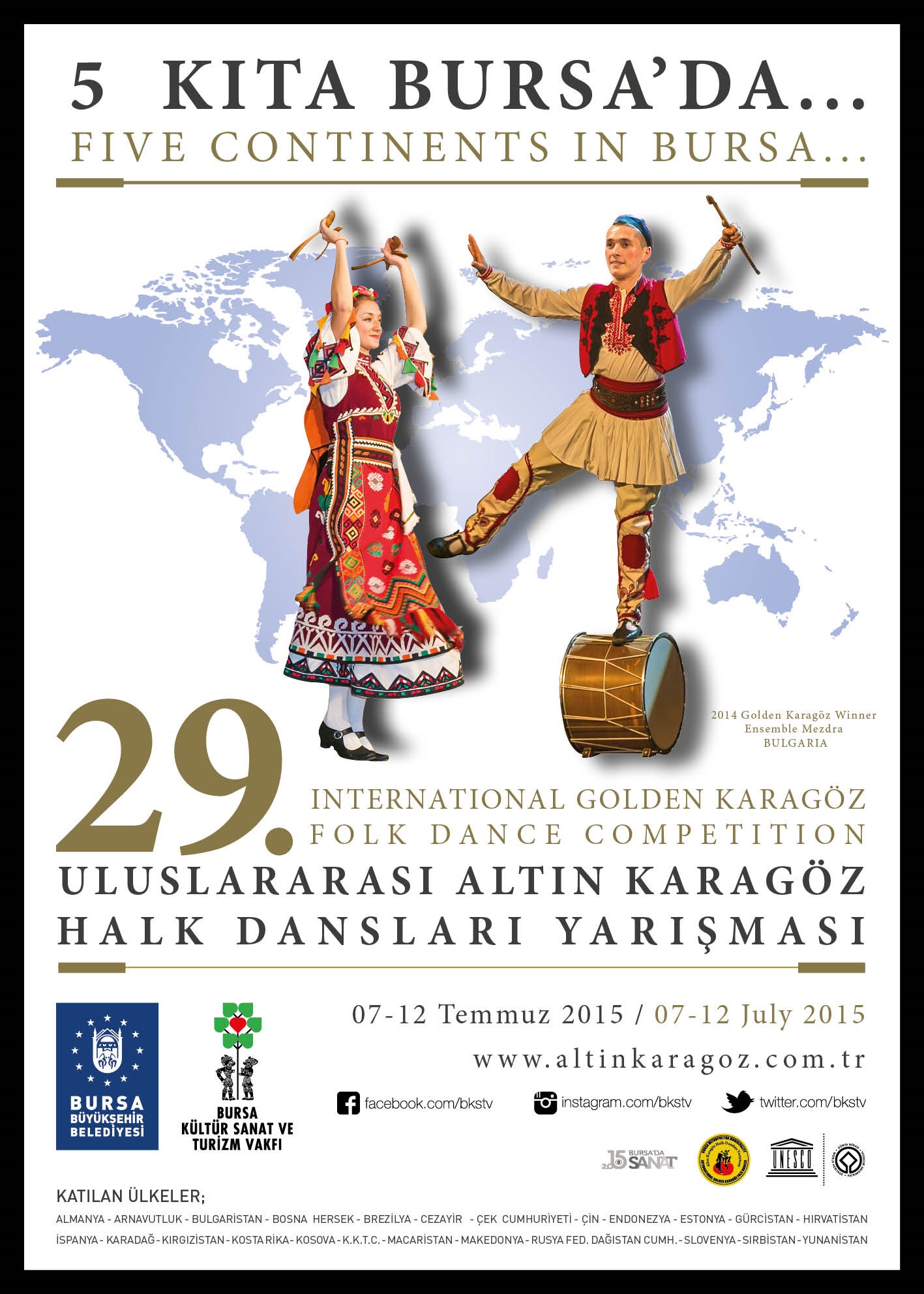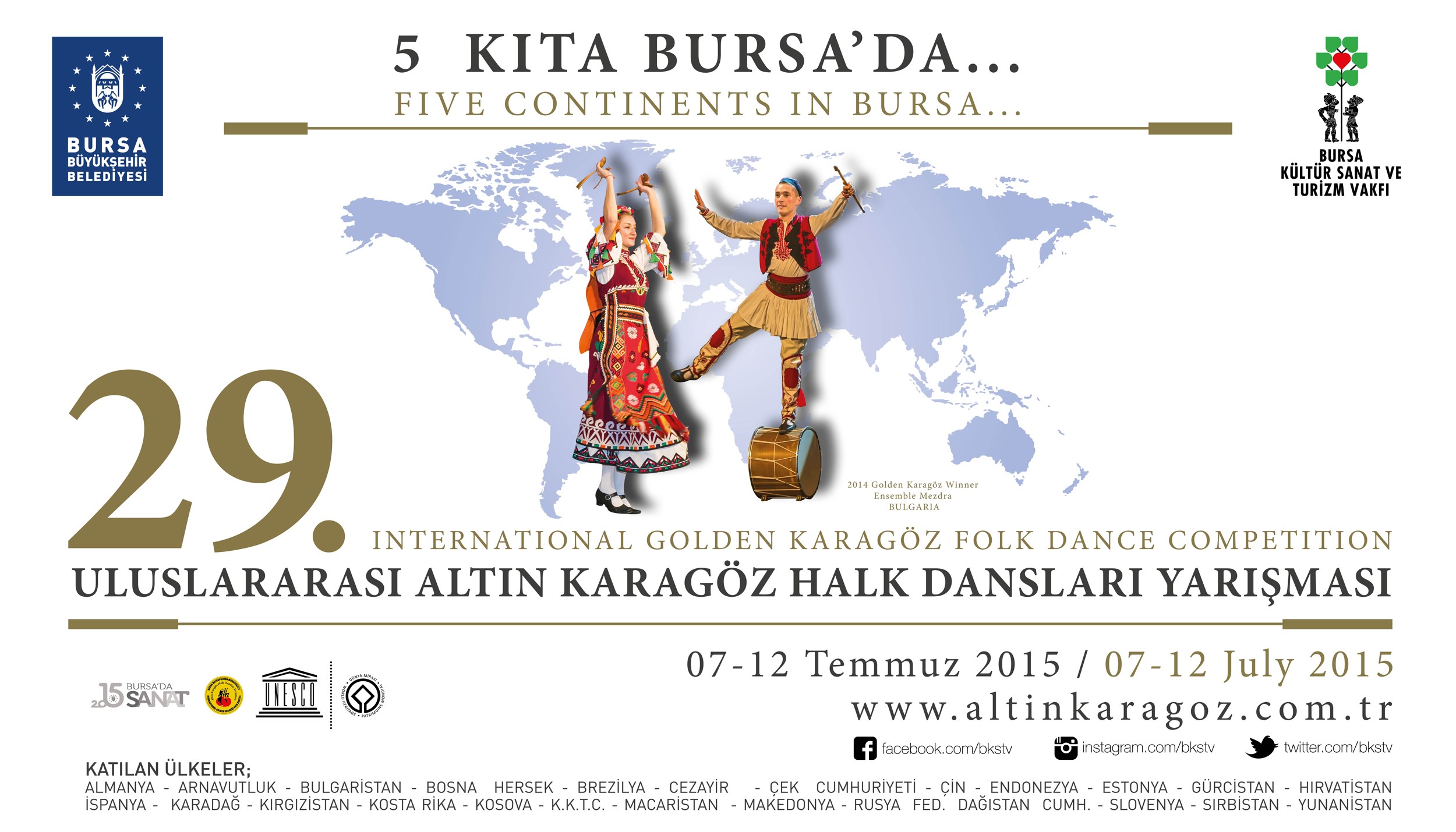 - Bu yıl, ‘5 Kıta Bursa’da’ temasıyla gerçekleştirilen ‘29. Uluslararası Bursa Altın Karagöz Halk Dansları Yarışması’, 7 Temmuz Salı günü saat 22.00’da Kültürpark Açıkhava Tiyatrosu’nda yapılacak açılış programıyla başlayacak.