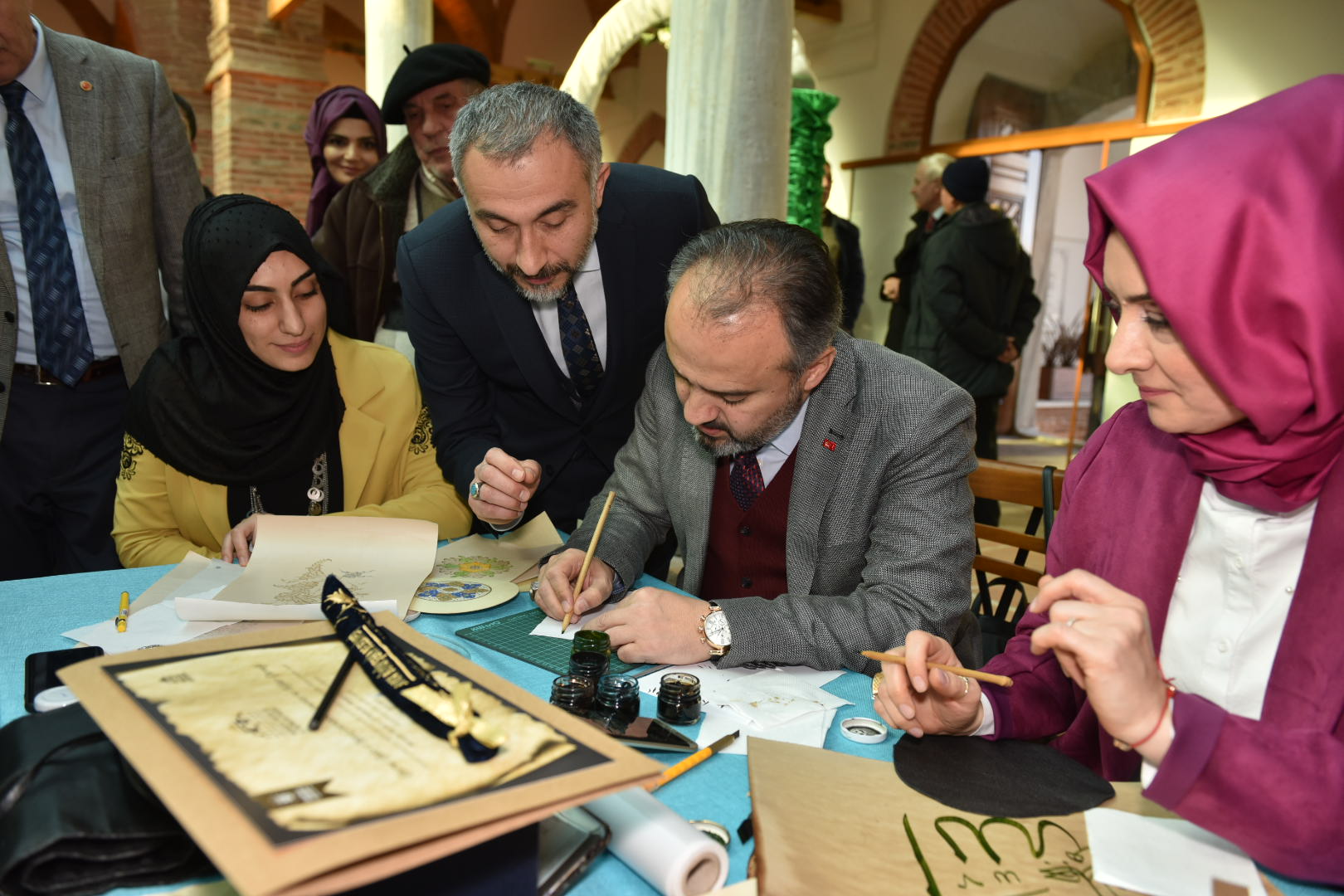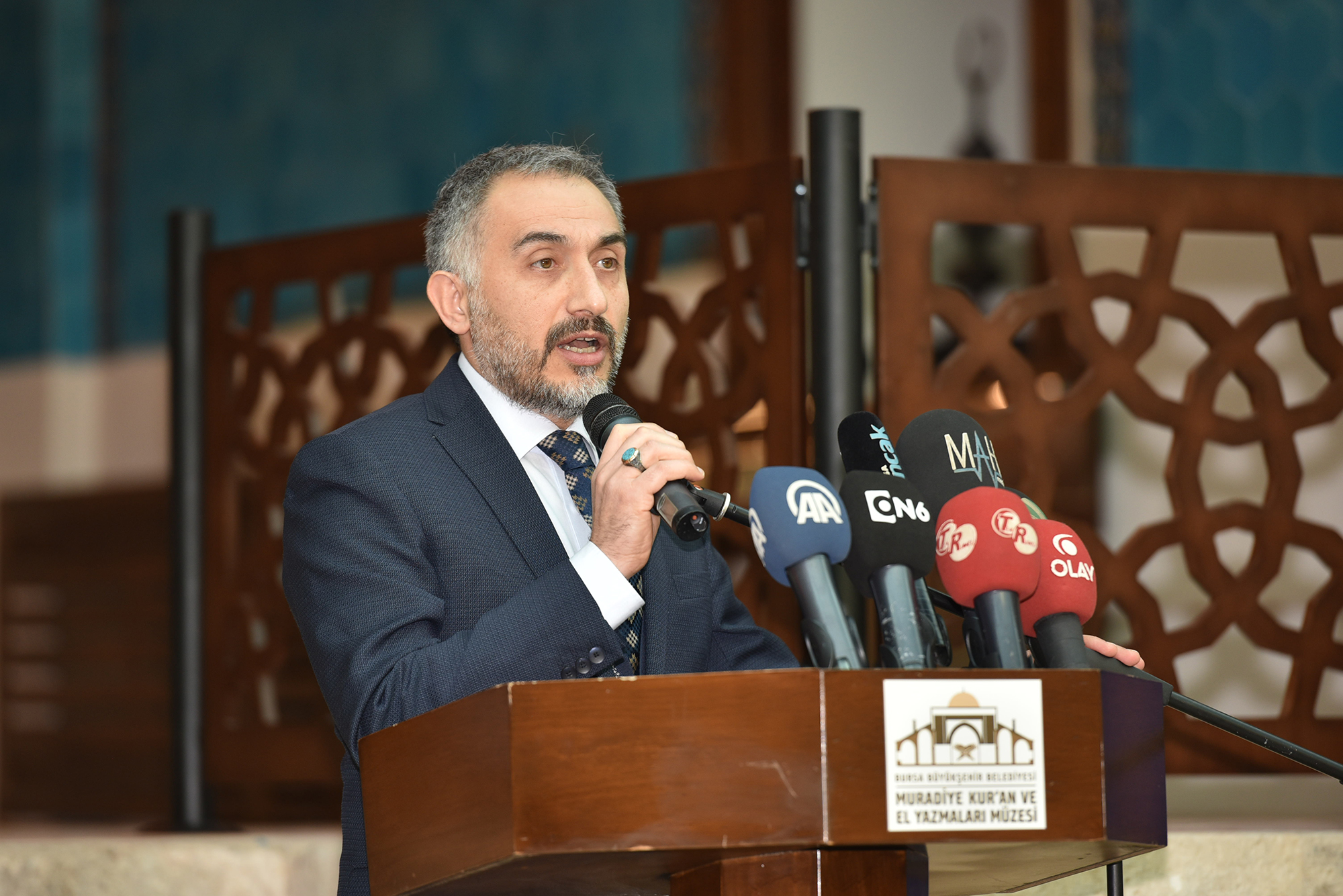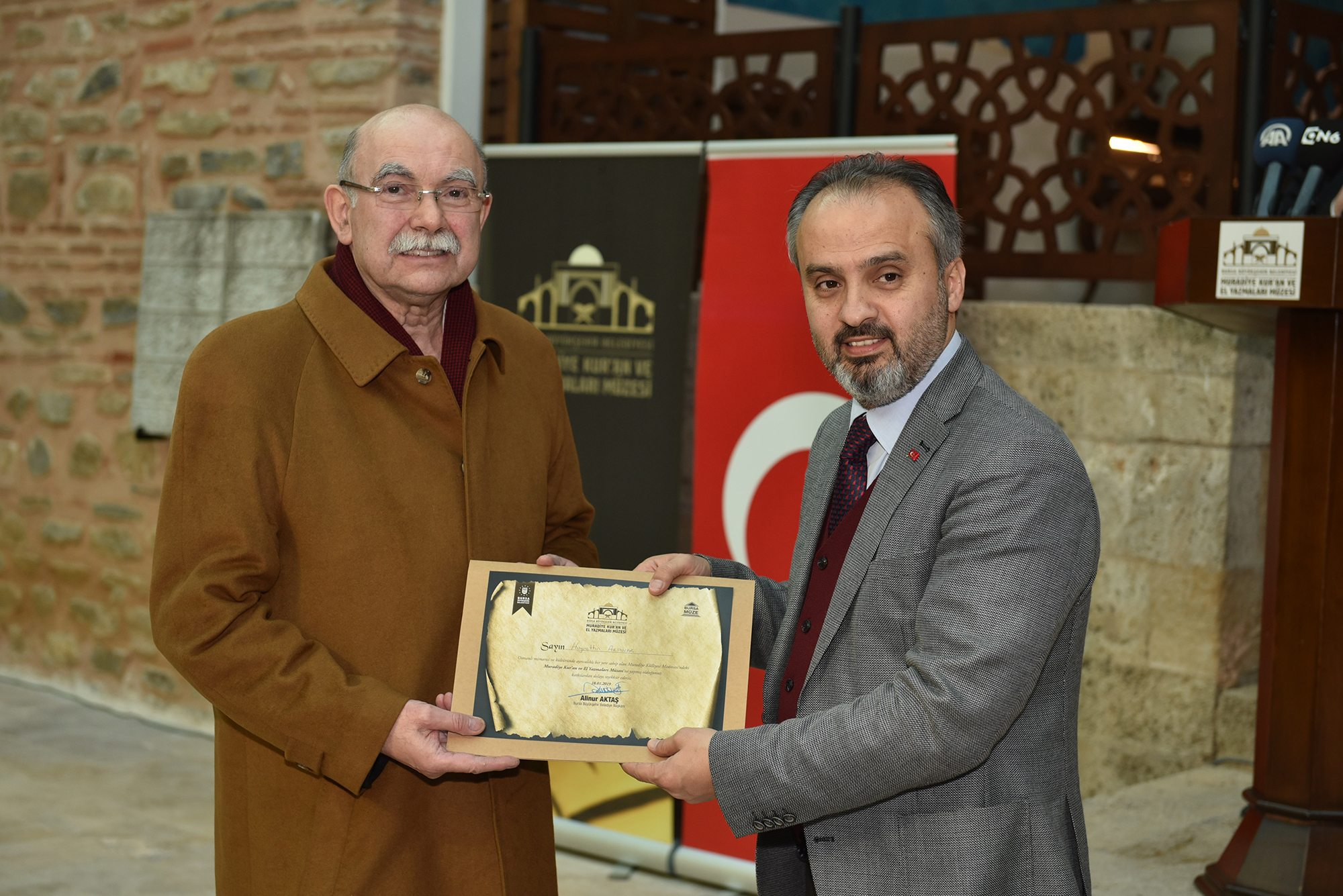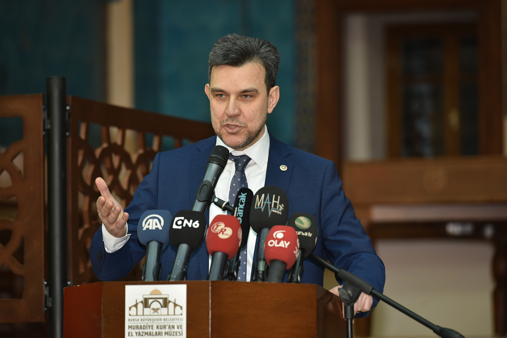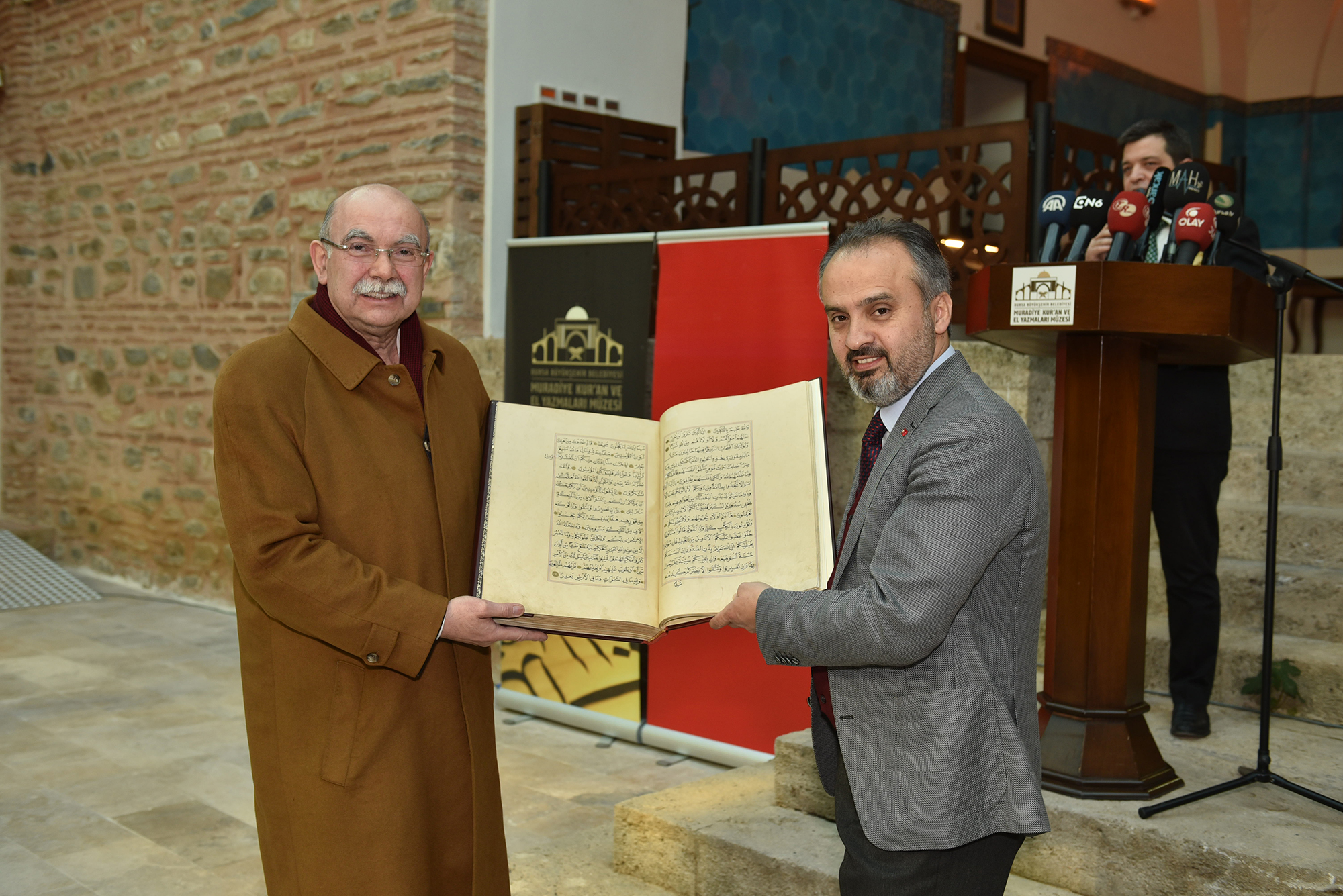 Bursa’ya kazandırdıkları Muradiye Kur’ân ve El Yazmaları Müzesi’nin, konusu itibari ile Türkiye’de bu anlamda önemli örnekler arasında yerini alacağına inandığını vurgulayan Başkan Aktaş, “Müzemizde 10 medrese odasında Kur’ân-ı Kerim’in ilk nazil olduğu zamandan günümüze Kur’ân’ın yazılışındaki aşamalar, hat sanatının gelişimiyle birlikte kronolojik olarak izlenebilecek. Ana eyvanda ise 18. yüzyıldan kalan Sultan Murad Hüdâvendigâr sanduka örtüsü ve Bursa’da medfun olan diğer sultan isimlerinin yazılı olduğu sanduka levhaları sergileniyor. Müzede ayrıca; geleneksel Türk-İslam sanatlarının unutulmaya yüz tutmuş alanlarını yaşatmak adına hat, tezhip, minyatür, cilt sanatına ilişkin atölye çalışmaları gerçekleştirilecek ve yeni hattatların, müzehheplerin, mücellitlerin, ebru ve minyatür sanatçılarının yetişmesine imkân sağlanacak. Bursa olmak üzere Türkiye’nin çeşitli illerinden bağışta bulunarak müzemizi zenginleştiren bütün üstatlarımıza, müze danışmanımıza ve emeği geçen herkese teşekkür ederim” diye konuştu.