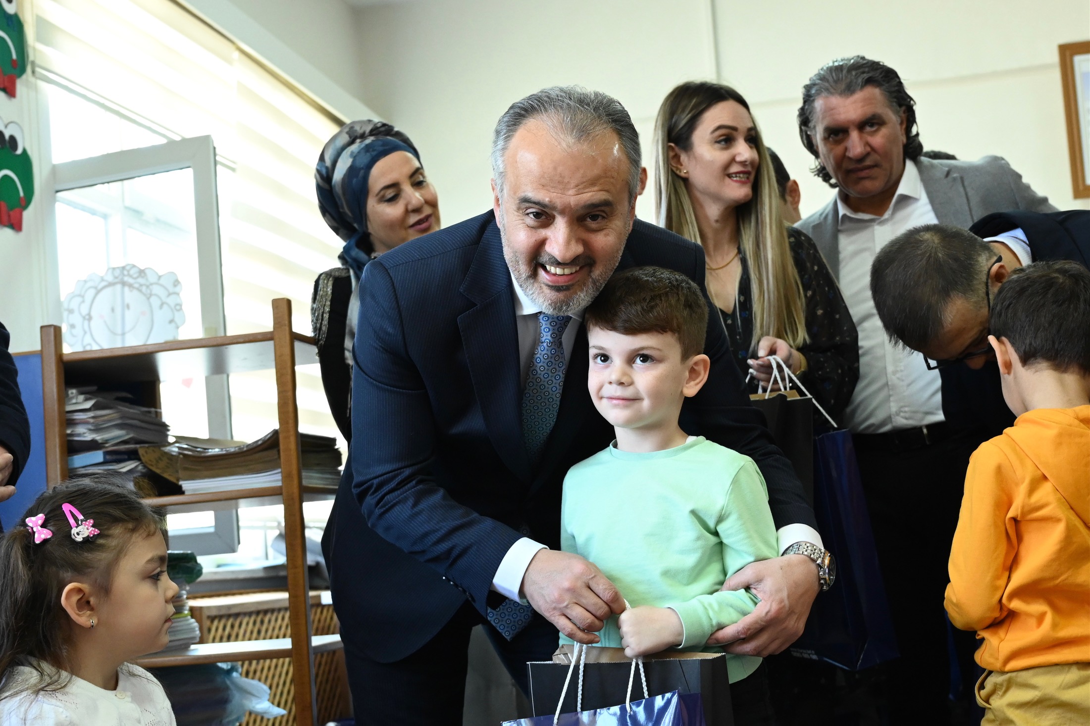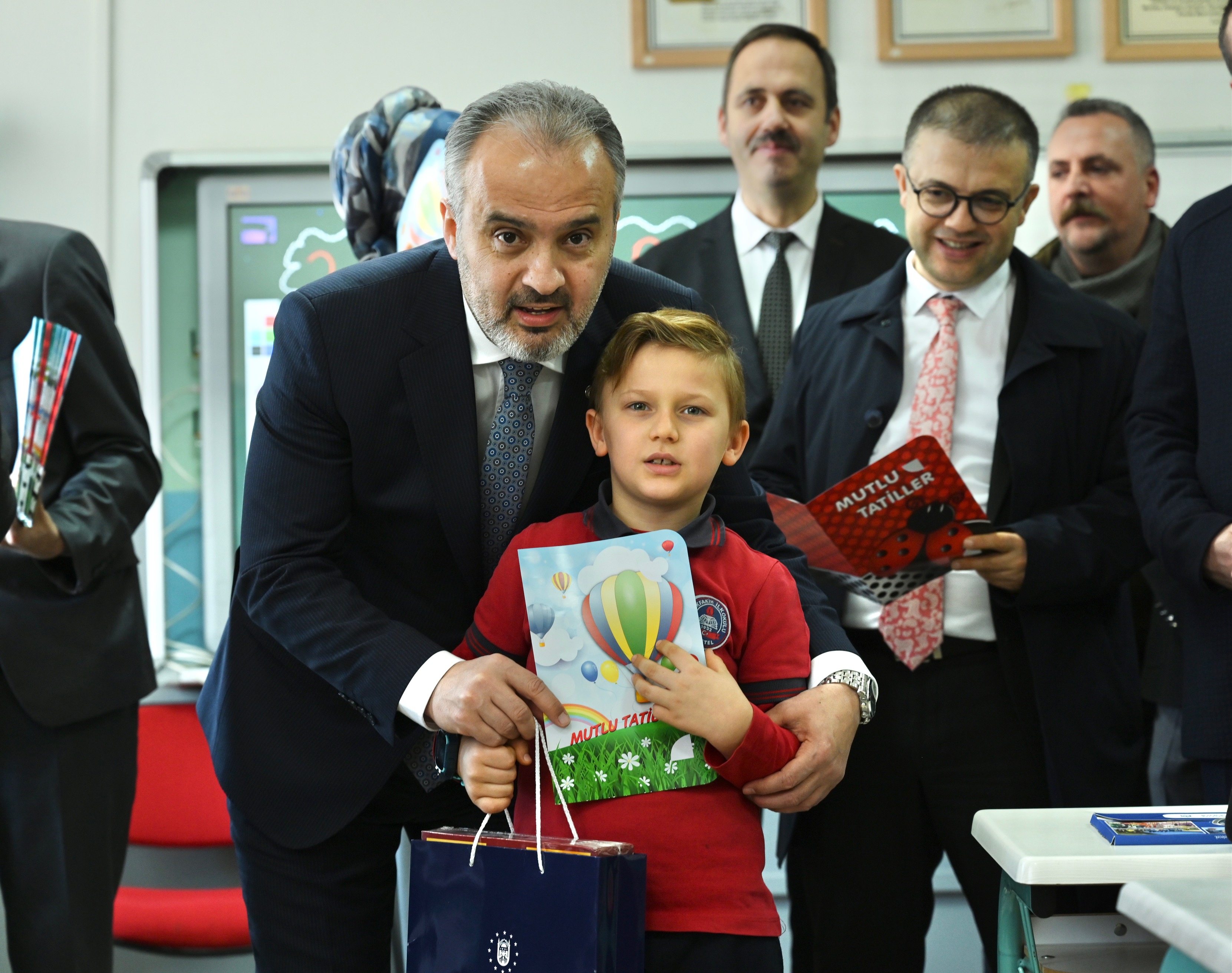 Bursa’da yaklaşık 660 bin öğrenci ve 42 bin öğretmen karnelerin dağıtılmasıyla 15 günlük tatile çıkmış oldu. İlk dönemin son gününde Kestel İlçesi Barakfakih Köyü Okulu’nda düzenlenen törende öğrencilerin karne heyecanına Bursa Büyükşehir Belediye Başkanı Alinur Aktaş, Kestel Kaymakamı Recep Öztürk, İl Milli Eğitim Müdürü Serkan Gür ve Kestel Belediye Başkanı Önder Tanır da ortak oldu. Sohbet ettiği öğrencilere daha sonra karnelerini veren Büyükşehir Belediye Başkanı Alinur Aktaş, velilere karnedeki notlar ne olursa olsun çocuklarının yanlarında olmaları tavsiyesinde bulundu. Çocukların karne sevincine ortak olmak istediklerini ifade eden Başkan Aktaş, “Çocuklarımıza karneleri ile beraber güzel vakit geçirecekleri hediyeler sunduk. Yavrularımız bizim geleceğimiz. Ulaşımdan çevreye, spordan eğitime kadar yaptığımız tüm yatırımlar geleceğimiz olan evlatlarımız için. Daha iyi bir gelecek için canla başla çalışmaya devam edeceğiz. Ben bu vesileyle tekrar tüm çocuklarımıza iyi tatiller diliyorum, dinlensinler. Bu tatilden sonra çok daha iyi çalışacaklarına inanıyorum” dedi.