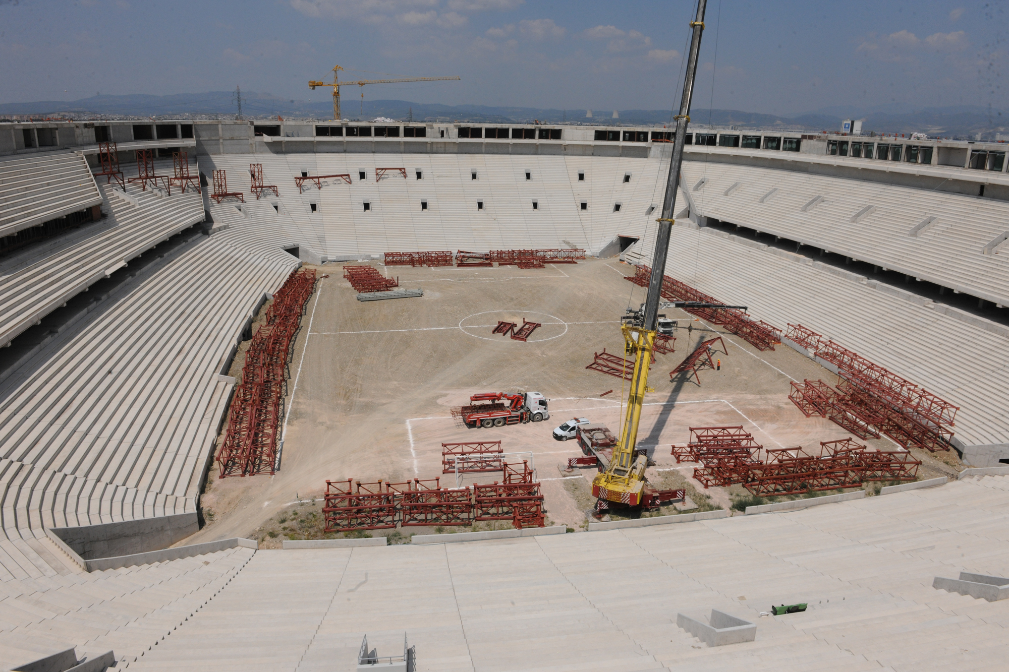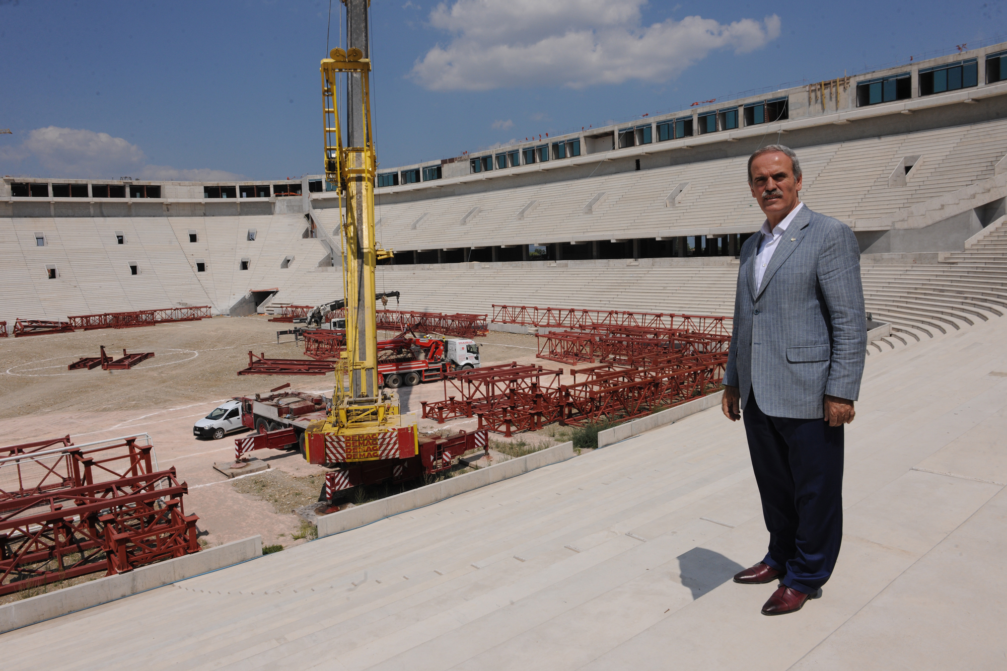 BURSA - Bursa Büyükşehir belediyesi tarafından bu dönem kente kazandırılan yeni stadyum, 7 bin ton ağırlığındaki çelik malzemenin halatlarla gerdirilmesini esas alan ‘germe membran’ sisteminin uygulandığı Türkiye’nin ilk stadyum oluyor. Büyükşehir Belediye Başkanı Recep Altepe, Çatı kaplamada kullanılacak 7 bin ton malzemenin 5 bin tonluk kısmının üretiminin tamamlanarak, montaja başlandığını belirterek, yılbaşına kadar inşaatı tamamlamayı hedeflediklerini söyledi.