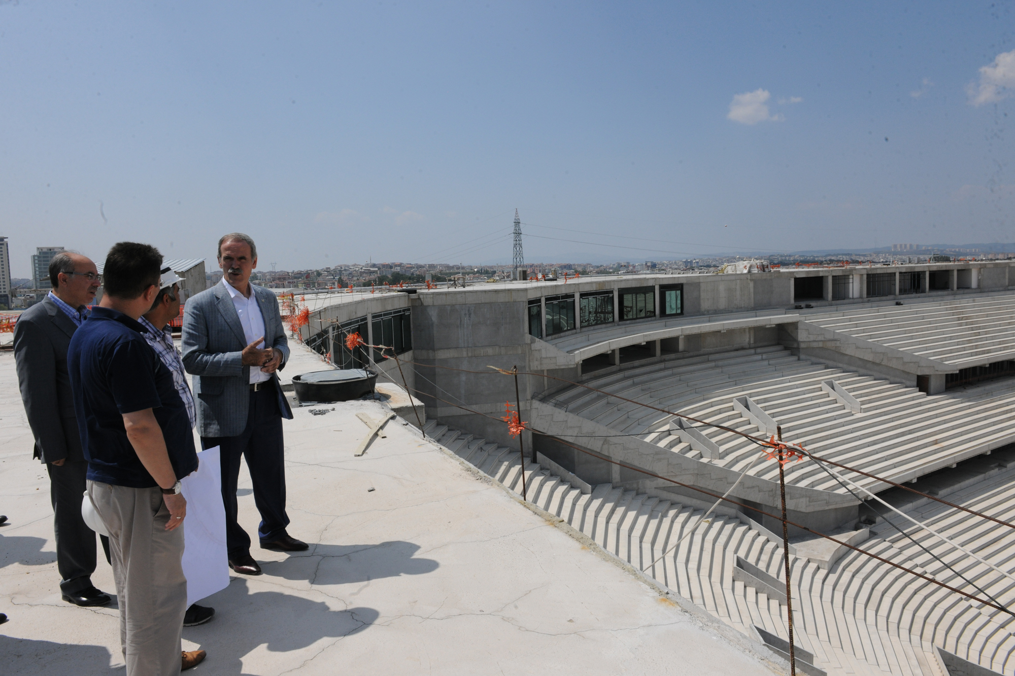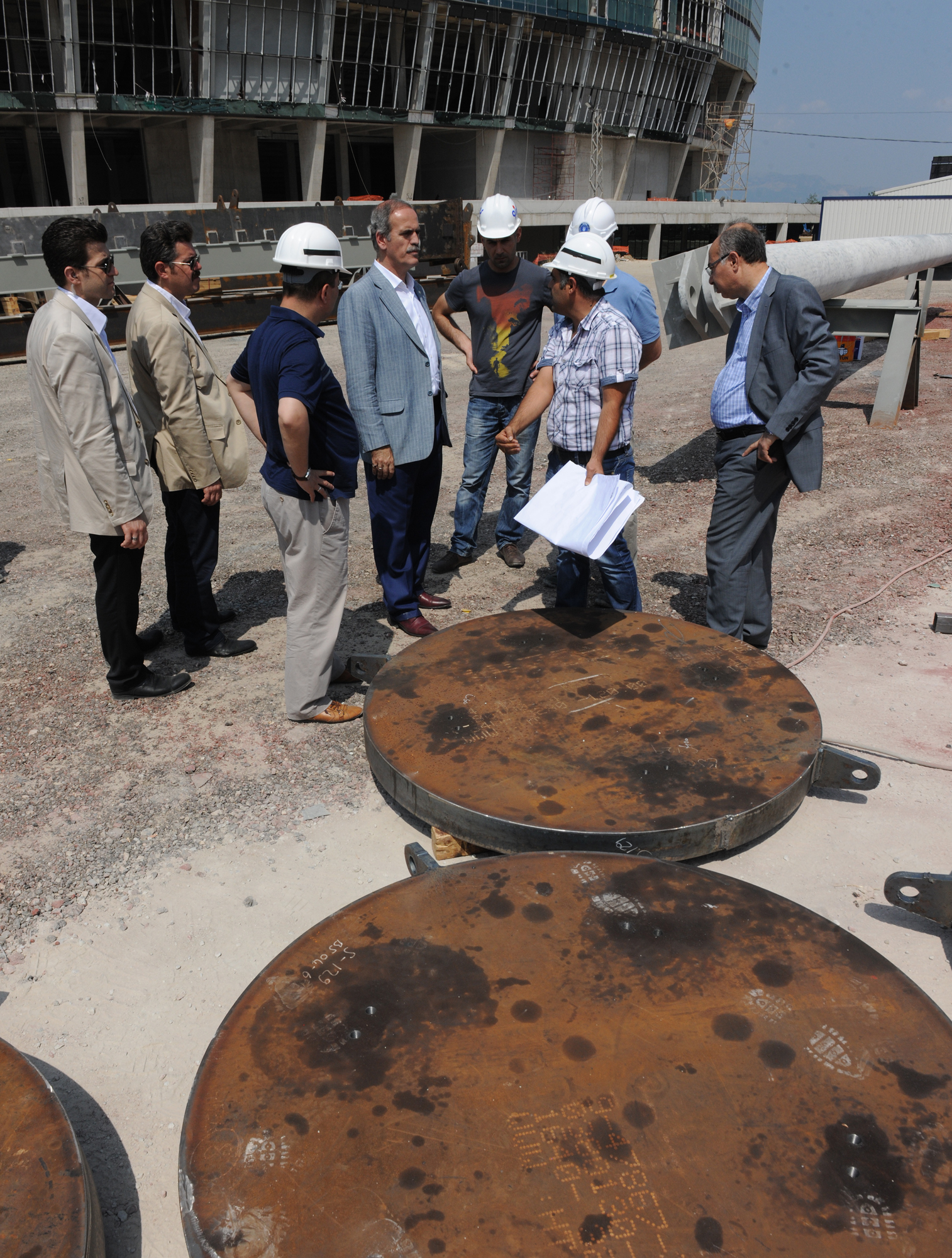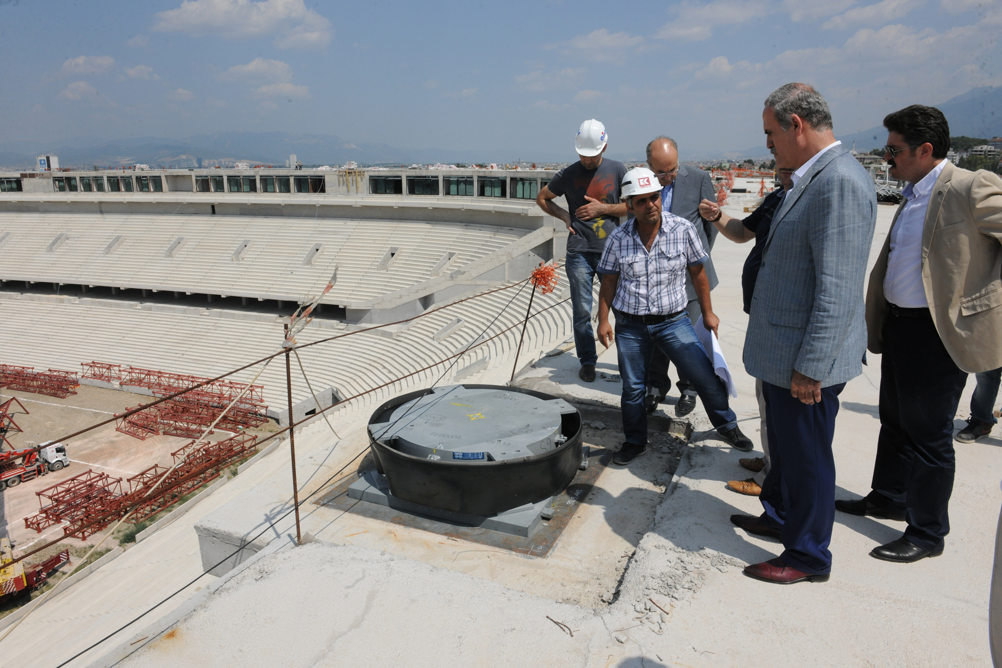 Büyükşehir Belediye Başkanı Recep Altepe, bu dönem Bursa’ya kazandırdıkları en büyük anıtsal yapı olan stadyum inşaatının tüm aşamalarını da yakından takip ediyor. Çatı montajına ilişkin çalışmaları da yerinde inceleyen Başkan Altepe, beraberindeki Genel Sekreter Seyfettin Avşar ve Genel Sekreter Yardımcısı Bayram Vardar ile birlikte yüklenici firmanın temsilcilerinden çalışmalar hakkında bilgi aldı. Kaba inşaatın bittiğini, ince işçiliklerle cephe kaplamanın da hızla devam ettiğini dile getiren Başkan Altepe, 2 ay içinde çelik çatı montajının, 2 ay içinde de teflon malzeme kaplamasının tamamlanacağını belirterek, yıl başına kadar inşaatı tamamlamayı hedeflediklerini kaydetti.