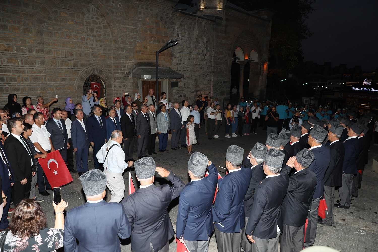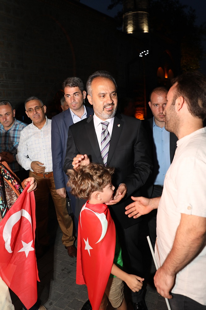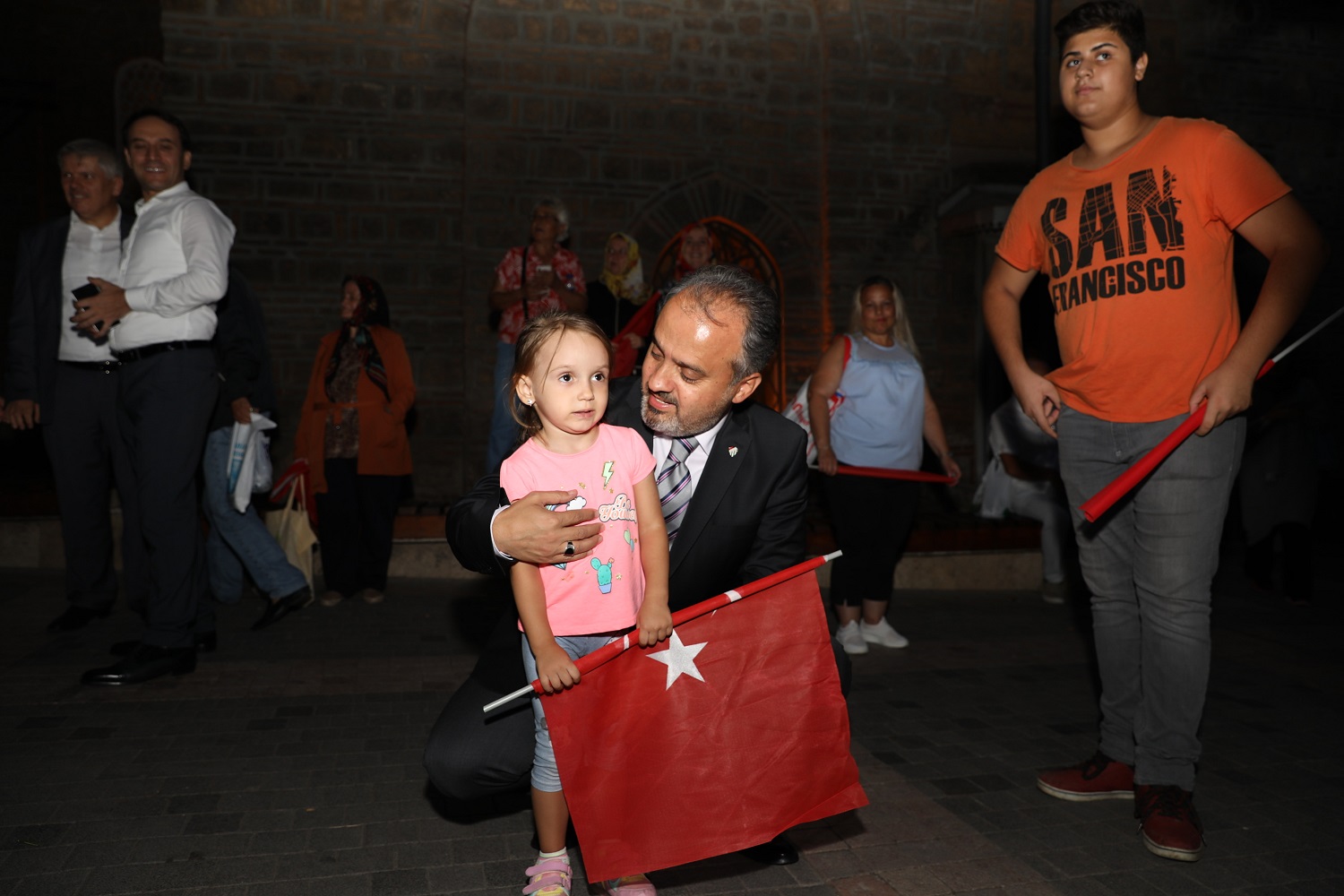 7’den 70’e tüm Bursalılar, ellerindeki Türk bayraklarıyla coşkuya ortak oldu. Bursa Tahtakıran Kılıç Kalkan ekibi gösterisiyle büyük beğeni topladı. Gecede, Türkiye Muharip Gaziler Derneği Bursa Şubesi üyeleri, şehrin kurtuluşunu temsili olarak canlandırdı. Türk bayrakları ile koşarak tarihi belediye binasının önüne gelen milis kuvvetleri, vatandaşlardan uzun süre alkış aldı. İstiklal Marşı'nın okunması sırasında tarihi belediye binasındaki Türk bayrağı, gaziler tarafından göndere çekildi. Daha sonra Orhangazi Camii'nden kurtuluş salası okundu.