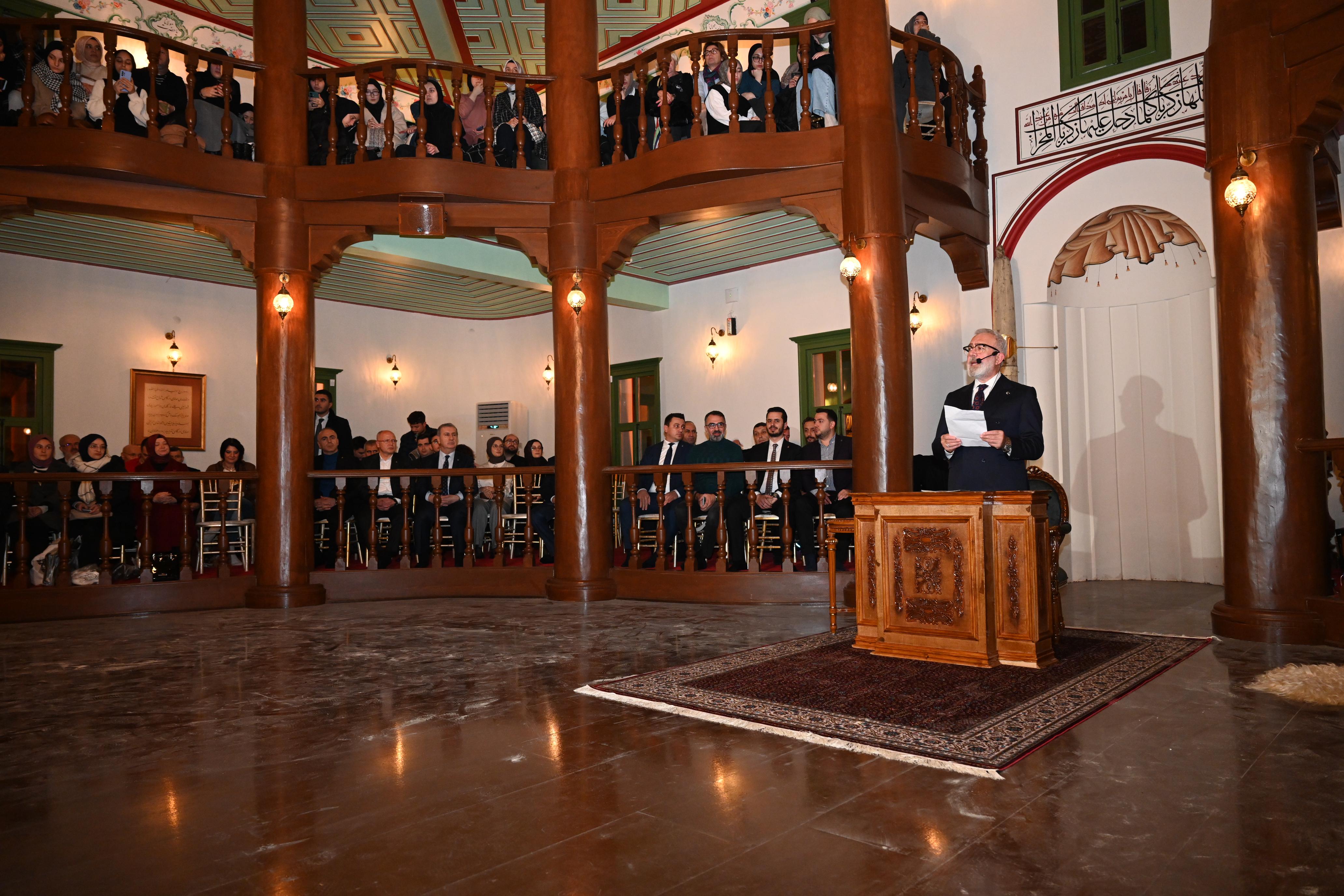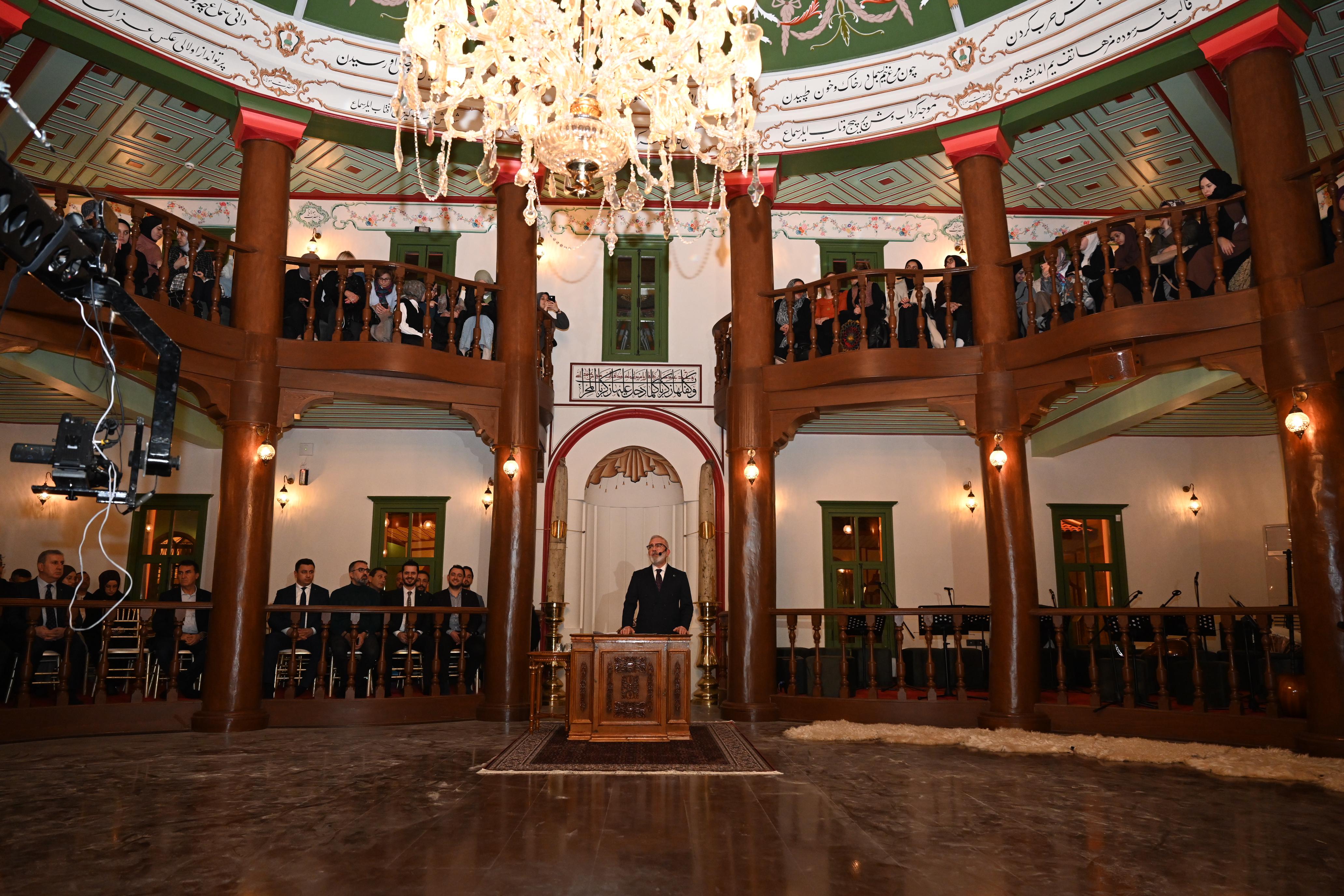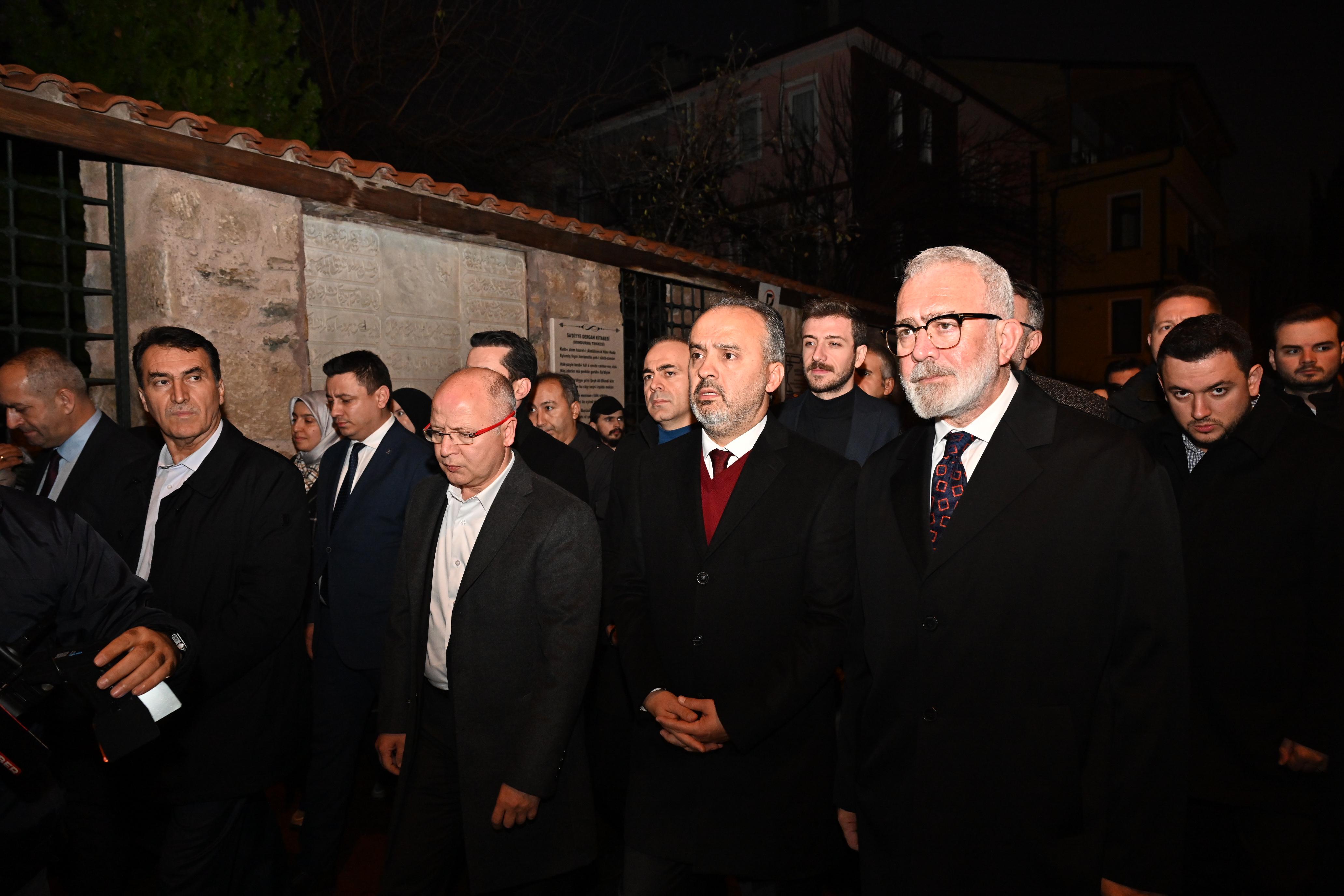 Bursa Mevlevihanesi’nin küllerinden doğuşunun coşkusunu birkaç ay önce yaşadıklarını hatırlatan Büyükşehir Belediye Başkanı Alinur Aktaş, Bursa’nın zamanla değişime uğramasına rağmen hala kuruluş devrinin rengini, dokusunu, havasını ve manzarasını sokaklarında saklayan bir Türk şehri olduğunu söyledi. Gizli hazineleri görünür kılmanın, yıpranan yapıları tamir etmenin, yıkılanları tekrar ayağa kaldırmanın bir vefa borcu olduğunu belirten Başkan Aktaş, “Ecdada ve tarihe hürmet kapsamında yaptığımız birçok çalışma var. Bunların arasında beni en çok heyecanlandıran ise Bursa Mevlevihanesi’ni 98 yıl sonra tekrar ayağa kaldırmak oldu. Hamdolsun ki 400 yıl önce Cünûnî Ahmed Dede tarafından yakılan çerağın ışığı bugün de çevremizi tenvir ediyor. Kültür ve Turizm Bakanı Mehmet Nuri Ersoy’un katılımıyla Bursa Mevlevihanesi’nin küllerinden doğuşunun coşkusunu birkaç ay önce hep birlikte yaşadık” dedi.
