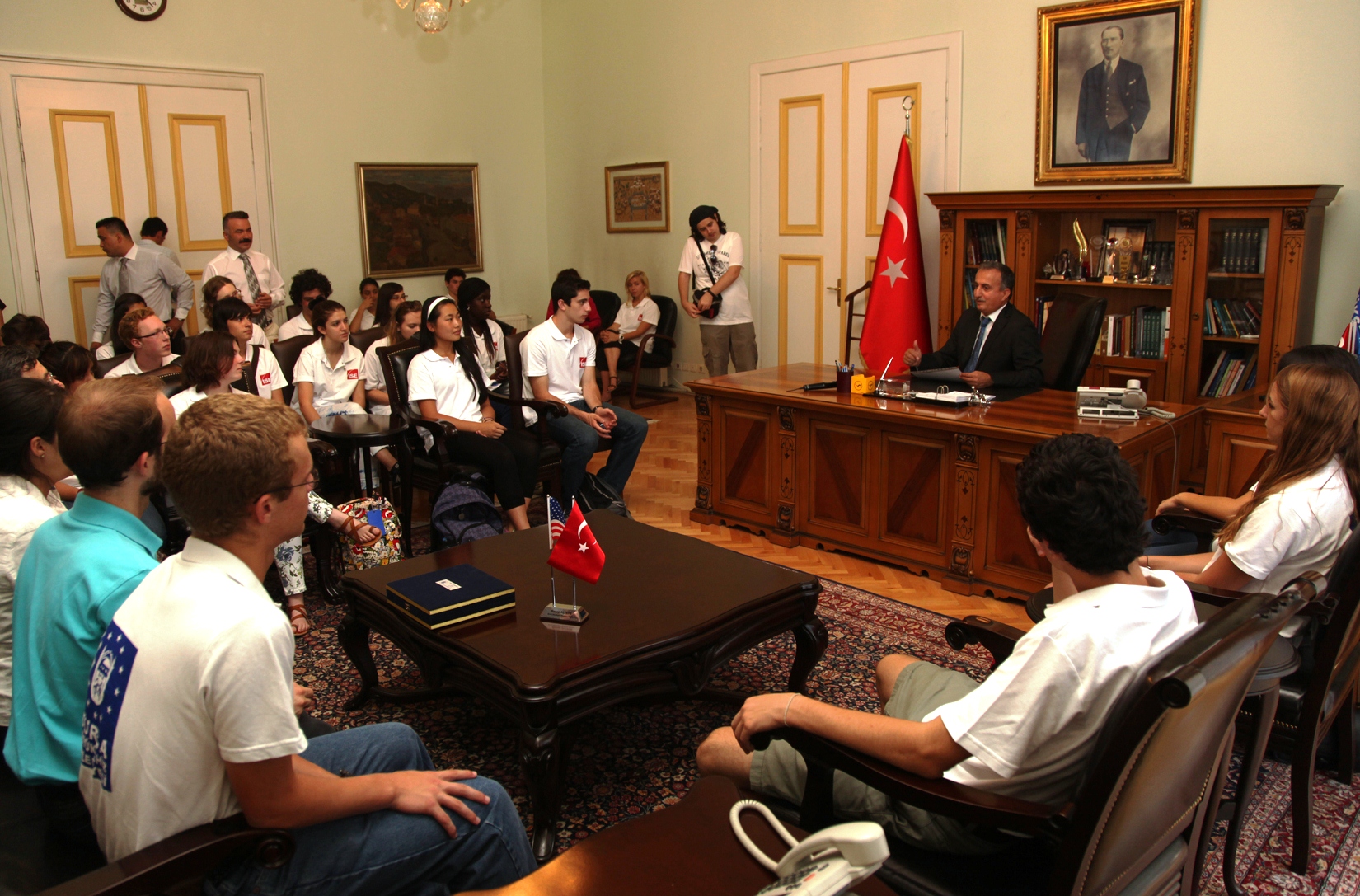 ABD’li öğrenciler, bugün de Türk öğrencilerle birlikte, programa destek veren Büyükşehir Belediyesi’ni ziyaret etti. Tarihi Belediye Binası’nda gerçekleştirilen ziyarette, öğrencileri, Büyükşehir Belediyesi Başkanvekili Abdullah Karadağ kabul etti. Başkanvekili Karadağ, konuşmasında dostluk mesajları vererek, “Çocuklarımızın mutlu oldukları yüzlerinden okunuyor. Dünyanın bu dostluğa, sıcaklığa, gönül gönüle olmaya ihtiyacı var. Bizler de güler yüzlü insanların sayısı çoğalsın istiyoruz. Gençlerimiz geleceğe umut veriyor” diye konuştu.