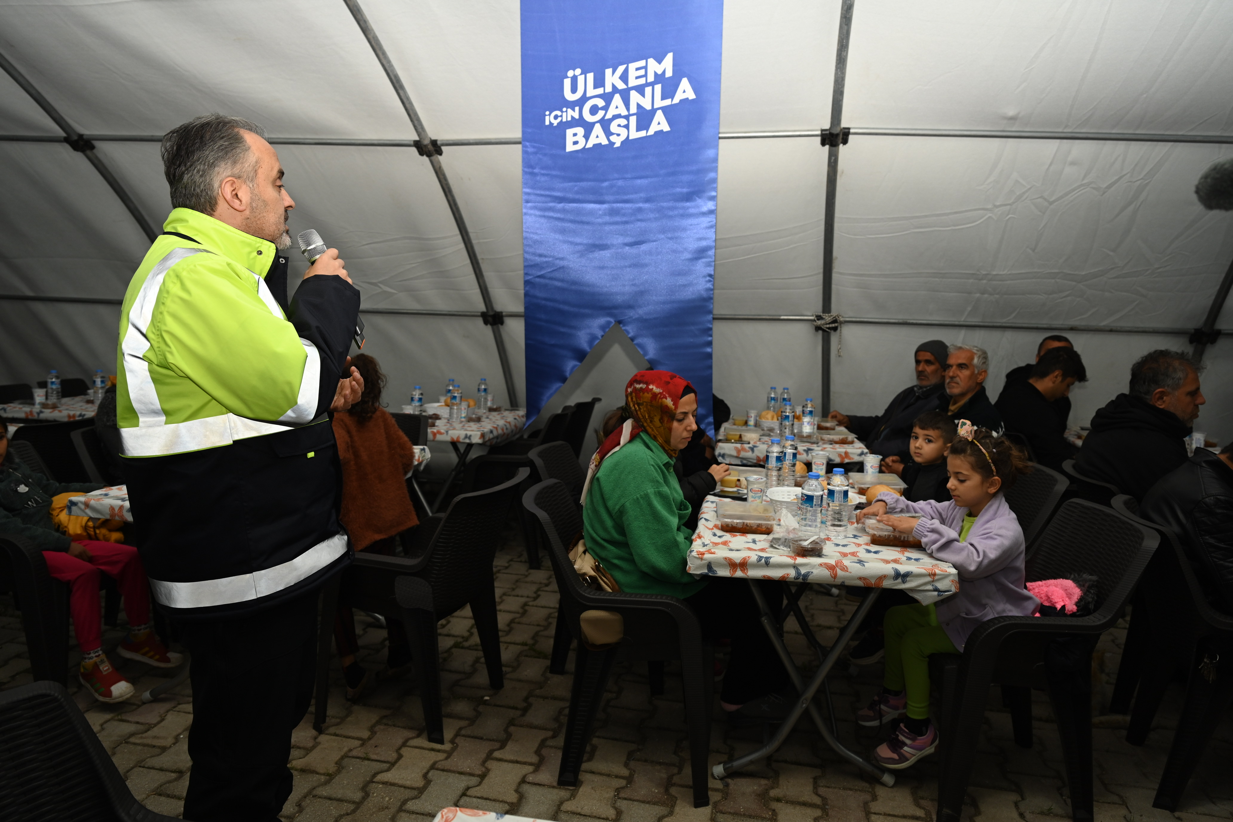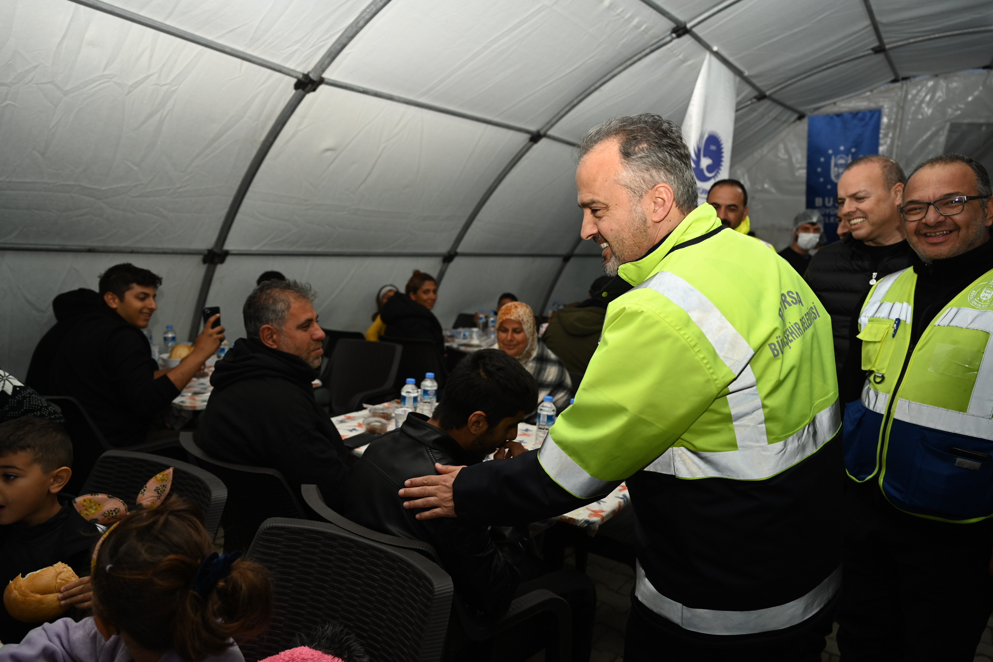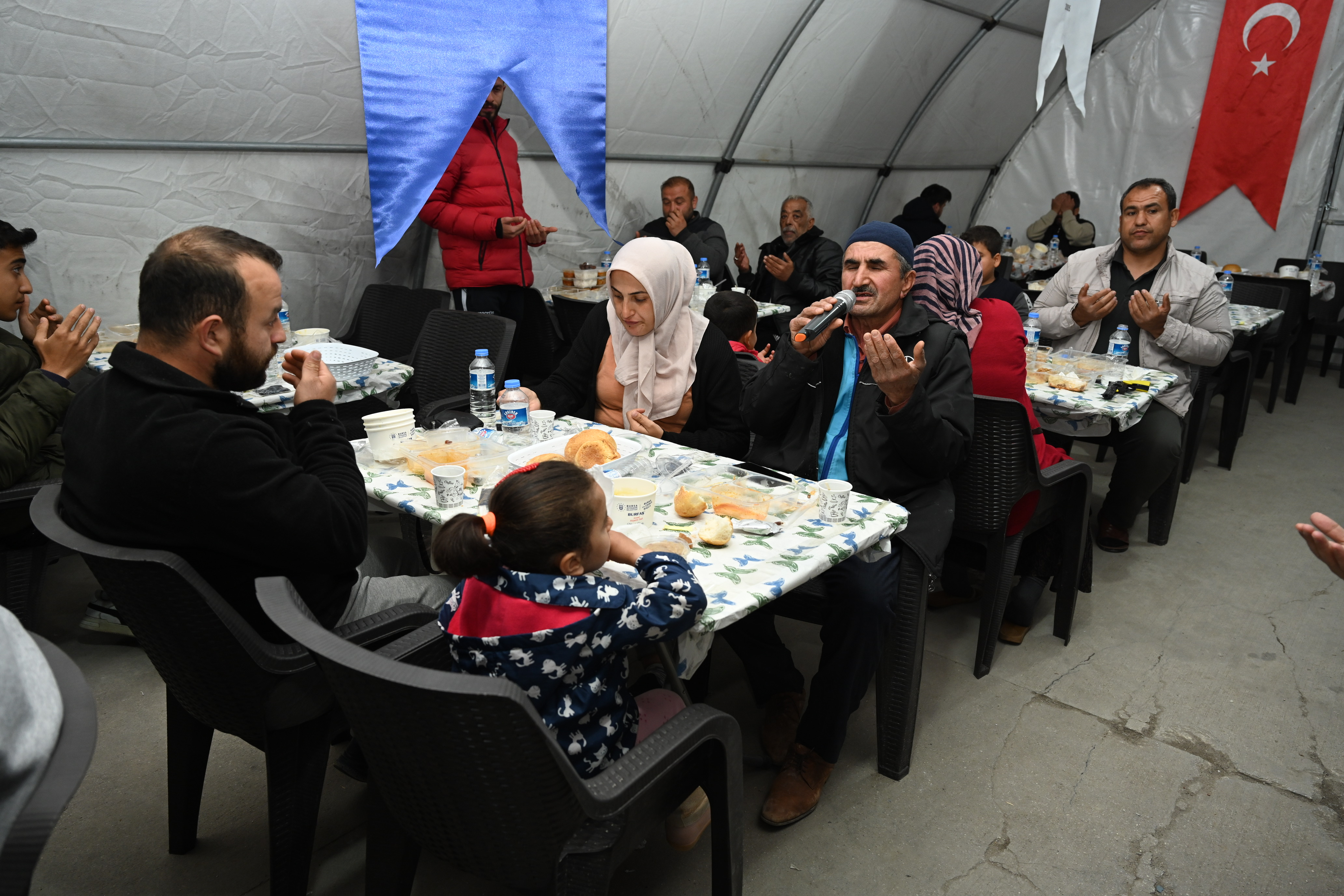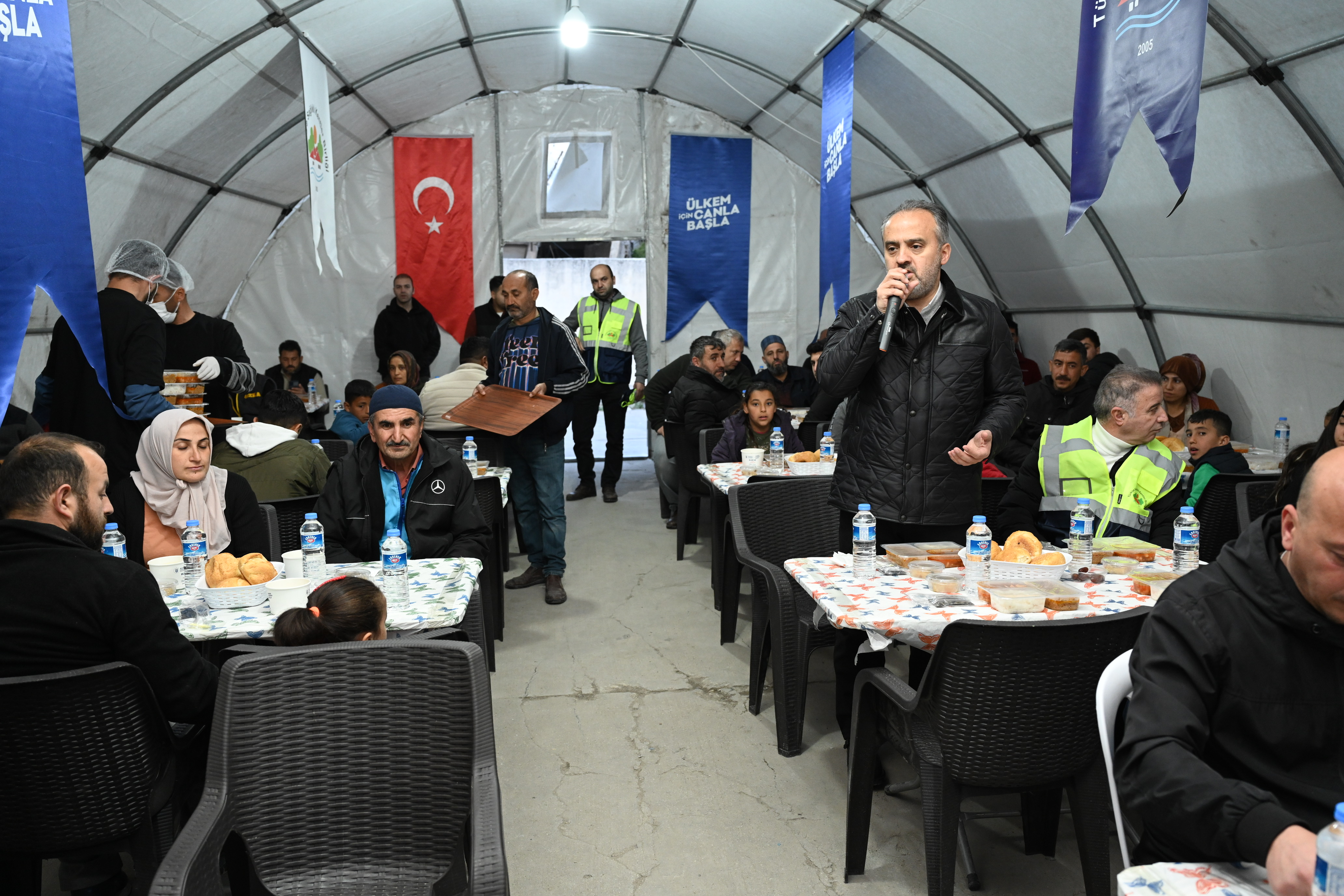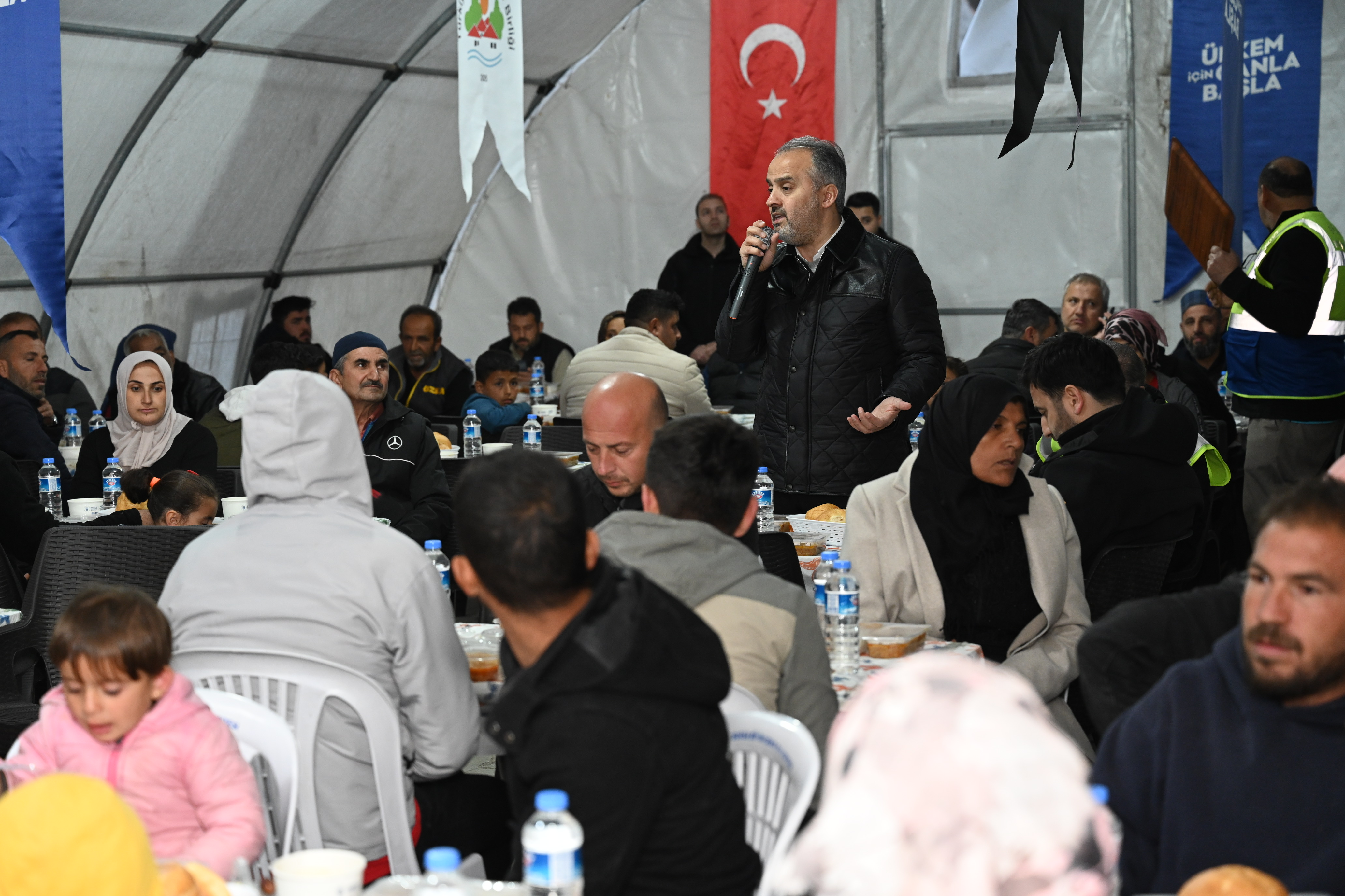 Bursa Büyükşehir Belediye Başkanı Alinur Aktaş da yemeğe sponsor olan Balkantürksiad Başkanı Fatih Şakir ve Türkiye Sağlıklı Kentler Birliği Genel Sekreteri Ahmet Recep Tekcan ile birlikte orucunu iftar çadırında depremzedelerle birlikte açtı. Türkiye’nin iki ayrı depremle sarsıldığını ancak devlet millet el ele yaraların sarılmaya çalışıldığını belirten Büyükşehir Belediye Başkanı Alinur Aktaş, “Ramazan’ın bereketini depremzede vatandaşlarımızla birlikte yaşamaya çalışıyoruz. Bursa merkezde devam eden iftar programlarımızın yanında Hatay’da da 3 ayrı noktada her gün 2 bin kişiye iftar ve sahur yemeği veriyoruz. Ben özellikle Balkantürksiad ailesine, Türkiye Sağlıklı Kentler Birliği’ne, Samsun Makine’ye, Ergünler İnşaat’a ve sayamadığım tüm sponsorlarımıza yürükten teşekkür ediyorum. Her birinden Allah razı olsun. İnşallah devlet millet elbirliğiyle yaraları sarmaya devam edeceğiz. Ve nasip olursa o eski güzel günlere hep birlikte erişeceğiz” dedi.