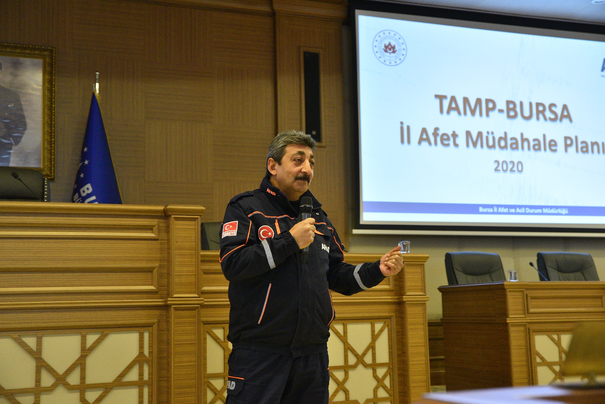 AFAD’da görevli Şef Muhammed Sarı ise İl Afet Müdahale Planı kapsamında 26 hizmet grubu oluşturulduğunu ve bu hizmet gruplarının tamamında Büyükşehir Belediyesi’nin destek çözüm ortağı olduğunu kaydetti. Bursa’nın 17 ilçesinde toplam 692 adet toplanma alanı hazırlandığını ifade eden Sarı, müdahale planının detaylarını anlattı. Bursa’da meydana gelecek bir depremde, ilk desteğin Çanakkale, Bilecik, Kütahya, Kocaeli, Sakarya ve Yalova’dan geleceğini dile getiren Sarı, olası afetlerin, yerel, bölgesel, ulusal ve uluslararası olmak üzere 4 seviyeye ayrıldığını belirterek, afetin seviyesine göre yardım talebinin daha geniş alanlara yayılabileceğini vurguladı.