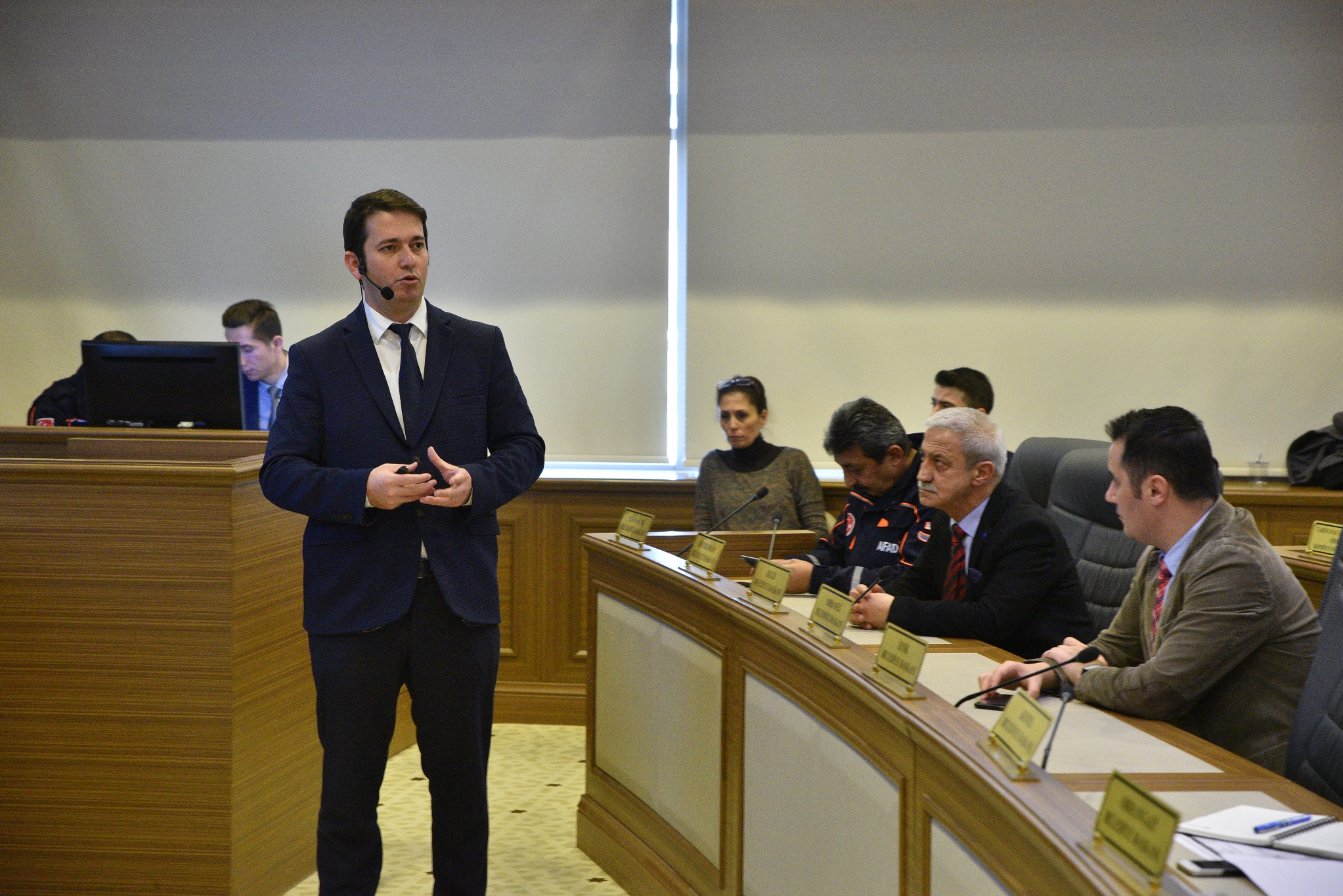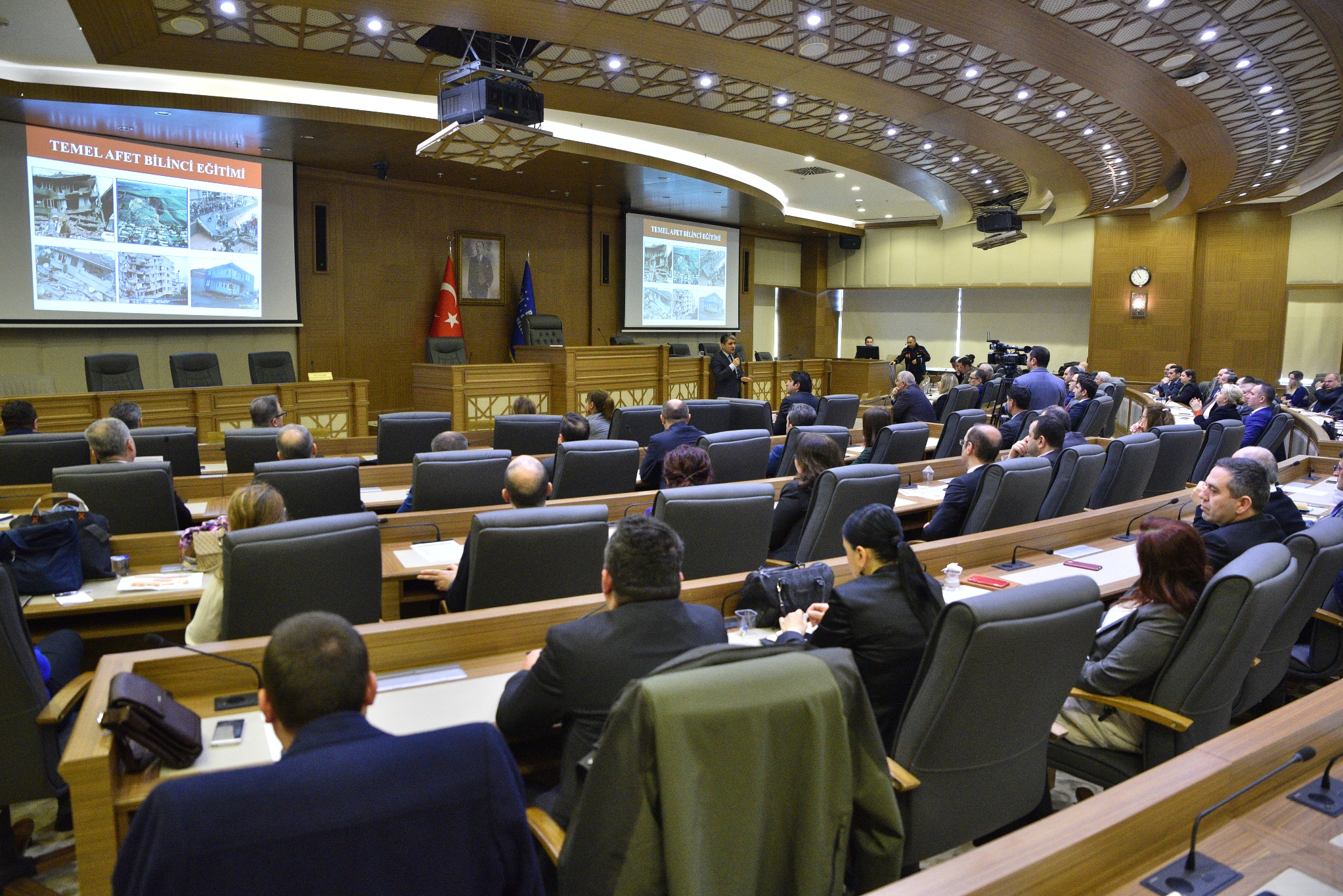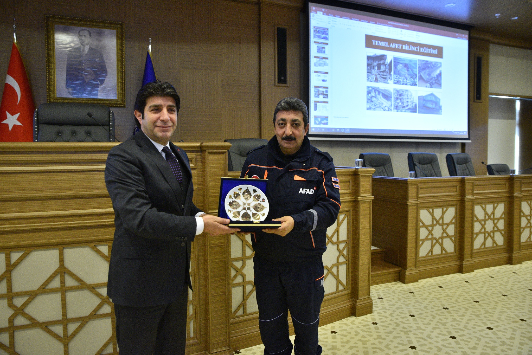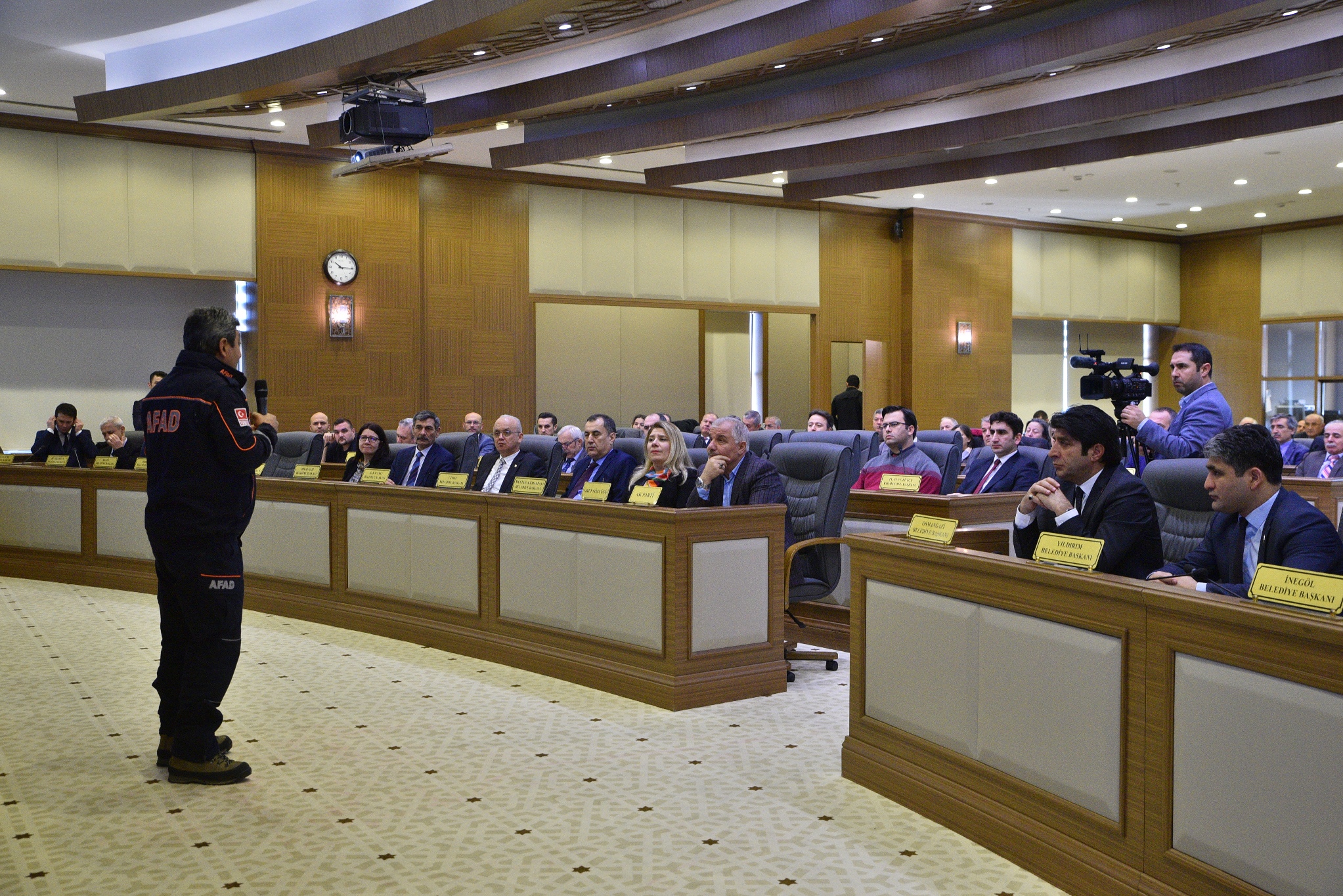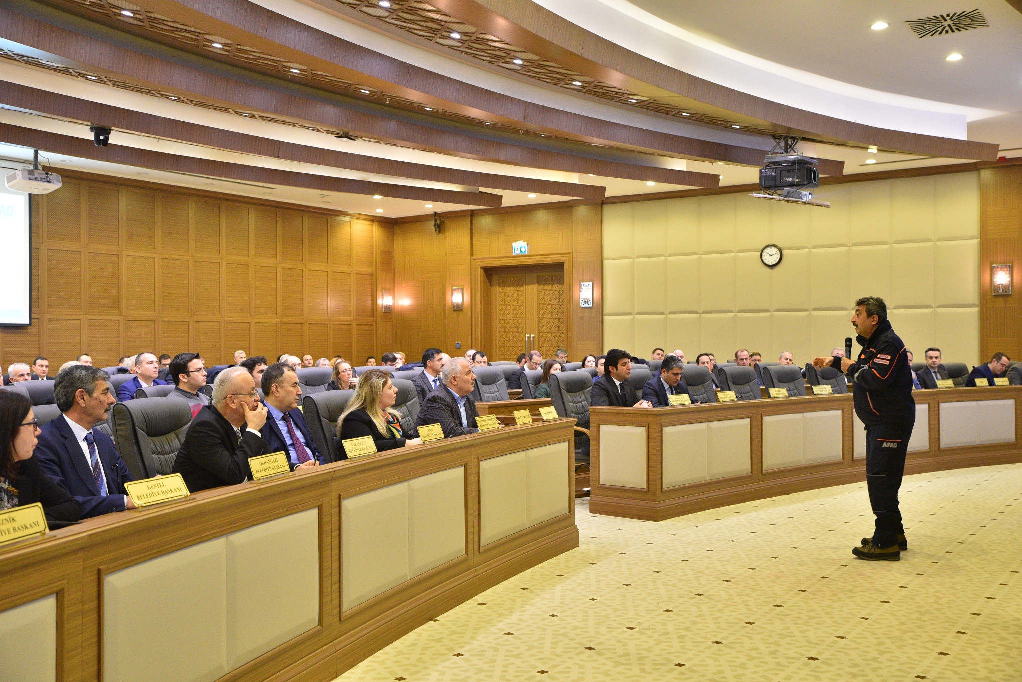 İnsan Kaynakları ve Eğitim Dairesi Başkanlığı Eğitim Şube Müdürlüğü’nün düzenlendiği ve meclis salonunda yapılan eğitime yoğun bir katılım oldu. İl Afet ve Acil Durum (AFAD) Müdürü Yalçın Mumcu, Türkiye’de geçmişte yaşanan depremlerden örnekler vererek, deprem öncesi planlama ve deprem anındaki koordinasyonun büyük önem taşıdığını söyledi. Bursa’da yaşanacak olası bir depremde 250’ye yakın ekibin Bursa’ya hareket edeceğini hatırlatan Mumcu, tüm bu ekiplerin tam bir koordinasyon içinde çalışması gerektiğine dikkat çekti. AFAD arkasındaki 50-60 dönümlük alanın zeminin Büyükşehir Belediyesi tarafından mıcırla kaplandığını, elektrik, su, telefon bağlantılarının yapıldığını, tuvalet alanlarının belirlendiğini dile getiren Mumcu, “Afet anında 250’ye yakın ekibi taşıyan araçların ve Tırların Bursa trafiğine girdiğini düşünün. Bu nedenle Büyükşehir Belediyemizin katkılarıyla yapılan bu alan büyük önem taşıyor. Yardıma gelen ekipler, hemen bu alana alınacak ve plan dahilinde arama kurtarma çalışmalarına yönlendirilecek” dedi.