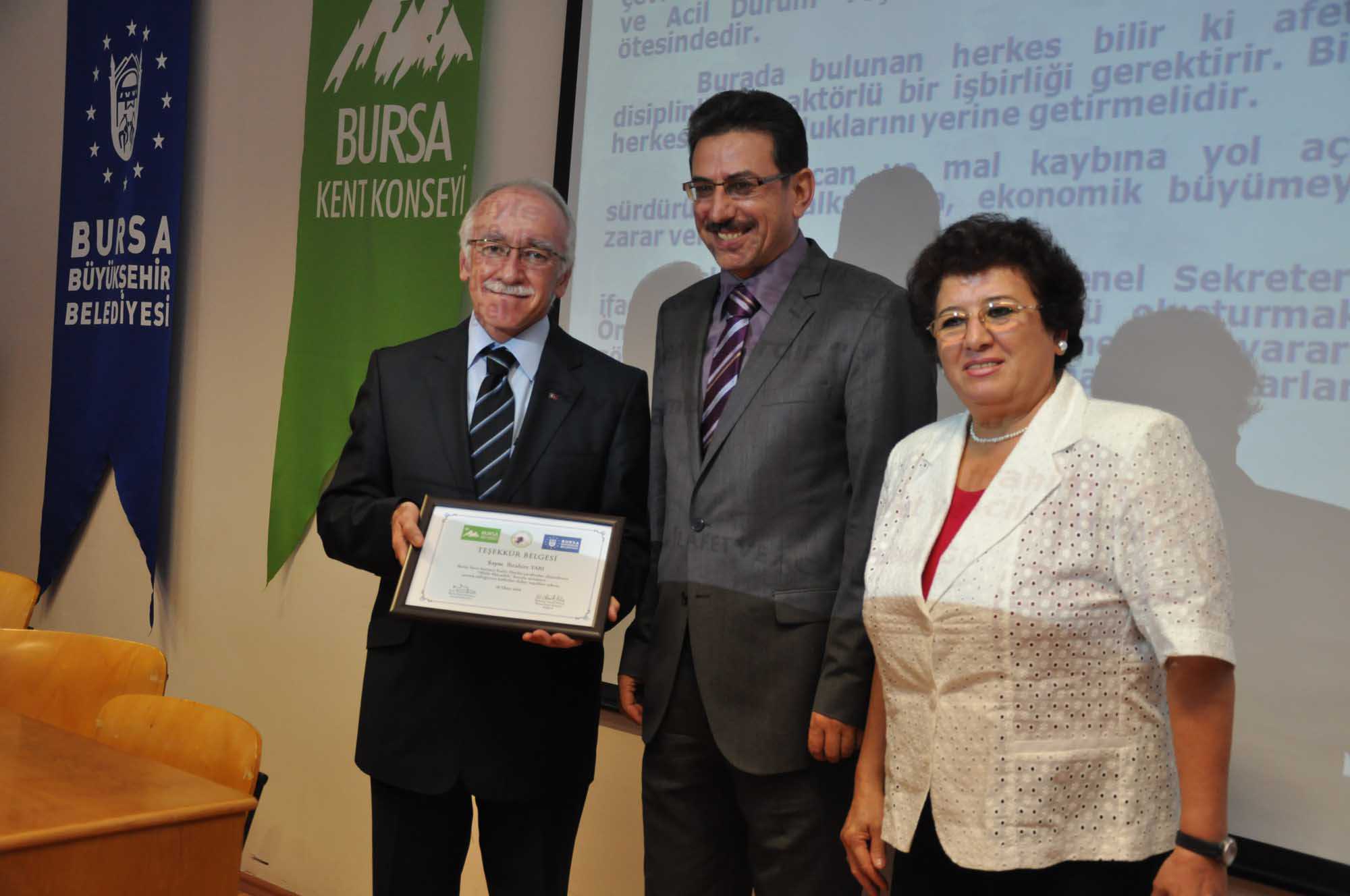Eğitim seminerinin sonunda Bursa Kent Konseyi Başkan Yardımcısı Lütfi Taşçı ve Kadın Meclisi Başkanı Kadriye Sarıbıyık, Bursa İl Afet ve Acil Durum Müdürü İbrahim Tarı’ya günün anısına plaket verdi.