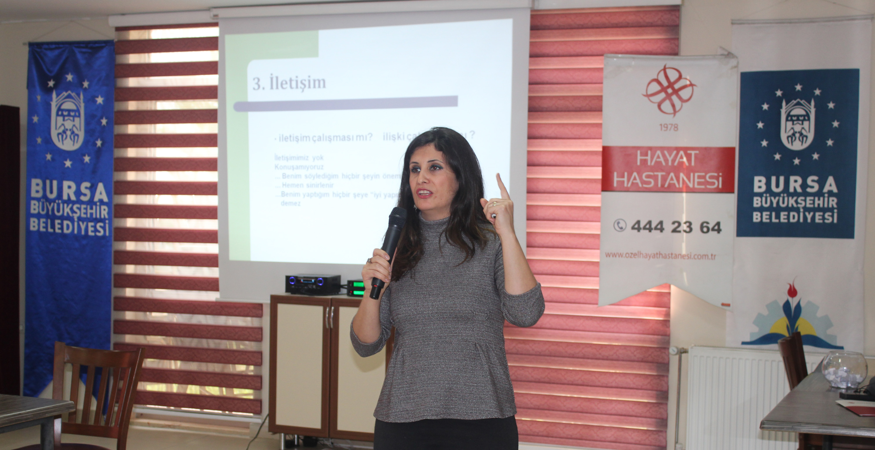 BURSA – Bursa Büyükşehir Belediyesi Hanımlar Lokali’nde düzenlenen seminerde, Uzman Psikolog Filiz Yakmaz Basılgan, katılımcılara, ‘Aile İçi İletişim’ konusundan bilgiler verdi.