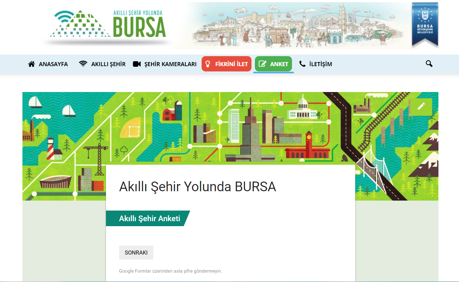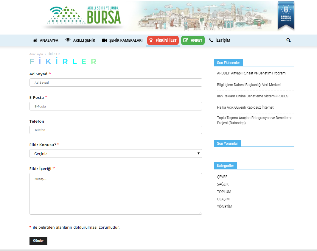 Akıllı Şehircilik ve Belediyecilik çalışmaları kapsamında bilgi teknolojilerini yoğun olarak kullanan Bursa Büyükşehir Belediyesi, kente dair fikri olan herkesin katılımına imkan verecek bir web platformu hazırladı. Platform, ‘Akıllı Şehircilik’ ile ilgili farkındalık oluşturmak, bu alanda belediyenin mevcut, devam eden ve planlanan projelerinin anlatılması ve önerileri olan vatandaşların katılım sağlaması amacıyla oluşturuldu.