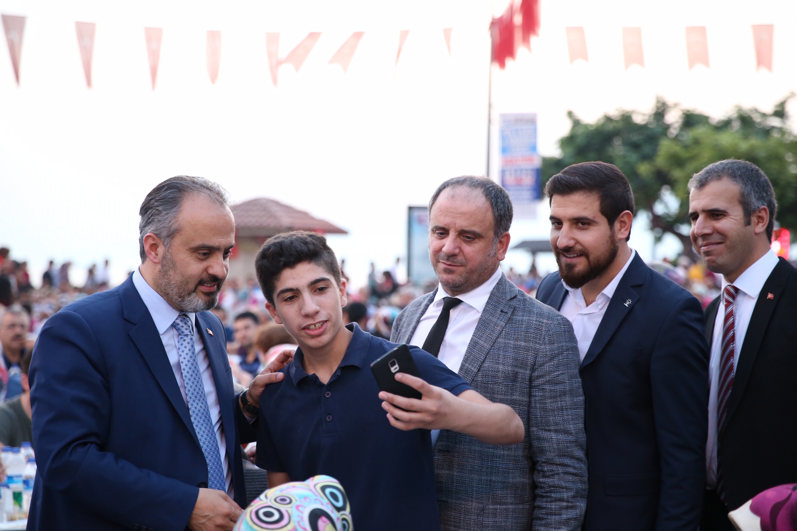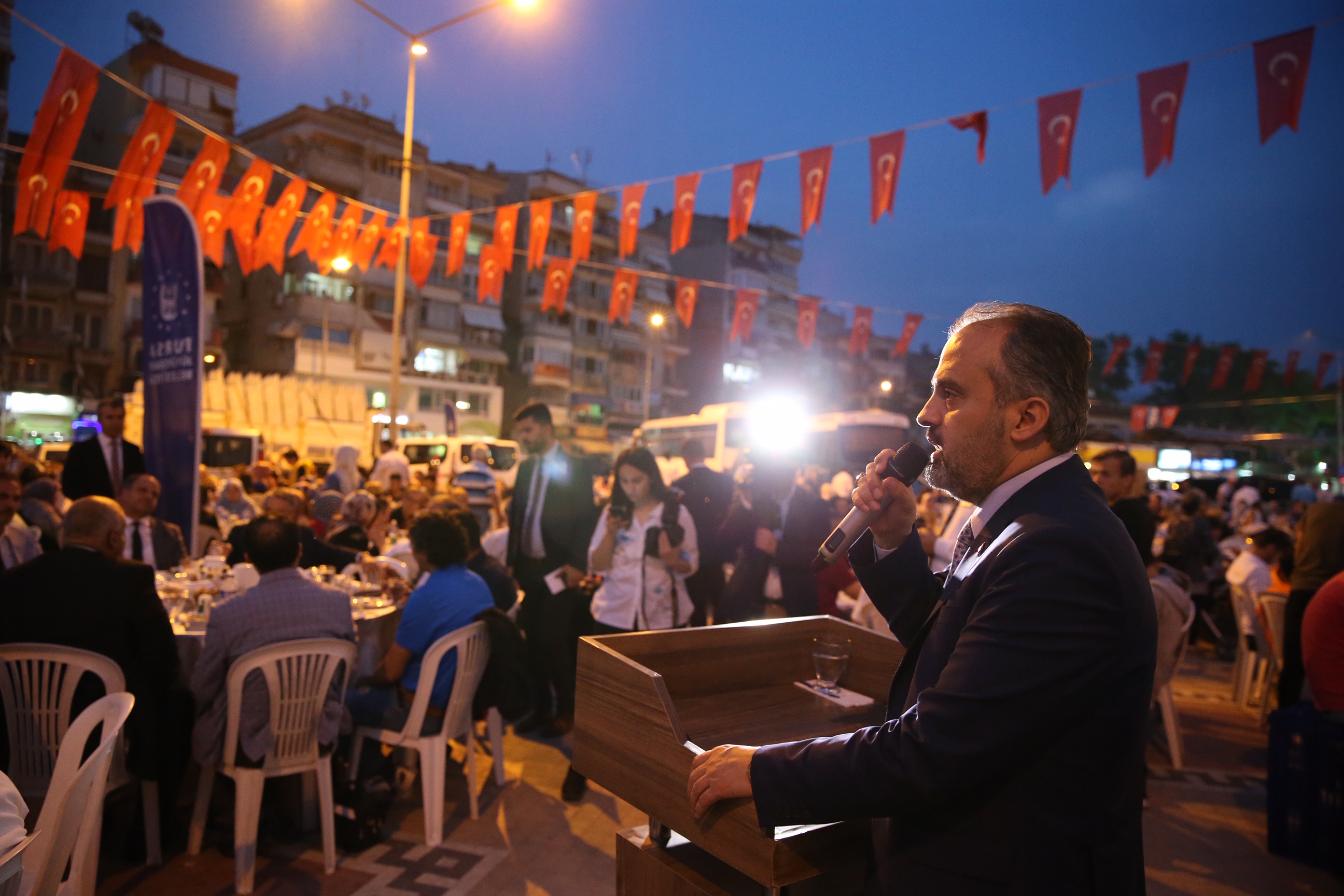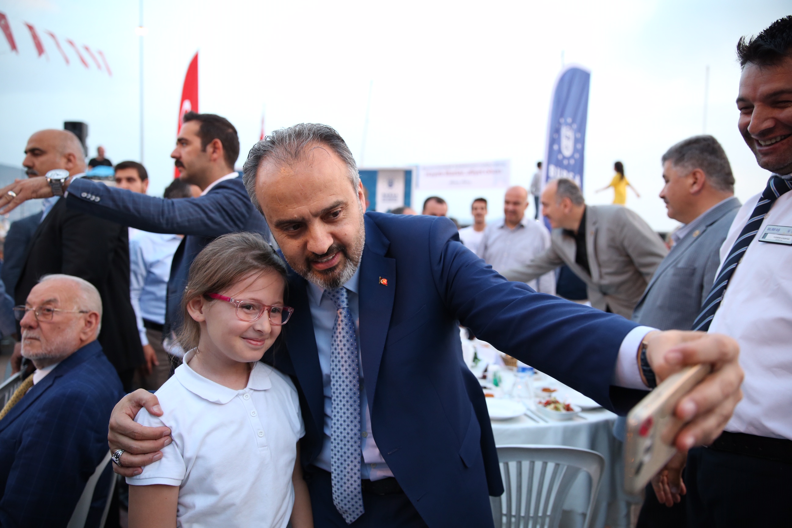 Bursa Büyükşehir Belediyesi, Ramazan ayının manevi iklimini kentin tüm ilçeleriyle buluşturan iftar programını bu kez Gemlik’te gerçekleştirdi. Gemlik 15 Temmuz Demokrasi Meydanı’nda düzenlenen iftara ilçede yaşayan vatandaşlar yoğun katılım sağladı. Gemlik’te sevgi seliyle karşılanan Bursa Büyükşehir Belediye Başkanı Alinur Aktaş da orucunu vatandaşlarla birlikte açtı. Başkan Aktaş, birlik ve beraberlik mesajları verdiği konuşmasında, “Her akşam başka bir ilçedeyiz. Bursa’mızın 17 ilçesine de ulaşmaya çalışıyor, hemşerilerimizle iftar yapıyoruz” dedi.