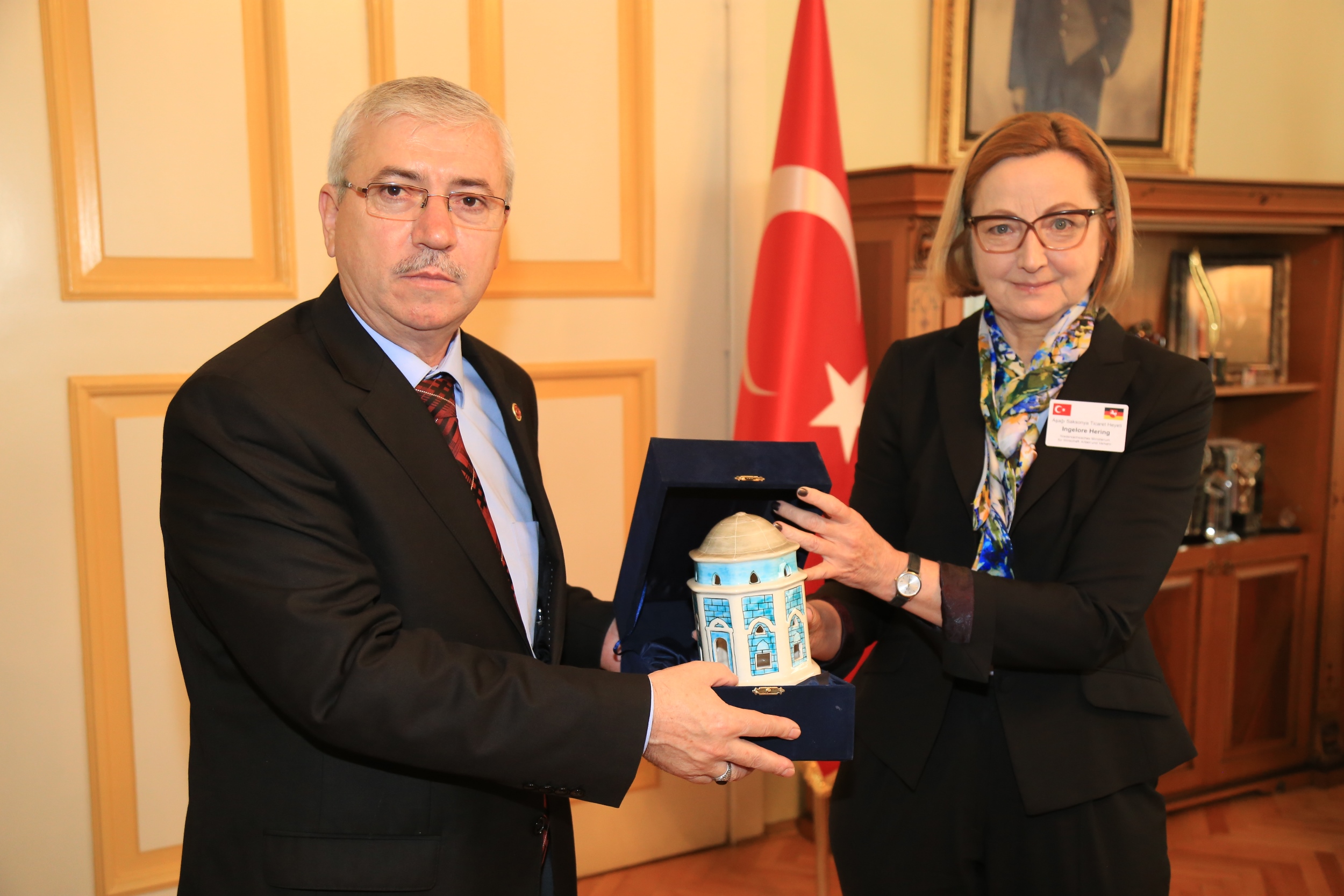 Başkanvekili Köse, ziyaretin sonunda konuklarına Bursa’ya özgü hediyeler verdi ve Yeşil Türbe çinisi hediye etti.