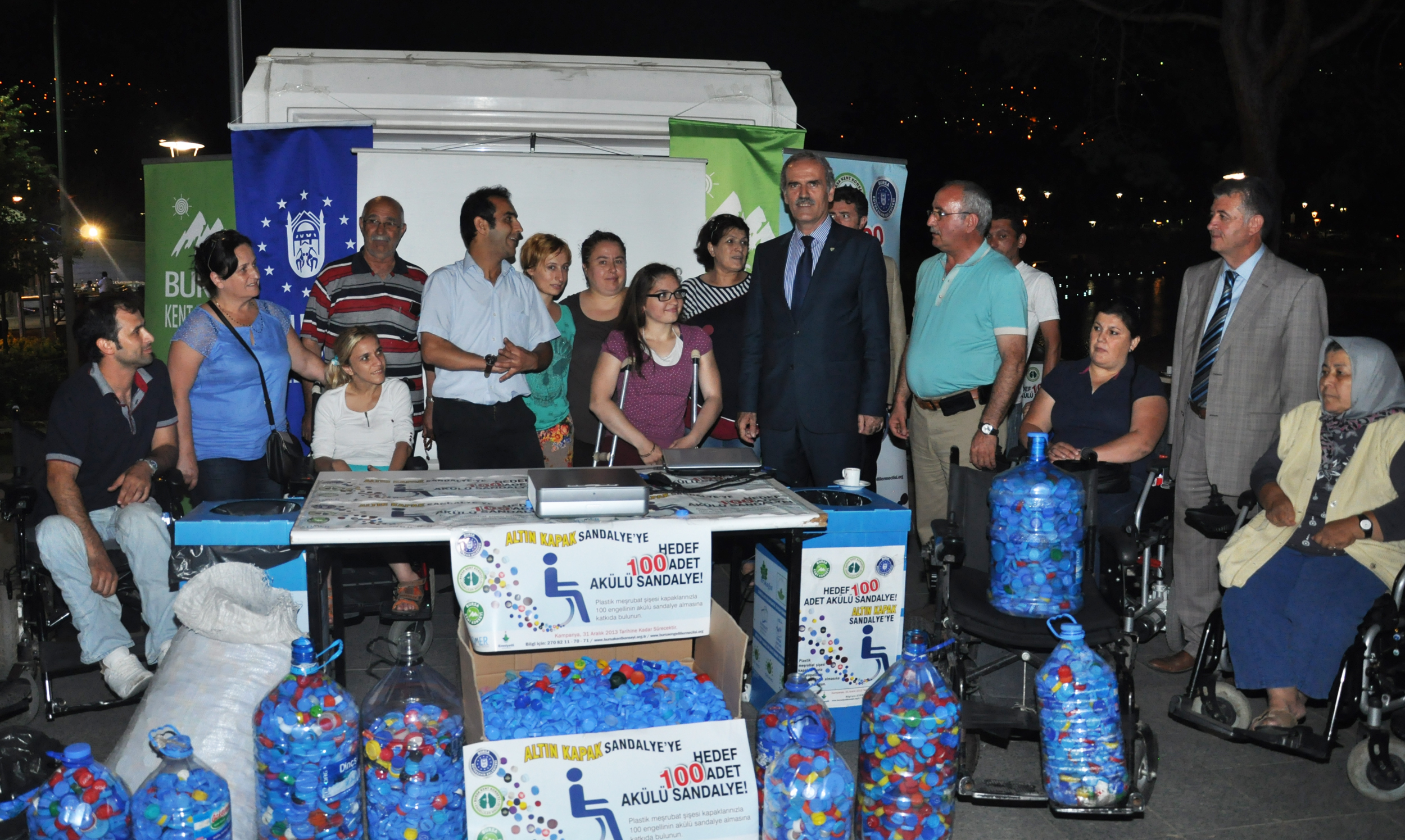 Bursa Büyükşehir Belediyesi tarafından Merinos Park’ta organize edilen Temaşa-i Ramazan etkinlikleri kapsamında Bursa Kent Konseyi Engelliler Meclisi’nin açtığı stantla ‘Altın Kapak Sandalye’ye projesini her kesime duyuruyor. Temaşa-i Ramazan etkinlikleri izlemek için gelen vatandaşlar, yanlarındaki kapakları standa bırakarak projeye olan desteklerini sürdürüyor. Bursa Büyükşehir Belediyesi Başkanı Recep Altepe de BKK Engelliler Meclisi standını ziyaret ederek BKK Başkanı Semih Pala’dan çalışmalar hakkında bilgi aldı. Bursa Kent Konseyi Başkanı Semih Pala, Altın Kapak Sandalye’ye projesi kapsamında 60 adet akülü aracı ihtiyaç sahiplerine dağıttıklarını söyledi. Hedeflerinin 100 adet akülü sandalye olduğunu belirten Pala, “Engelliler Meclisi’miz Türkiye’ye örnek çalışmalar yapıyor. Yaklaşık 2 milyon kapakla bir adet akülü sandalye alınabiliyor. Kampanya son derece başarılı bir şekilde yürütülüyor. Halkımız da projeye sahip çıktı. Öğrenciler, taksiciler, muhtarlar ve her kesimden bizlere kapaklar ulaştırılıyor. Gerek biz araçlarımızla kapakları alıyoruz, gerekse vatandaşlarımız Bursa Kent Konseyi ofislerine getiriyor. edilen Temaşa-i Ramazan etkinlikleri kapsamında standımız bir ay boyunca açık kalacak. Vatandaşlarımız biriktirdikleri kapakları buraya da teslim edebilir” dedi.