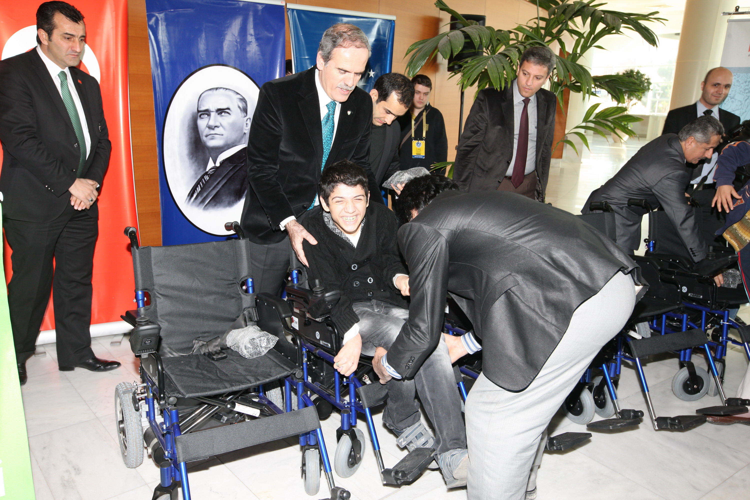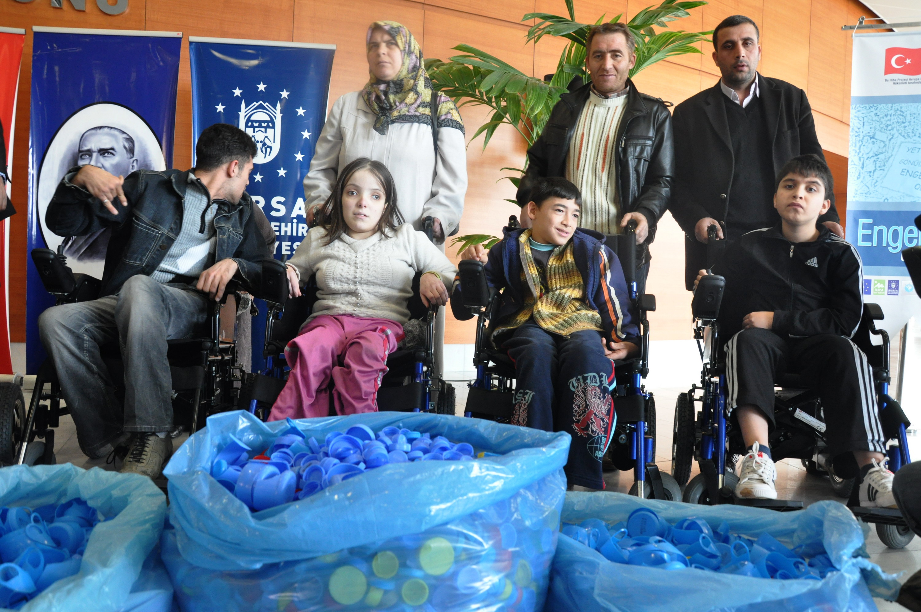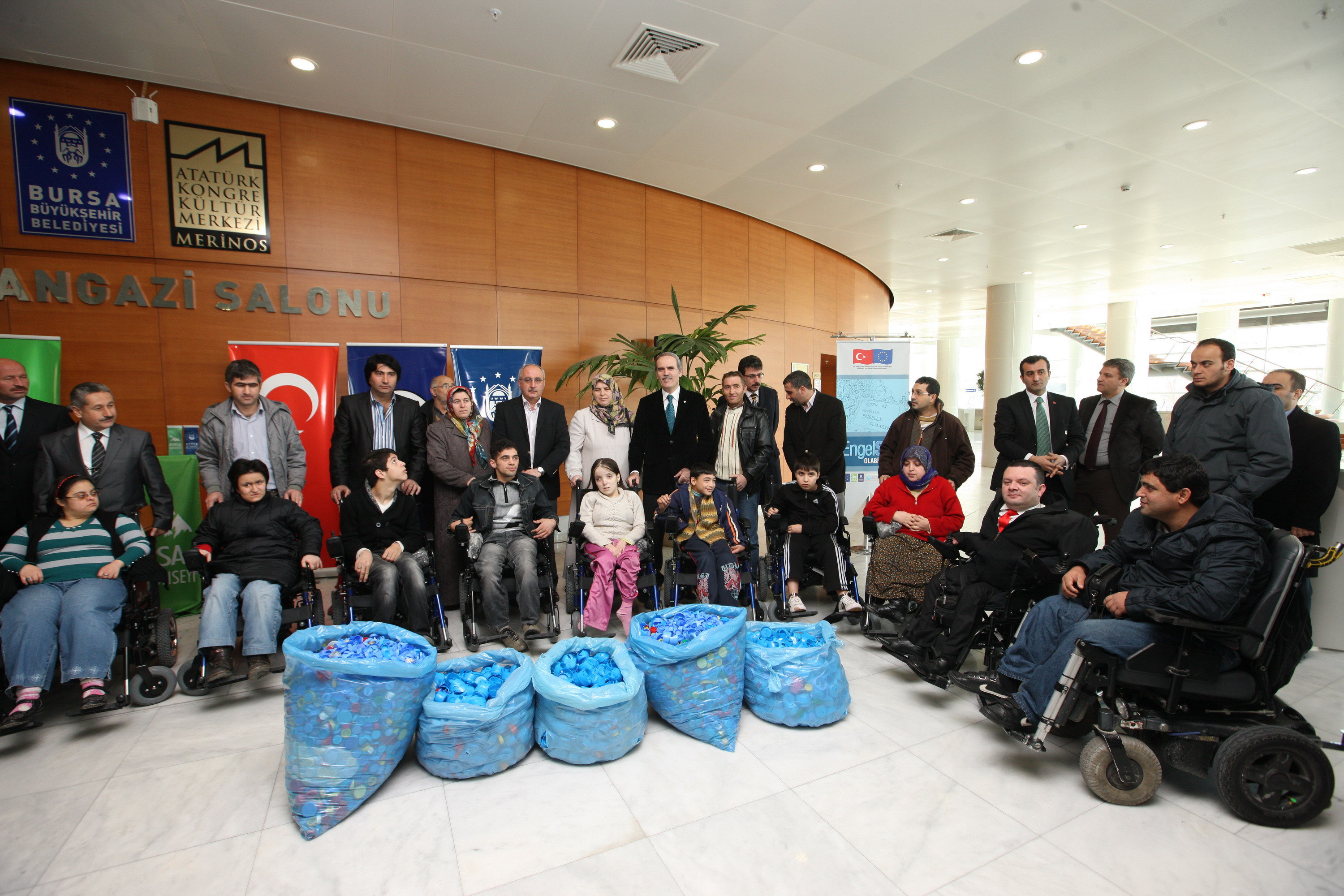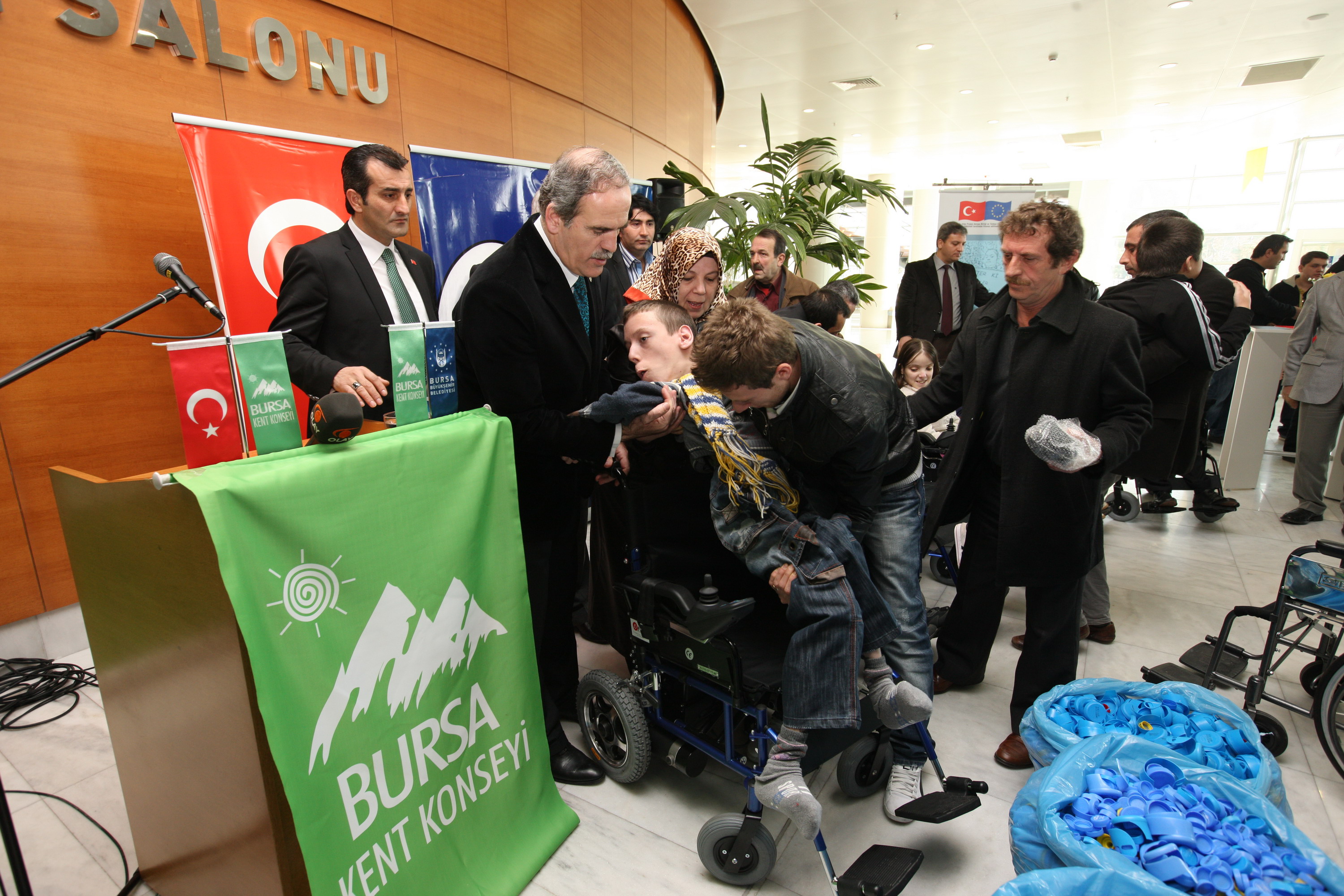 Bursa Kent Konseyi Başkanı Mehmet Semih Pala ise, Türkiye’ye örnek çalışmalar yapmaya devam ettiklerini ifade etti. Bursa Kent Konseyi Engelliler Meclisi tarafından başlatılan ‘Altın kapaklar sandalyeye’ projesinde ilk meyvelerini almaya başladıklarını anlatan Pala, “Çöpe atılan kapakların nasıl akülü sandalyelere dönüştüğünü hep beraber gördük. Sosyal bir dayanışma ile engelli kardeşlerimizin hayata tutunmasına destek olduk. Engelli meclisimizin yürüttüğü ‘Altın Kapaklar Sandalyeye’ projesi kapsamında plastik pet şişe kapaklarını topladık. Kuralına uygun ve resmi bir şekilde yapılan kampanyayla kapaklar engelli aracına dönüştürüldü. 50’nin üzerinde müracaat oldu. Bu sayı 16’ya düşürüldü. Yapılan kura çekimiyle de ilk etapta 10 kişi belirlendi” şeklinde konuştu.