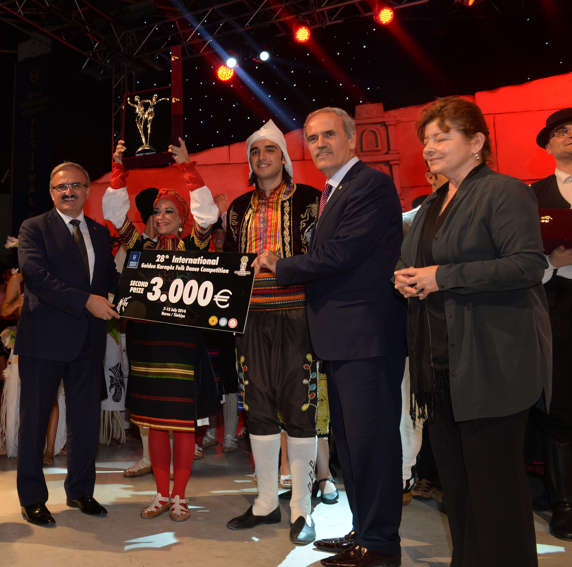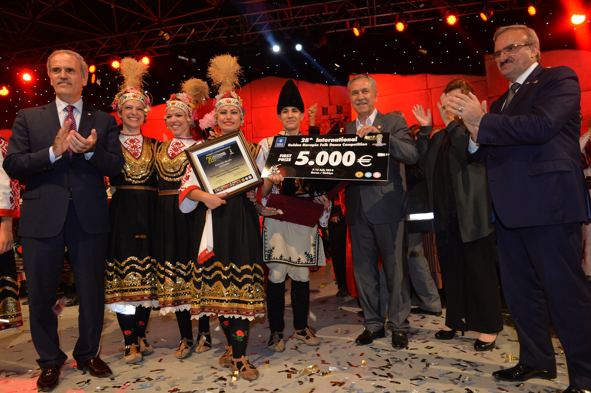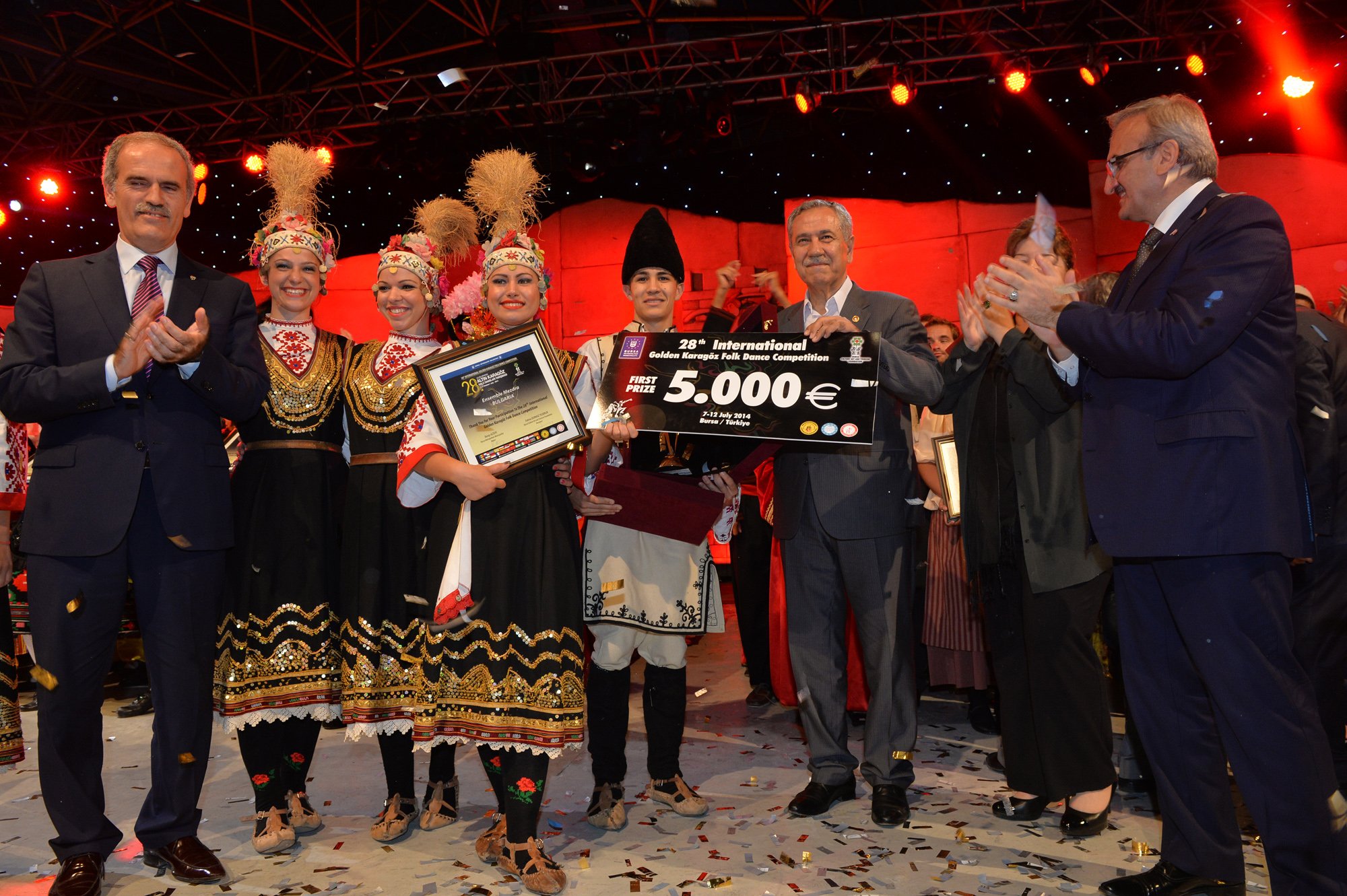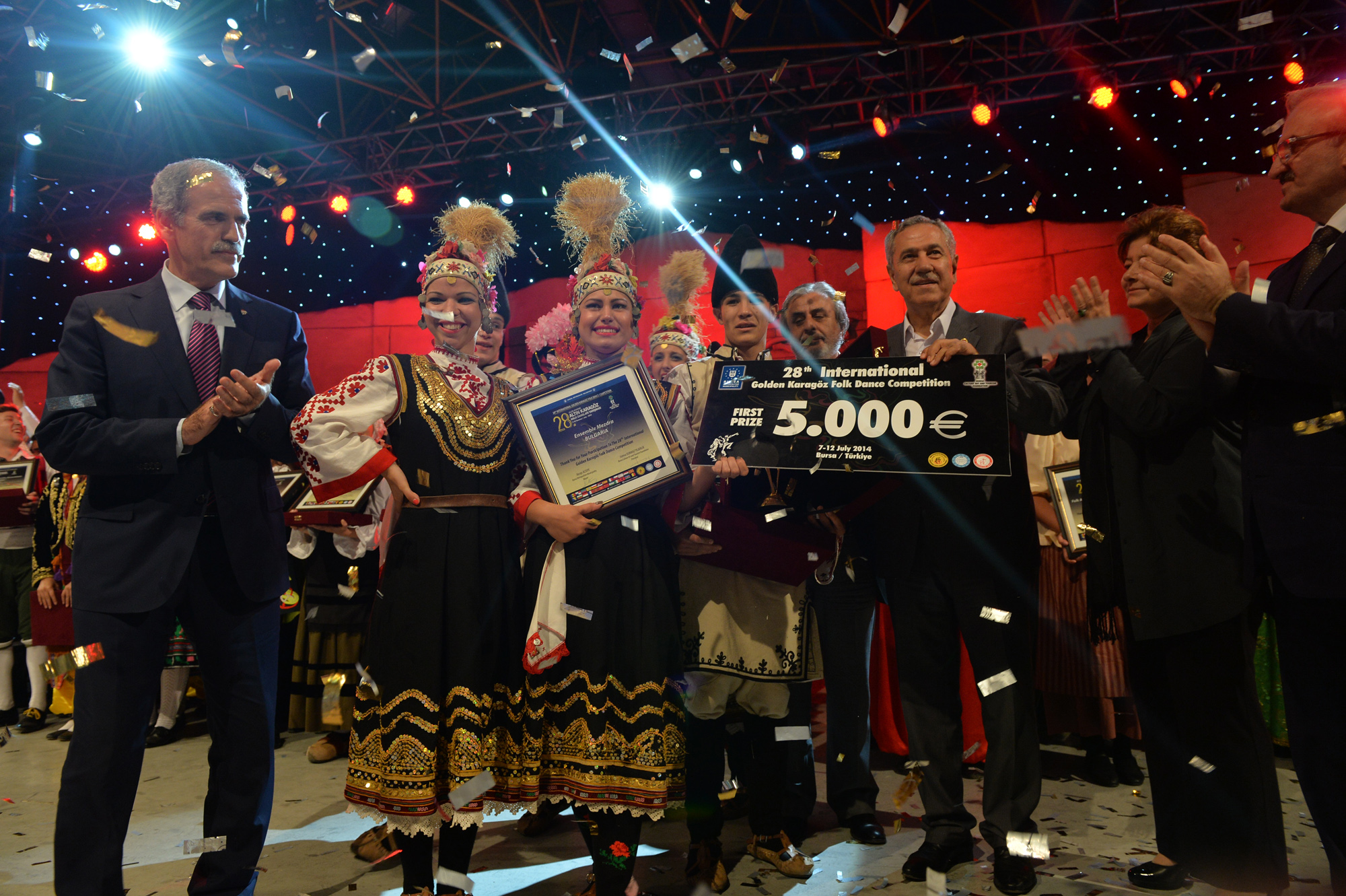 Bursa’ya 19 farklı ülkeden gelen halk dansları ekiplerini aynı sahnede buluşturan ‘28. Uluslararası Altın Karagöz Halk Dansları Yarışması’, tüm dünyaya dostluk, barış sevgi ve kardeşlik mesajları gönderdi. Finalde 5’er dakikalık gösterilerini sergileyen gruplardan Bulgaristan ekibi birinci ve Sırbistan ekibi ikinci olurken; üçüncülüğü de Macaristan ekibi kazandı. Birincilik ödülünü, Bulgaristan ekibine Başbakan Yardımcısı Bülent Arınç takdim etti. Yarışmanın birincisi olan Bulgaristan ekibi ‘Altın Karagöz’ ile 5 bin Euro para ödülü, 2. olan Sırbistan ekibi ‘Gümüş Karagöz’ ile 3 bin Euro para ödülü ve Macaristan ekibi de üçüncülük ödülü olan ‘Bronz Karagöz’ ile 2 bin Euro para ödülü almanın sevincini yaşadı. Yarışmada 2. olan Sırbistan ekibine ödülünü Bursa Valisi Münir Karaloğlu, üçüncü olan Macaristan ekibine de ödülünü Büyükşehir Belediye Başkanı Recep Altepe verdi.