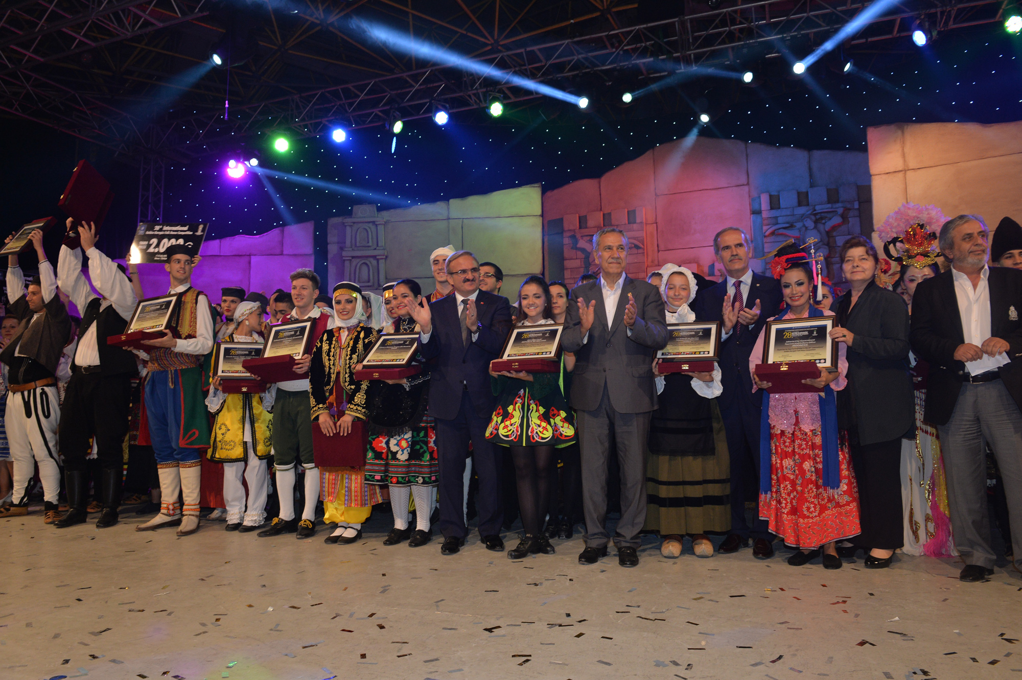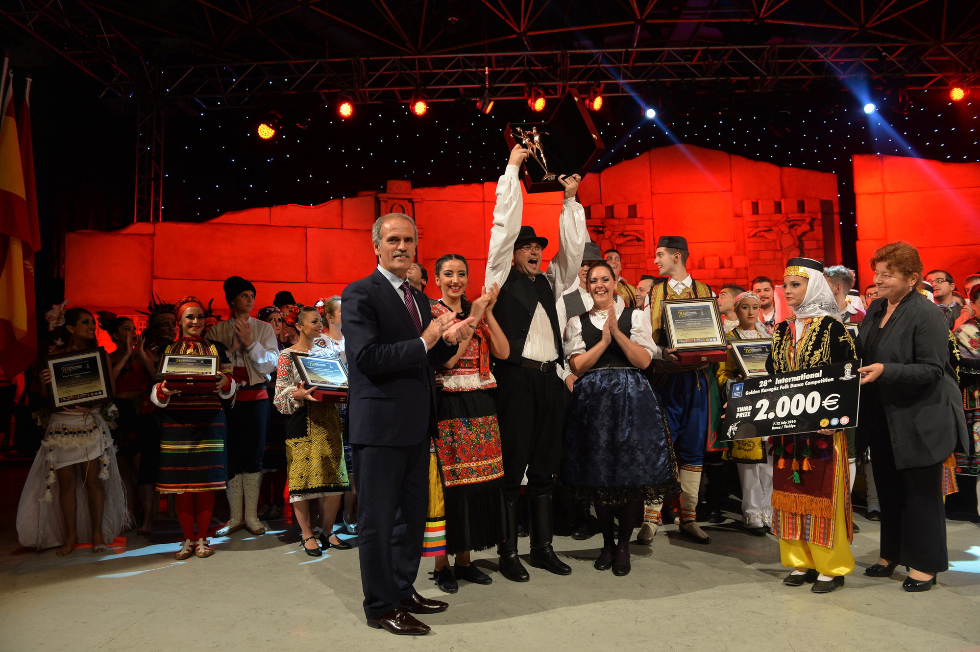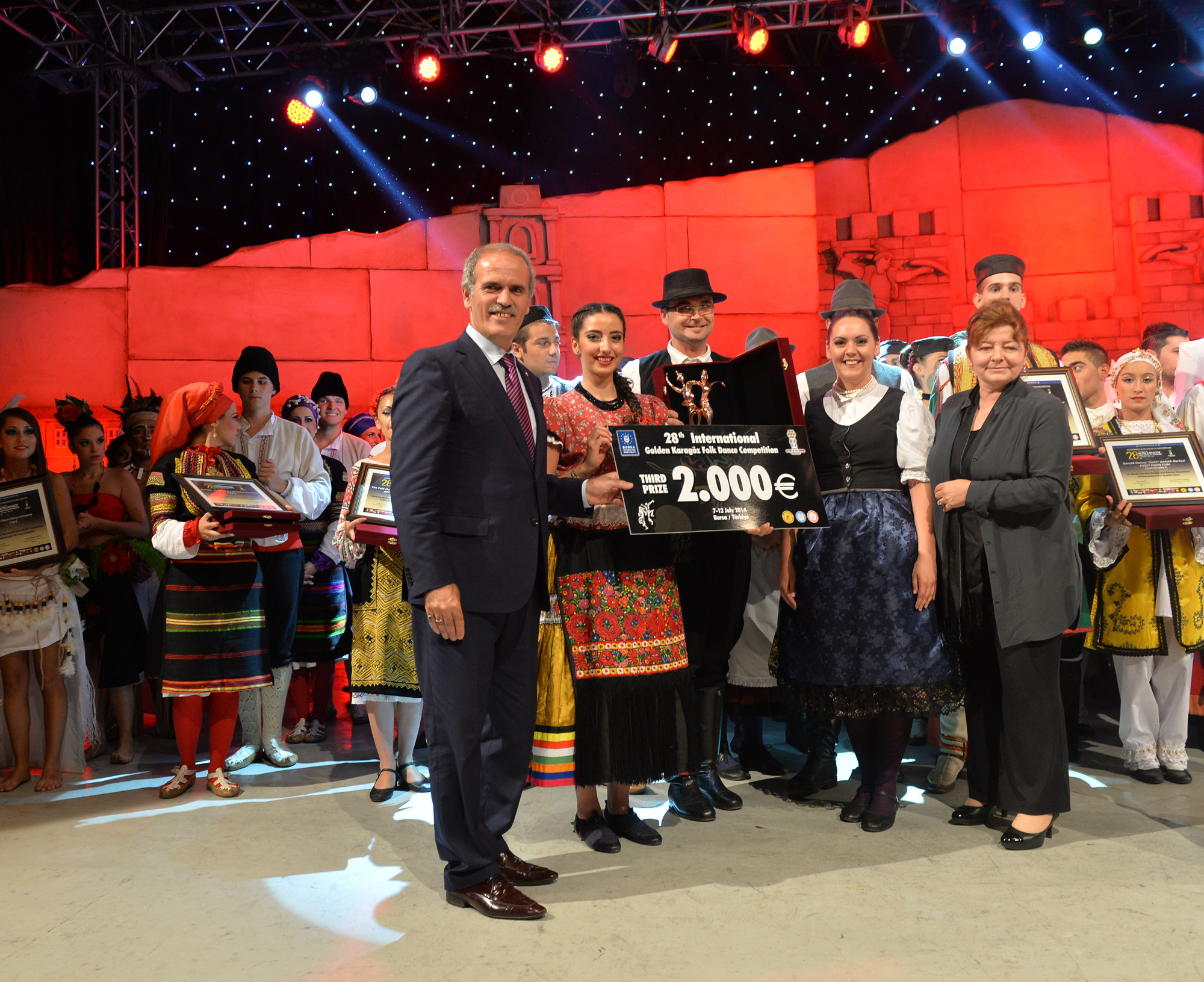 Bursa’ya 19 farklı ülkeden gelen halk dansları ekiplerini aynı sahnede buluşturan ‘28. Uluslararası Altın Karagöz Halk Dansları Yarışması’, tüm dünyaya dostluk, barış sevgi ve kardeşlik mesajları gönderdi. Finalde 5’er dakikalık gösterilerini sergileyen gruplardan Bulgaristan ekibi birinci ve Sırbistan ekibi ikinci olurken; üçüncülüğü de Macaristan ekibi kazandı. Birincilik ödülünü, Bulgaristan ekibine Başbakan Yardımcısı Bülent Arınç takdim etti. Yarışmanın birincisi olan Bulgaristan ekibi ‘Altın Karagöz’ ile 5 bin Euro para ödülü, 2. olan Sırbistan ekibi ‘Gümüş Karagöz’ ile 3 bin Euro para ödülü ve Macaristan ekibi de üçüncülük ödülü olan ‘Bronz Karagöz’ ile 2 bin Euro para ödülü almanın sevincini yaşadı. Yarışmada 2. olan Sırbistan ekibine ödülünü Bursa Valisi Münir Karaloğlu, üçüncü olan Macaristan ekibine de ödülünü Büyükşehir Belediye Başkanı Recep Altepe verdi.