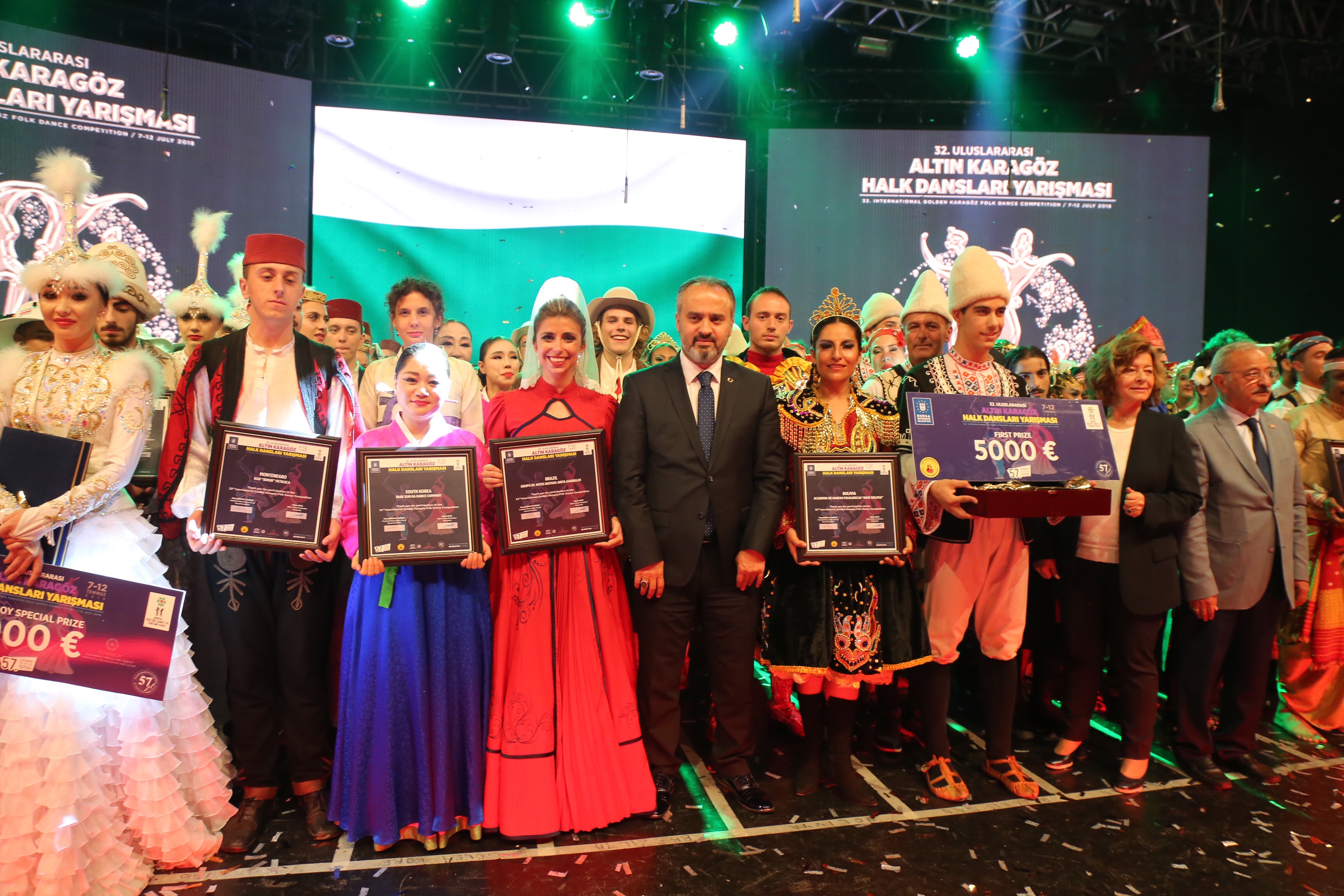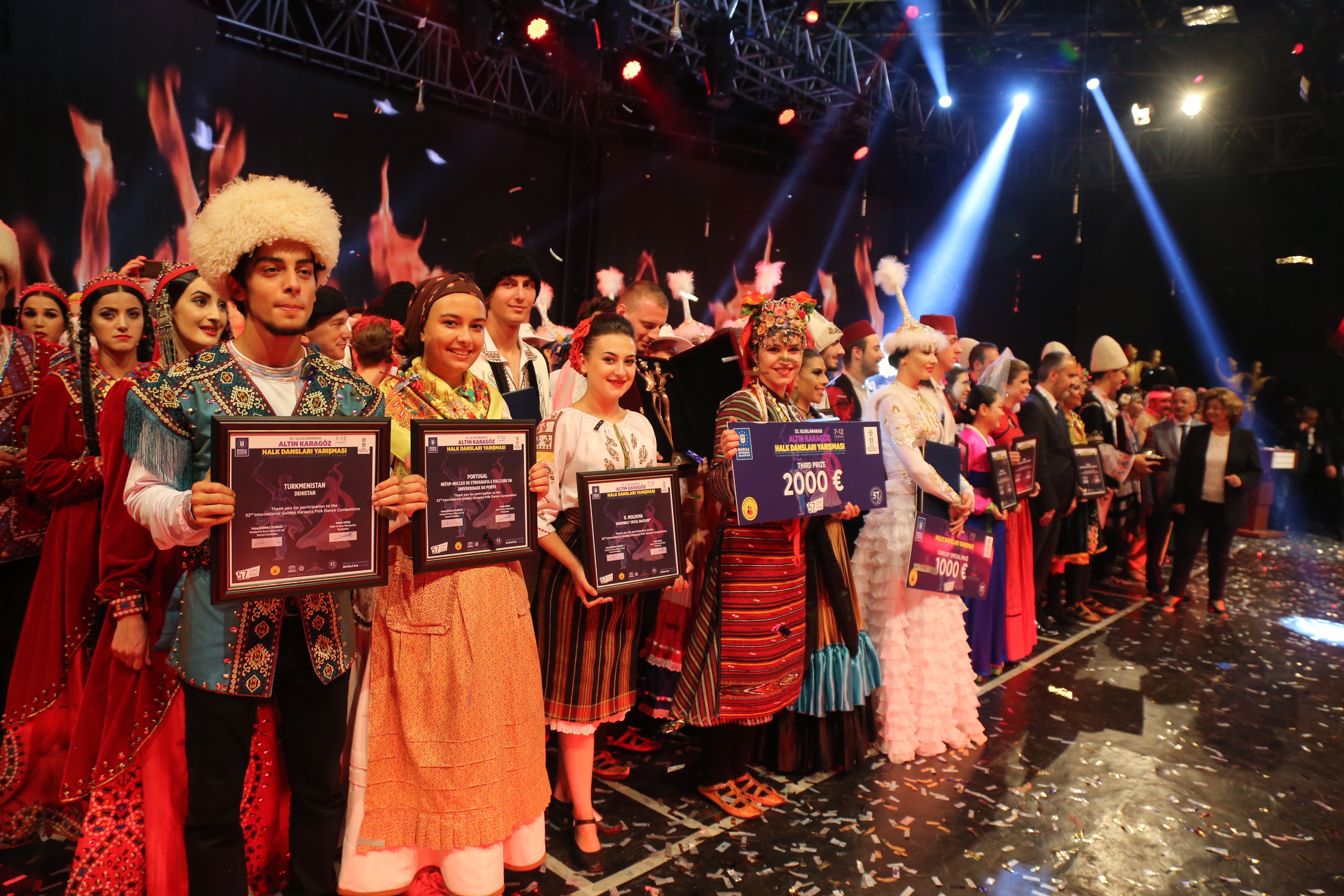 Büyükşehir Belediye Başkanı Alinur Aktaş, organizasyonun Bursa’da barış, kardeşlik ve dostluk rüzgarları estirdiğini belirterek, yarışmaya katılan tüm ekiplere teşekkür etti. BKSTV Yönetim Kurulu Başkanı Fatma Durmaz Yılbirlik ve Başkan Yardımcısı Ahmet Erdönmez de konuk ülke ekiplerine katılım belgelerini takdim etti. 32. Uluslararası Altın Karagöz Halk Dansları Yarışması, renkli görüntülerle sona erdi.