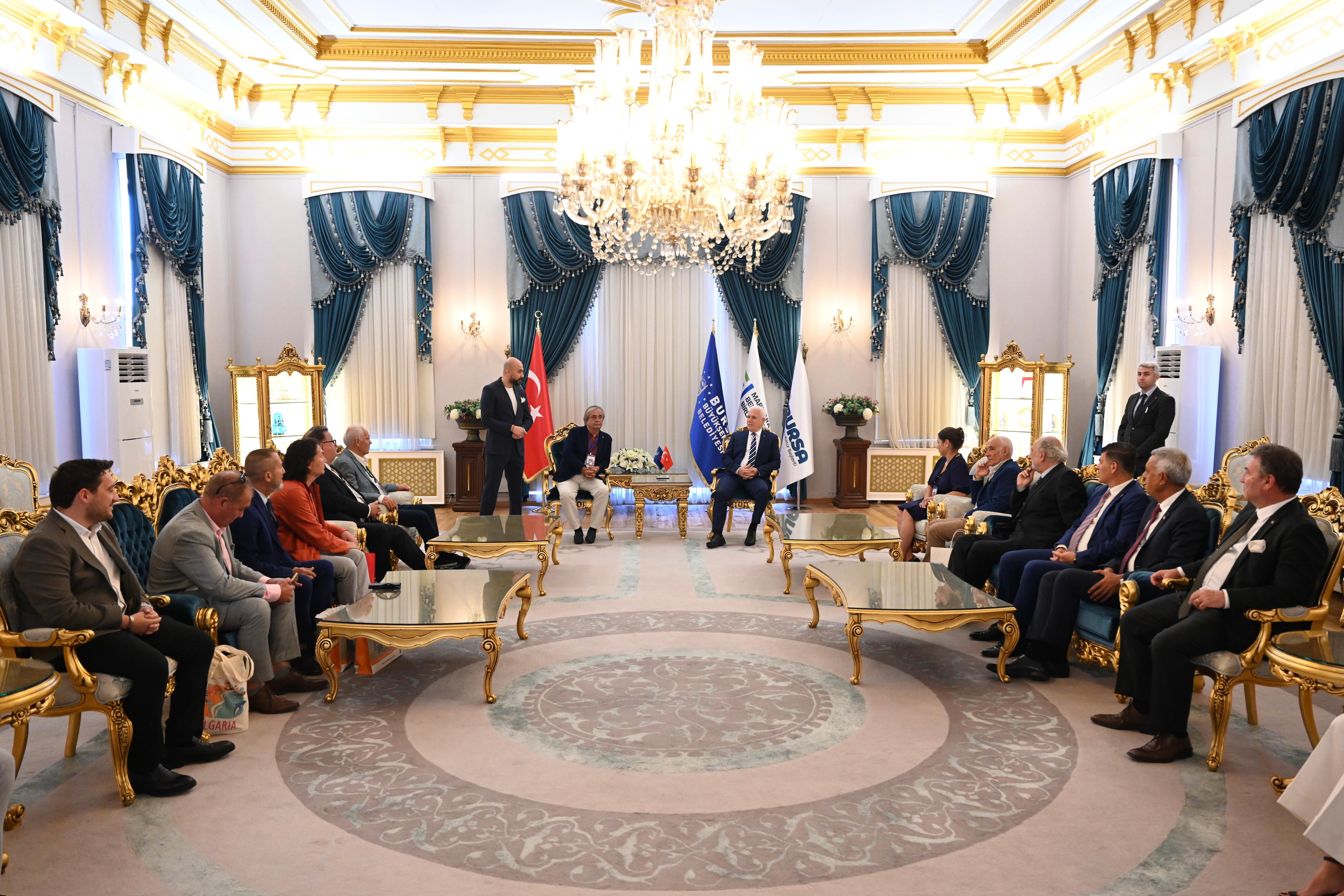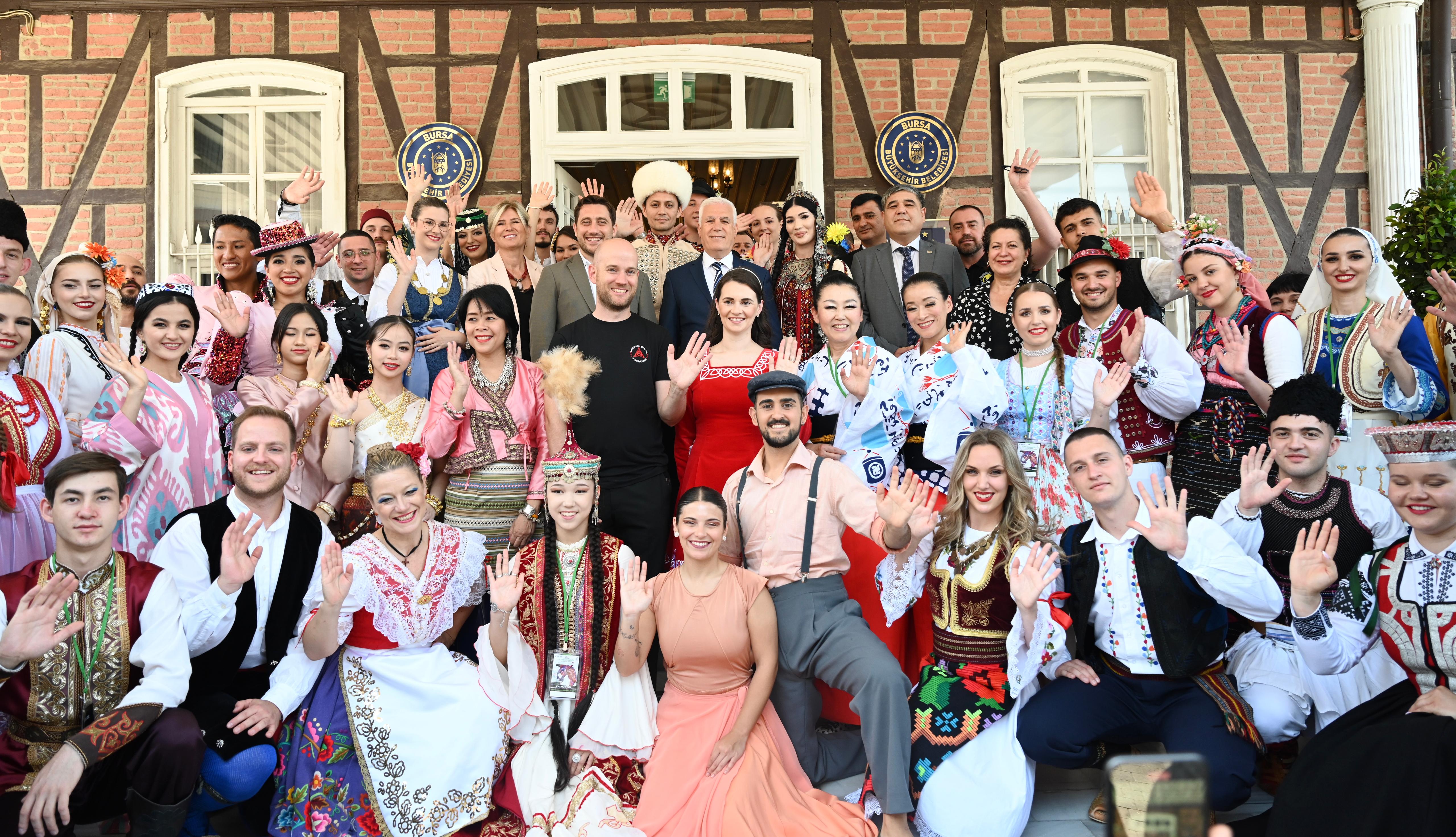 Bursa Büyükşehir Belediyesi adına Bursa Kültür Sanat ve Turizm Vakfı (BKSTV) tarafından düzenlenen 36. Uluslararası Altın Karagöz Halk Dansları Yarışması'na katılan 23 farklı ülke ve 26 yerel halk dansları topluluğunun temsilciler ile jüri üyeleri, Bursa Büyükşehir Belediye Başkanı Mustafa Bozbey’i ziyaret etti. BKSTV Yönetim Kurulu Başkanı Metin Atış’ın da yer aldığı ziyarette Başkan Bozbey, misafir ekiplerle samimi bir ortamda sohbet etti. Festivalle ülke kültürlerini buluşturarak dünyaya barış mesajları vermenin amaçlandığını söyleyen Başkan Mustafa Bozbey, birçok medeniyete ev sahipliği yapan Bursa’nın tarihinden aldığı güçlü mirası geleceğe taşıdığını belirtti. Bozbey, “Altın Karagöz de 36 yıldır dünya barışına katkı sunuyor. Bir hafta boyunca Bursa'mıza dansın ve müziğin büyüleyici harmonisini sunacak olan tüm sanatçılara teşekkür ediyorum. Bu yarışma, kültürler arası köprüler kurmamıza, birbirimizi anlamamıza ve değerlerimizi paylaşmamıza olanak sağlıyor. Tüm Bursalıları, bu renkli ve anlamlı etkinliklere katılmaya, dansın coşkusunu birlikte yaşamaya davet ediyorum” dedi.