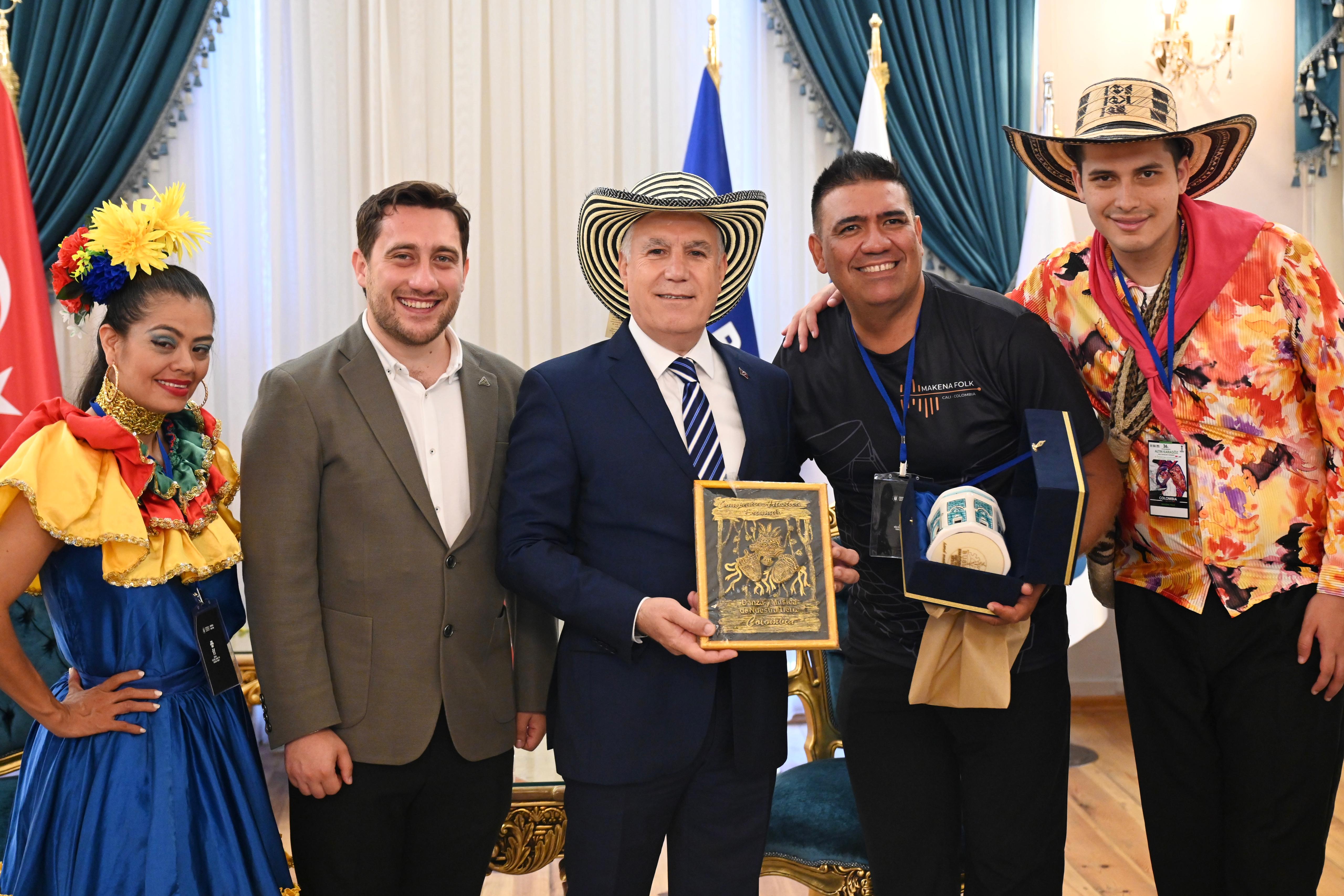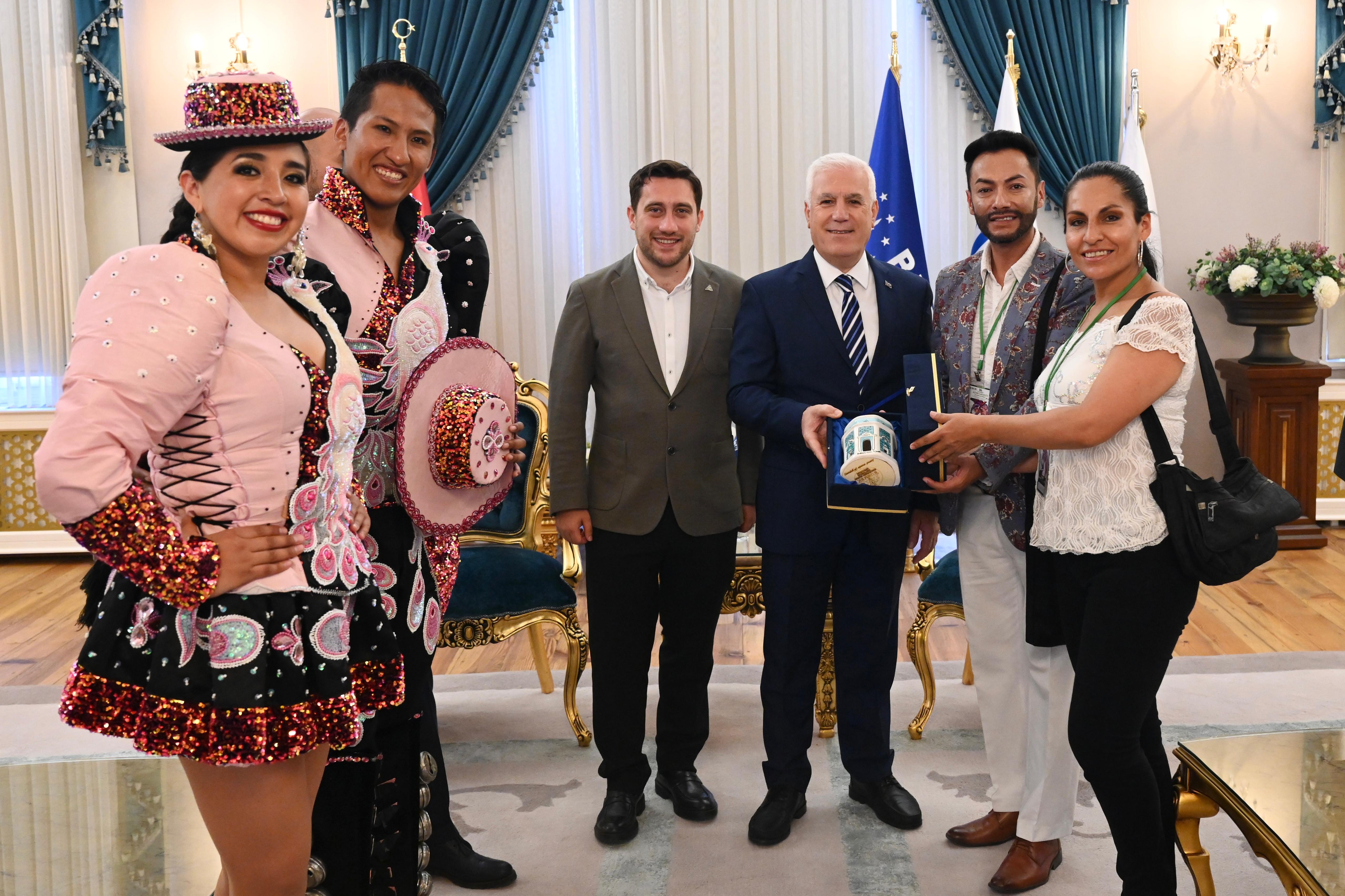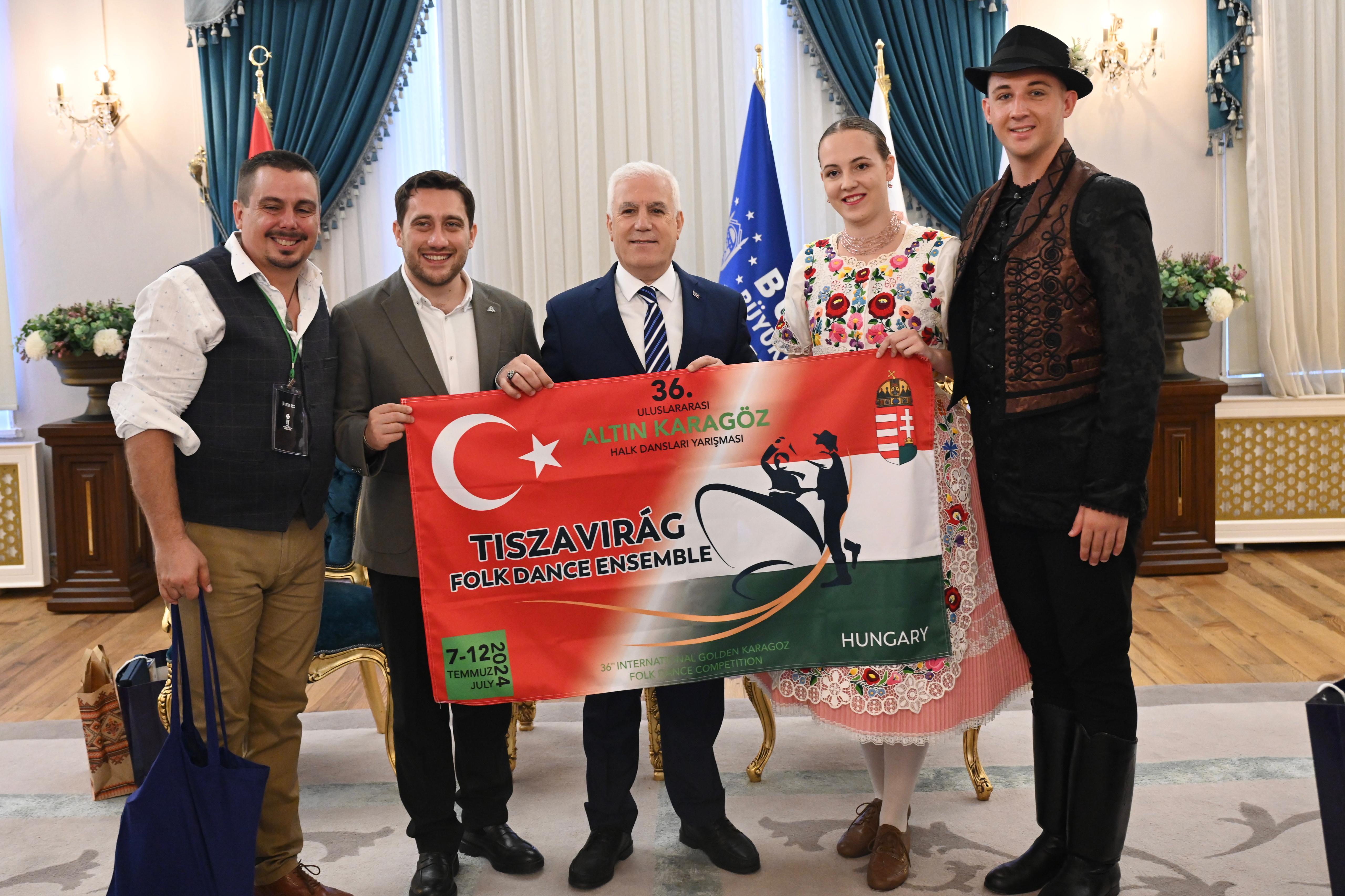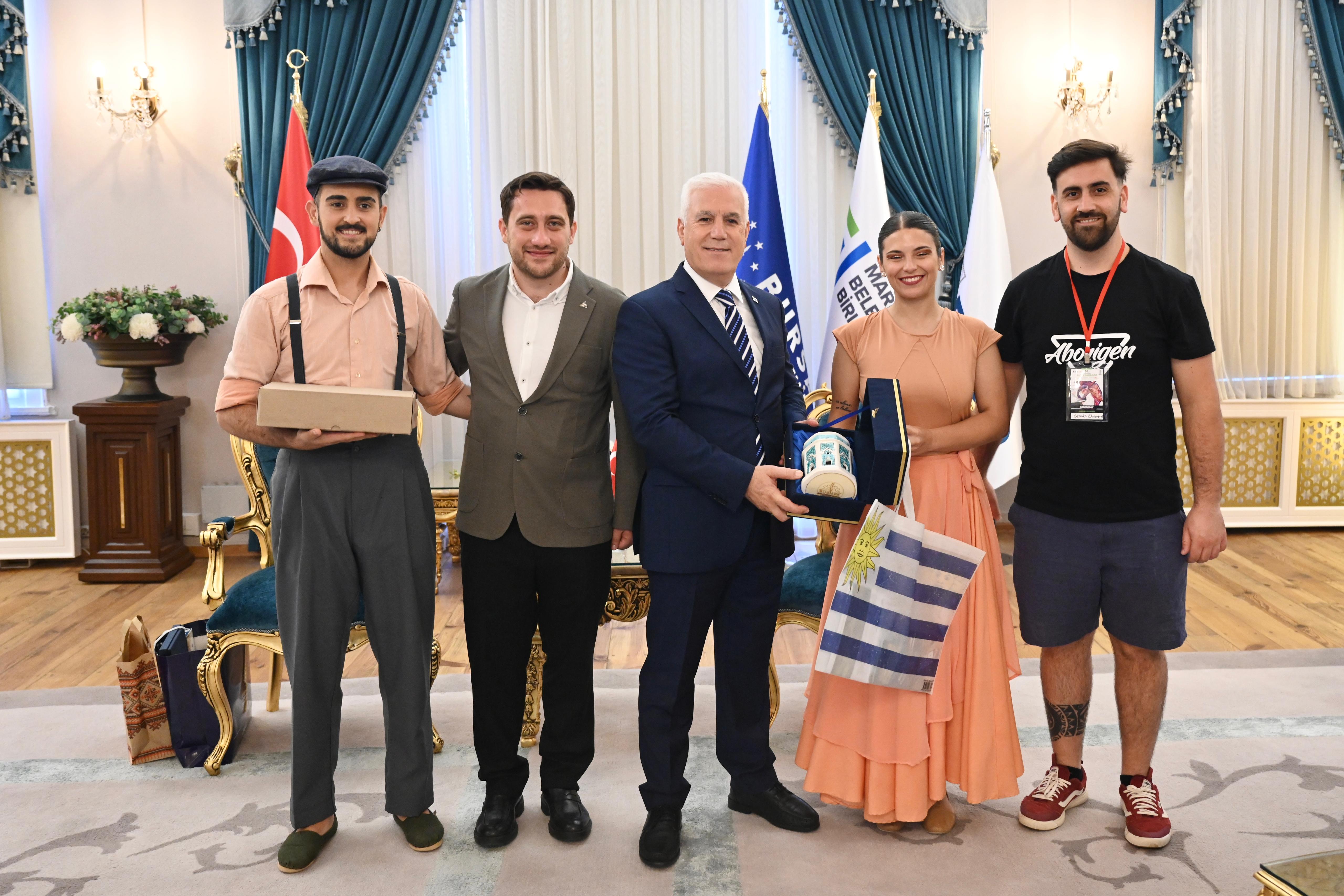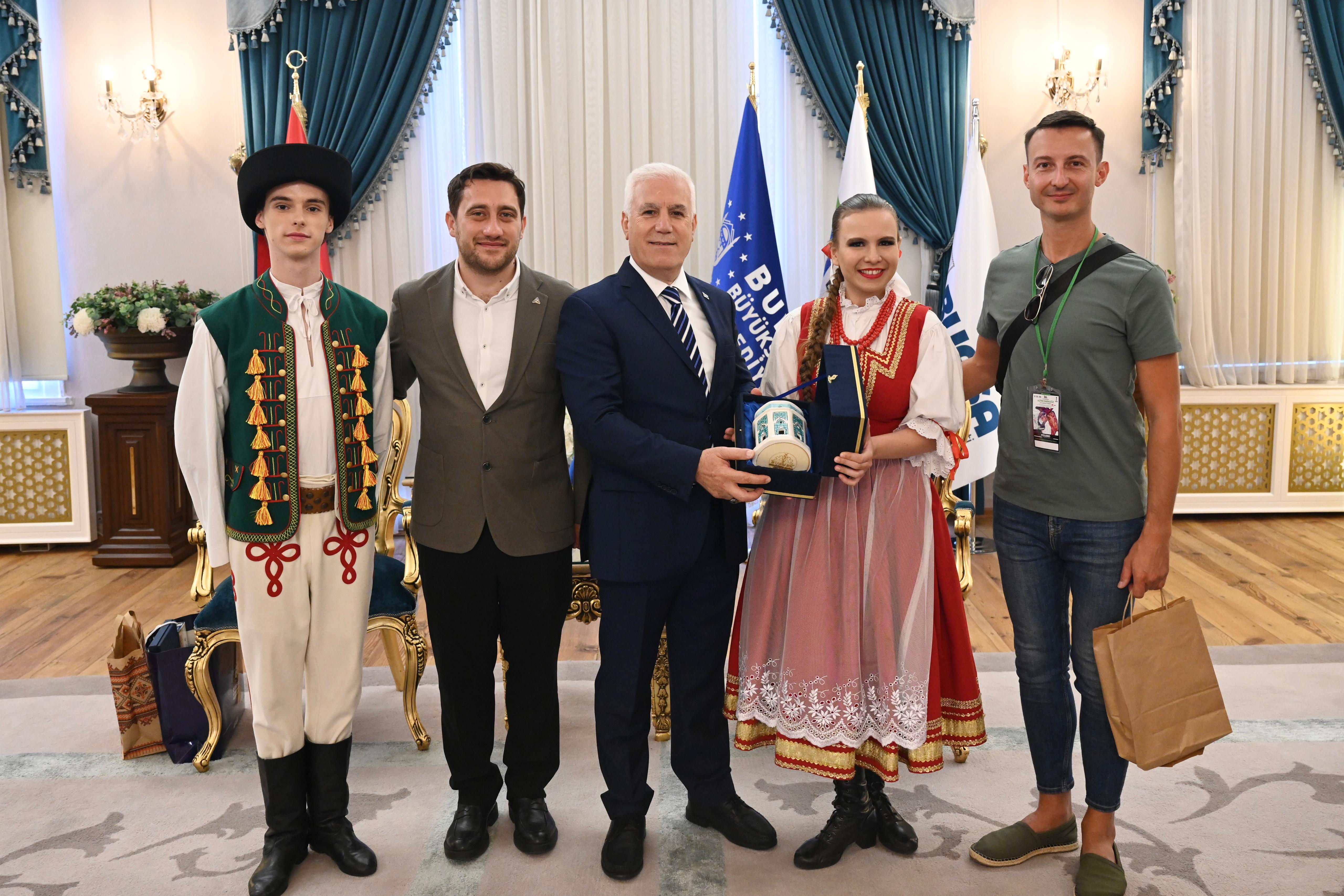 BURSA – Bursa Büyükşehir Belediyesi tarafından bu yıl 36’ncısı düzenlenen Altın Karagöz Halk Dansları Yarışması’na katılan ekiplerin temsilcileri, Başkan Mustafa Bozbey’i ziyaret ederek ülkelerinin sembol hediyelerini sundu.