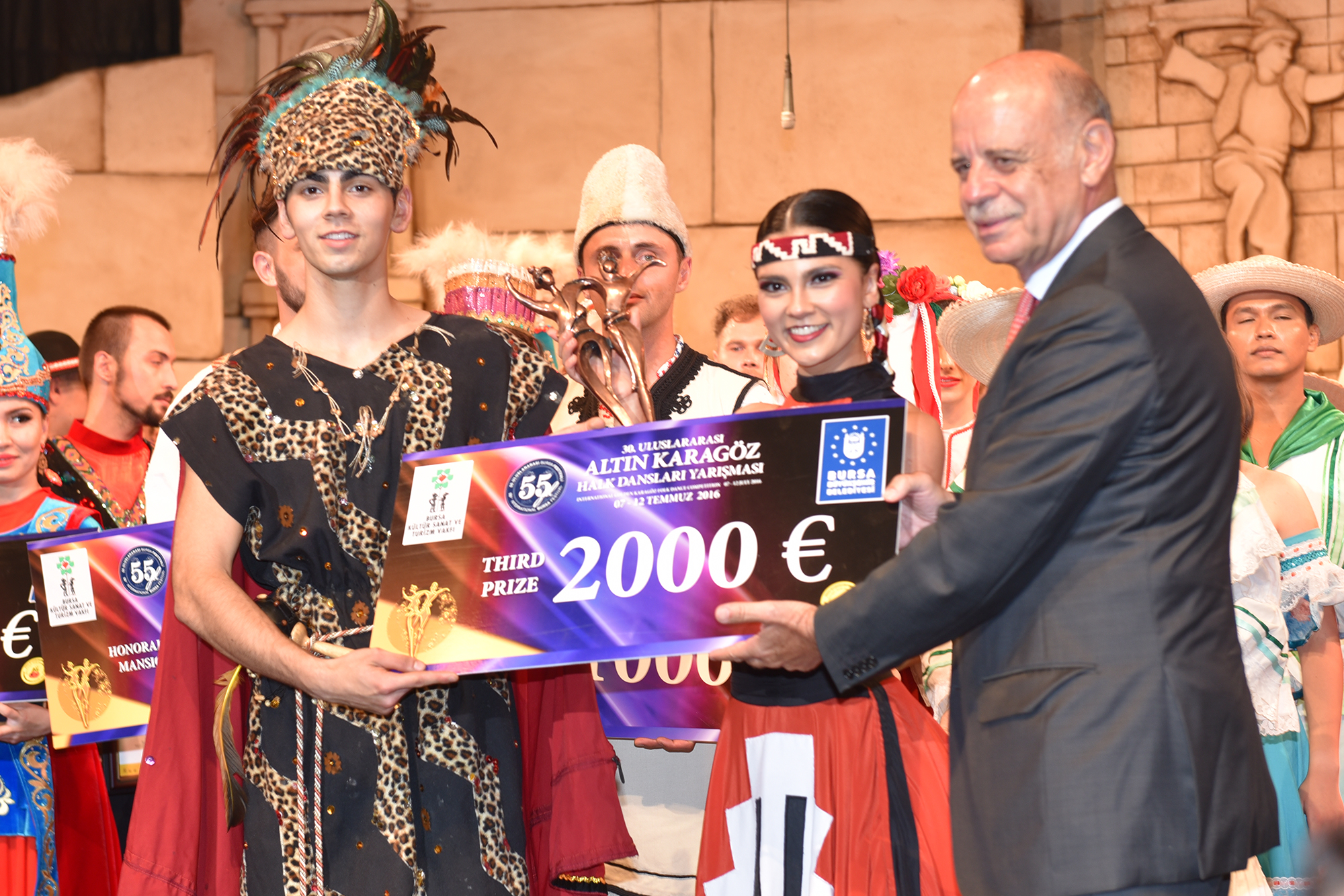 - BURSA BÜYÜKŞEHİR BELEDİYESİ TARAFINDAN DÜZENLENEN ‘30. ULUSLARARASI BURSA ALTIN KARAGÖZ HALK DANSLARI YARIŞMASI’NIN FİNALİNDE, ‘ALTIN KARAGÖZ’ ÖDÜLÜNÜ TÜRKMENİSTAN EKİBİ KAZANDI.