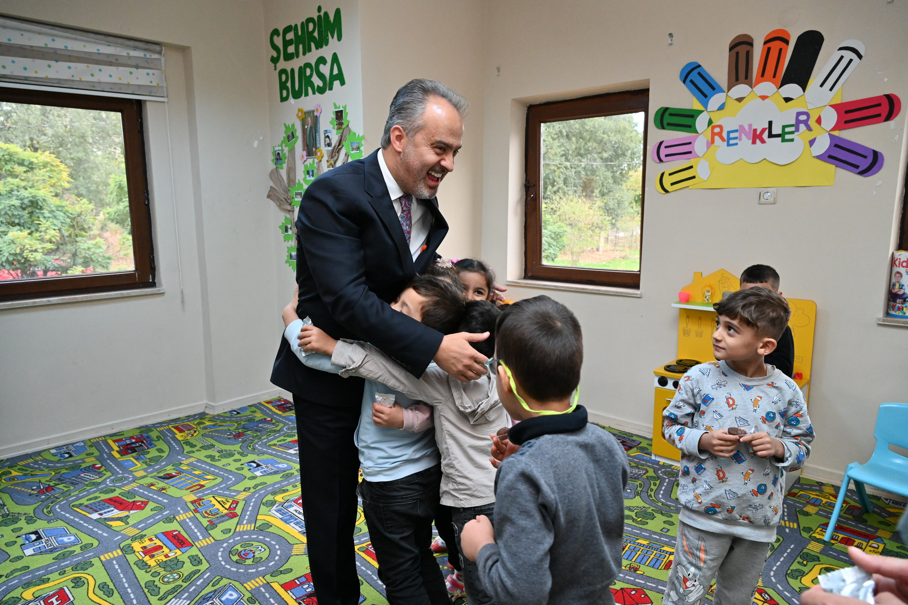 Büyükşehir Belediyesi’nin ‘dar gelirli ailelerin çocuklarının da okul öncesi eğitim hizmetlerinden faydalanabilmesi amacıyla’ 2019 yılında 6 merkezle başlattığı ve bugün adeta dev bir eğitim kurumuna dönüşen Ana Kucaklarında, Milli Eğitim müfredatının yanında ‘Şehrim Bursa’ dersi ile miniklere Bursa’nın değerleri de anlatılıyor. Bu yıl 21 merkezde, 180 öğretmen ve yaklaşık 2 bin öğrenci ile eğitimlerin devam ettiği Ana Kucaklarında, ‘Şehrim Bursa’ dersinin ‘Başkanımızı Tanıyalım’ konusu işlenirken, minik öğrenciler büyük sürprizle karşılaştı. Şirinevler Ana Kucağı’nı ziyaret eden Büyükşehir Belediye Başkanı Alinur Aktaş, hem minik öğrencilere kendini tanıttı hem de onlarla sohbet etti. Oldukça keyifli geçen derste çocuklar, Başkan Aktaş’a Hacivat Karagöz gösterisi sundu, şarkılar söyledi.