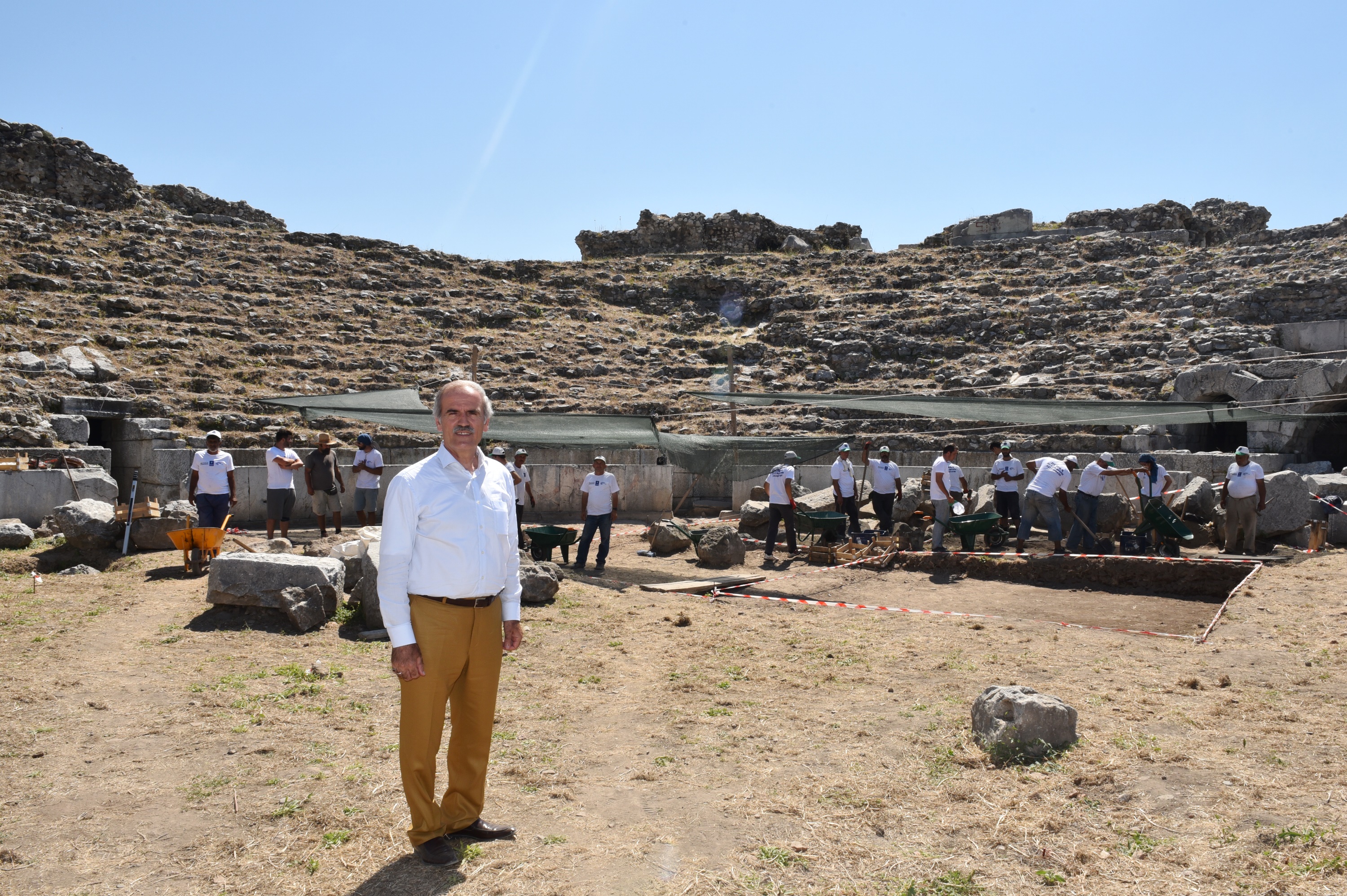Daha önce, senede 1,5 – 2 ay olan çalışmaların artık sürekli olarak yapıldığını belirten Başkan Altepe, “Şu anda da İzmir Dokuz Eylül Üniversitesi’nin değerli hocalarının katkılarıyla amfi tiyatronun özgün kimliğiyle ilk günkü orijinal haline dönüştürülmesi için çalışılıyor. Kazılarda orijinal zeminin bulunması ve dökülen yıkıntı taşların kaldırılmasına devam ediliyor. Tiyatroda ilk günkü haliyle restorasyon ve rekonstrüksiyon çalışmaları yapılacak ve yapı, 2000 yıl sonra orijinal işleviyle hizmet verecek” diye konuştu.