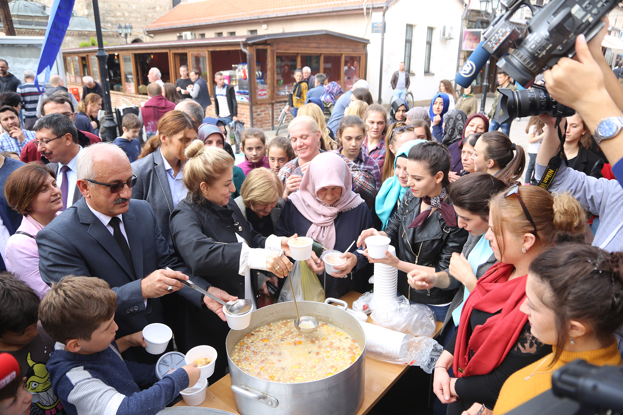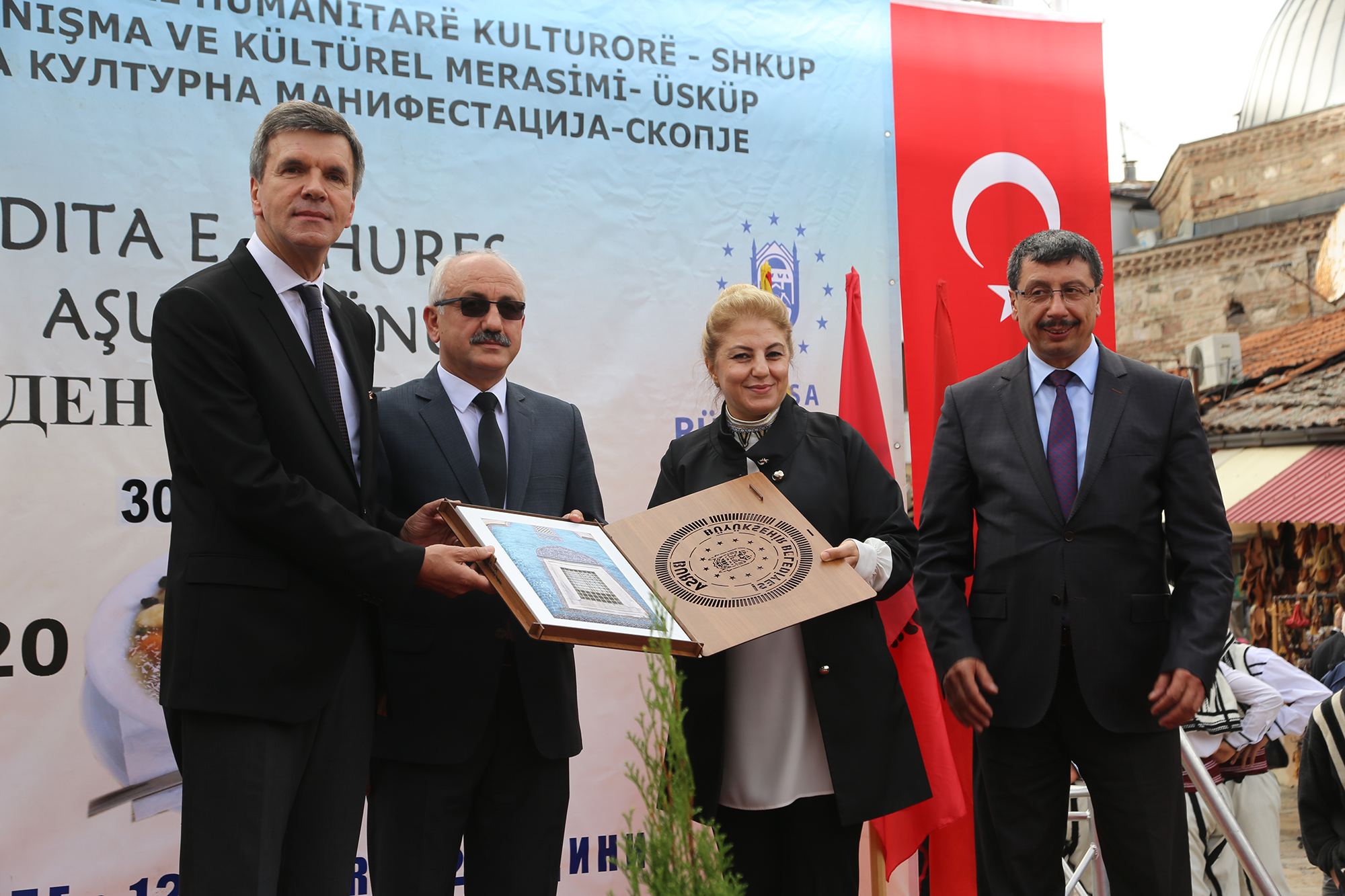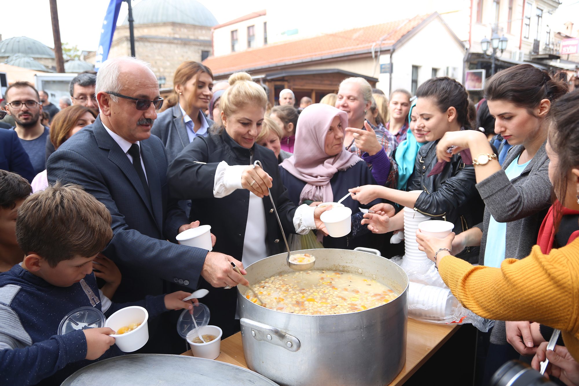 Bursa Büyükşehir Belediyesi ve Üsküp Çayır Belediyesinin himayesinde El Hilal Yardım Kuruluşu ile Ensar Yardımlaşma ve Kültür Derneğinin organizasyonunda bu yıl 12’nci kez aşure etkinliği düzenlendi. Üsküp Türk çarşısındaki Murat Paşa camii önünde düzenlenen etkinliğe Türkiye Cumhuriyeti Üsküp Büyükelçisi Tülin Erkal Kara, El Hilal Yardım Kuruluşu Başkanı Behicuddin Şehabi, Ensar Yardımlaşma ve Kültür Derneği Başkanı Süleyman Baki, Bursa Büyükşehir Belediyesi Sosyal İşler ve Eğitim Hizmetleri Şube Müdürü İbrahim Karaman ile Kültür A.Ş. Yönetim Kurulu Başkanı Rıfat Bakan da katıldı.