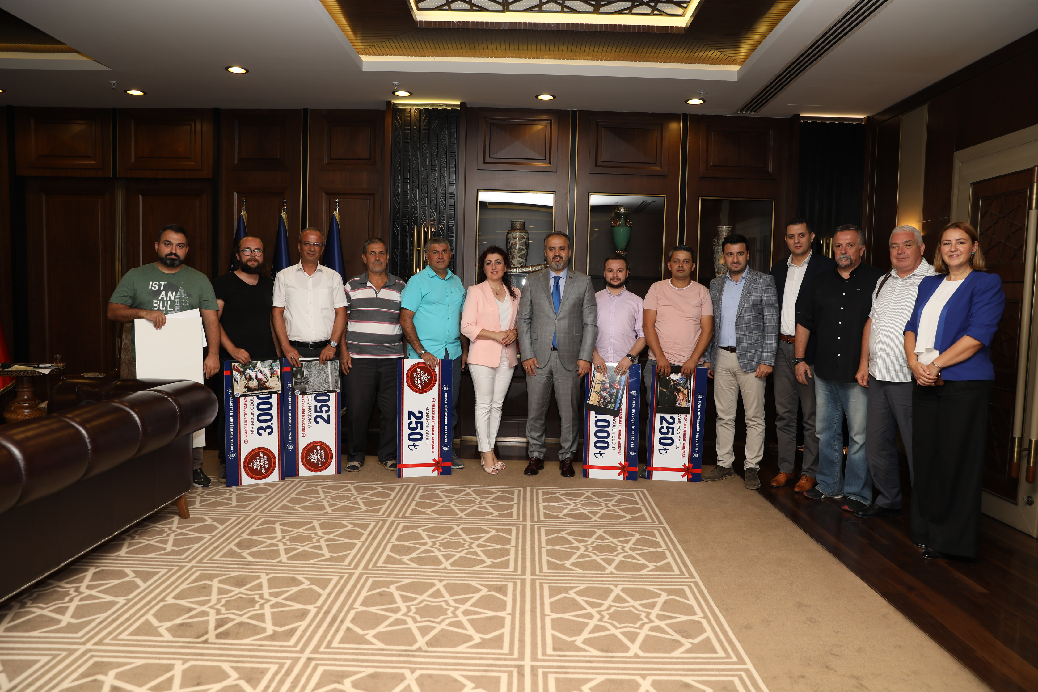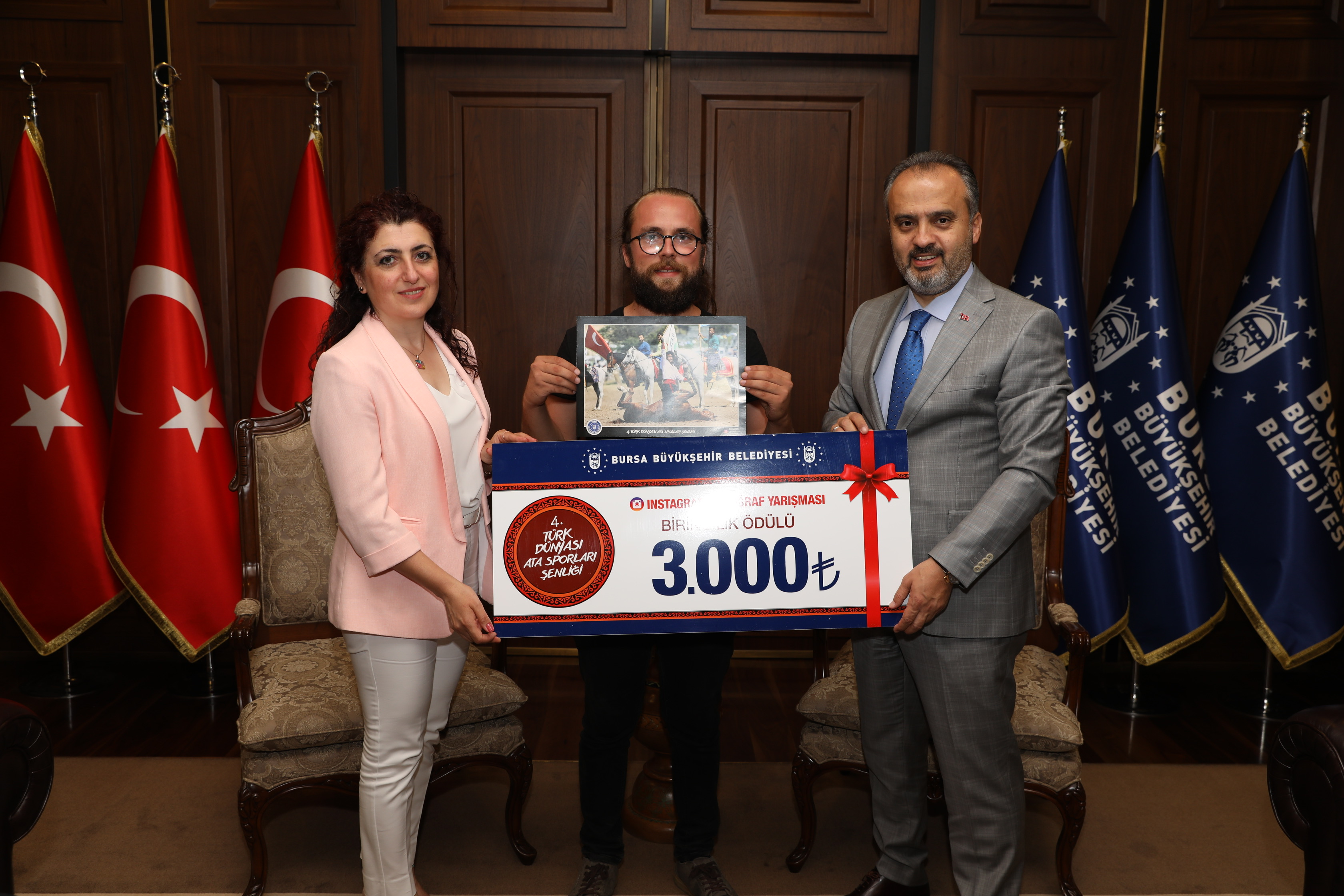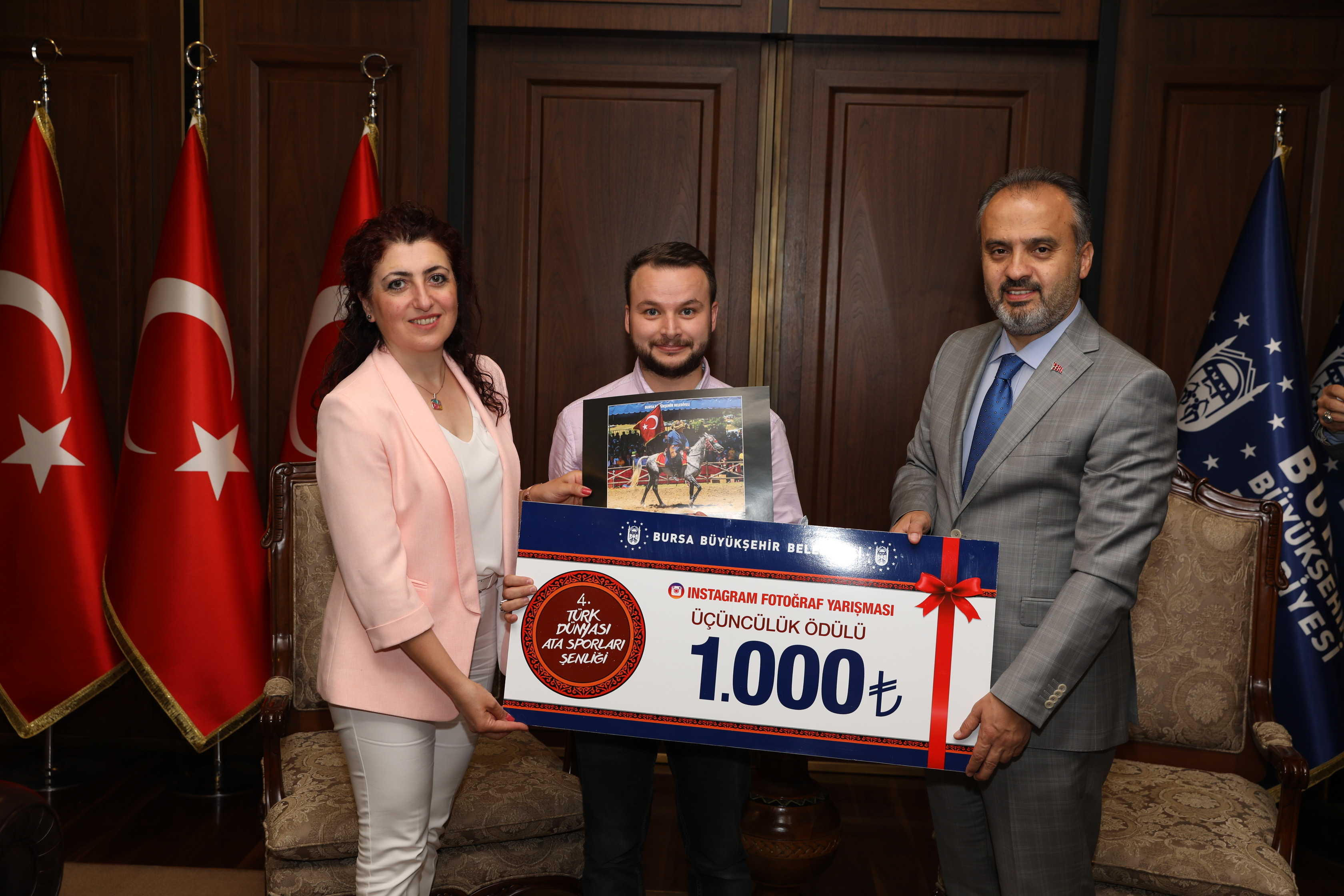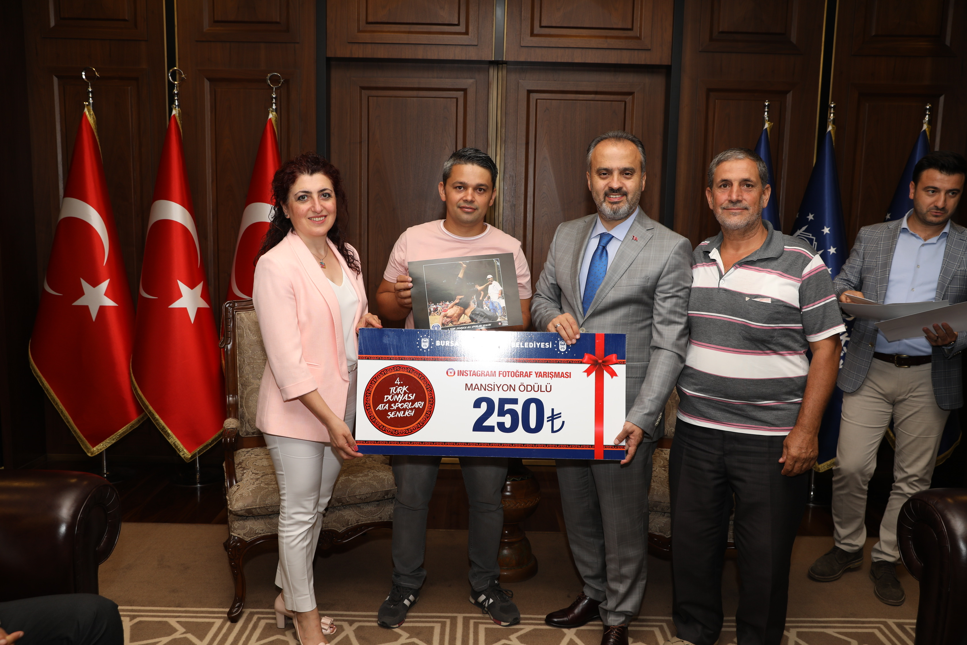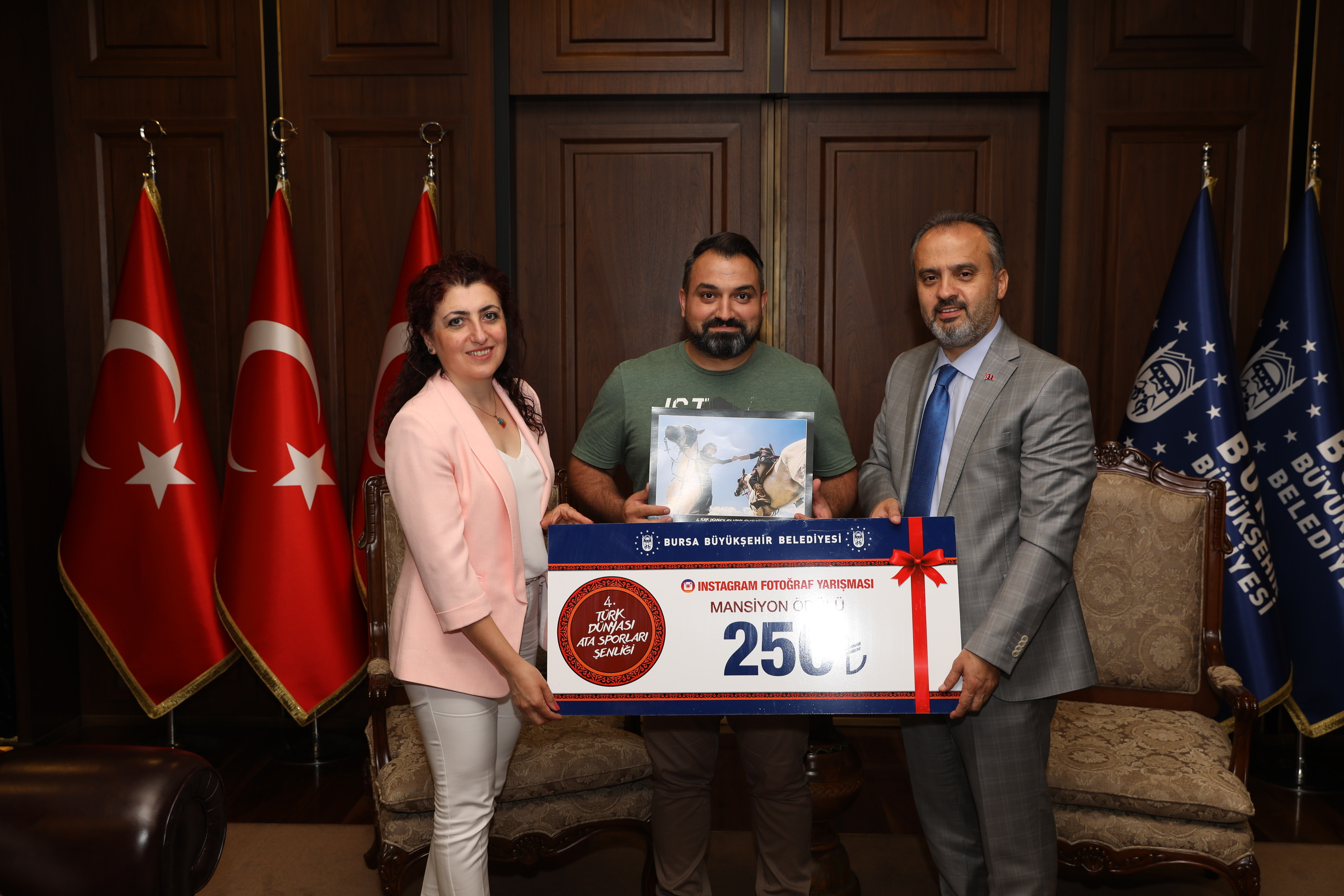 Başkan Alinur Aktaş, 4. Türk Dünyası Ata Sporları Şenliği Instagram Fotoğraf Yarışması’nda seçici kurul üyeleri olan Büyükşehir Belediyesi Basın Yayın ve Halkla İlişkiler Daire Başkanı Ahmet Bayhan, Bursa FotoFest Koordinatörü Murat Başlar, BUFSAD Başkanı Serpil Yavaş, BUFSAD Üyesi Bahar Borazan ve Fotoğraf Sanatçısı Fahrettin Beceren’i ağırladı. Büyükşehir Belediyesi’nde gerçekleşen ziyarette, yarışmada dereceye giren fotoğraf sahipleri de hazır bulundu. 19-21 Temmuz tarihleri arasında çekilen ve 4. Türk Dünyası Ata Sporları Şenliği’ni anlatan 400 fotoğraftan 9’u para ödülüne layık görüldü. Büyükşehir Belediye Başkanı Alinur Aktaş, yarışmanın birincisi olan Muammer İrtem’e 3000, ikincisi olan Ahmet Turan’a 2000 ve üçüncüsü olan Serdar Kıran’a da 1000 TL’lik hediye çeklerini teslim etti. Yarışmada mansiyon alan Halit Bozkuş, Senol Sevim, Mustafa Kılıç, Ümit Özgüler, Nebiha Bacıoğlu ve Ahmet Turan da 250’şer TL’lik para ödülüne layık görüldü.