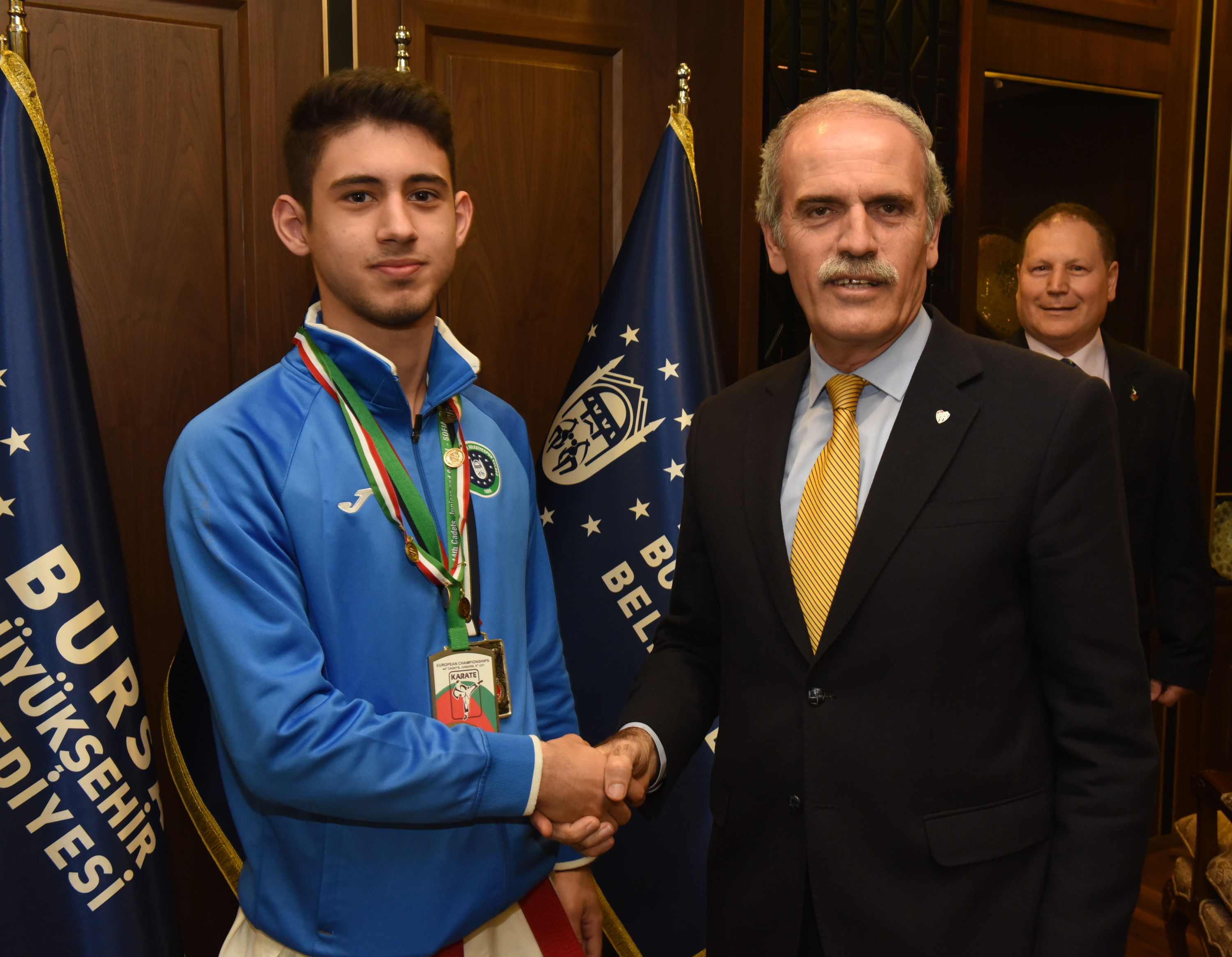 Bursa’nın sporda da öncü olması amacıyla çalışmalarına devam ettiklerini anlatan Başkan Altepe, “Büyükşehir Belediyesi olarak futbolun dışında farklı spor branşlarında da Bursa’yı öne çıkarmayı hedefledik. Gençlerimizin sporla daha çok zaman geçirmeleri, sağlıklı, disiplinli bireyler olarak yetişmeleri için çalışmalarımızı sürdürüyoruz. Büyükşehir Belediyespor Kulübü Karate Branşı milli sporcularımızdan Duhan Gümüş, 17 – 19 Şubat’ta Bulgaristan Sofya’da yapılan ‘44. Avrupa Ümit, Genç ve 21 Yaş Altı Karate Şampiyonası’nda 70 kg’da ülkemizi ve şehrimizi temsil ederek ‘Avrupa Şampiyonu’ olurken, aynı zamanda ümit ve genç kategorilerinde de altın madalya alan tek sporcu oldu. Kendisini tebrik ediyorum” diye konuştu.