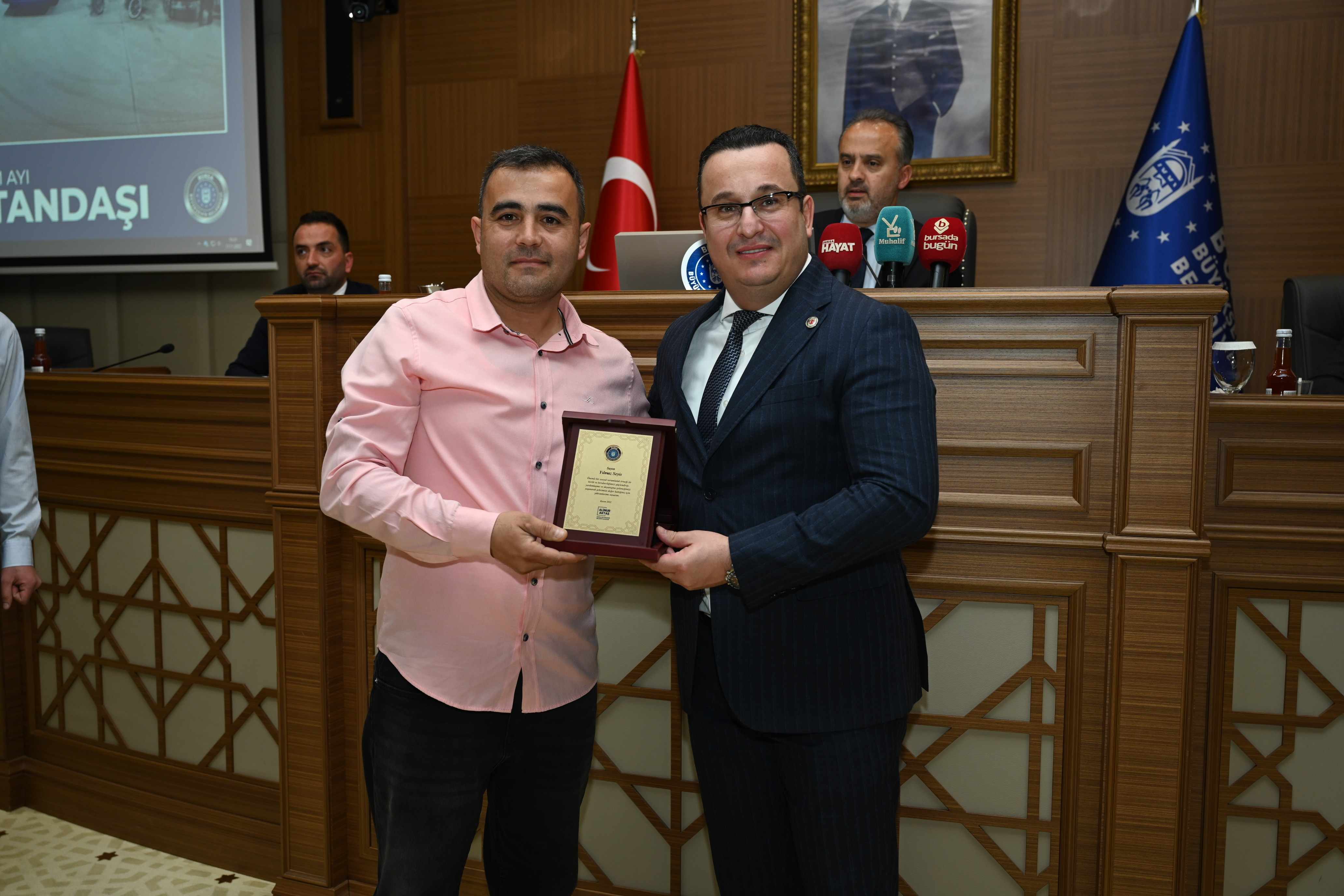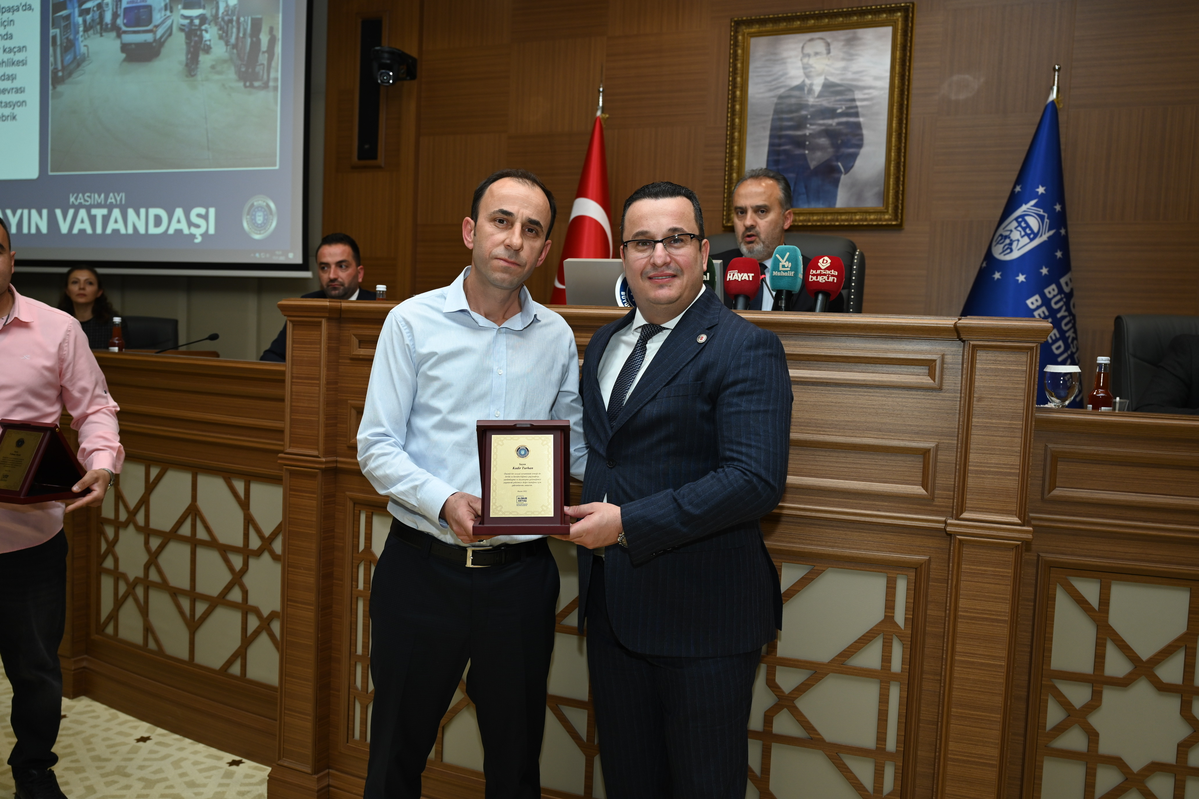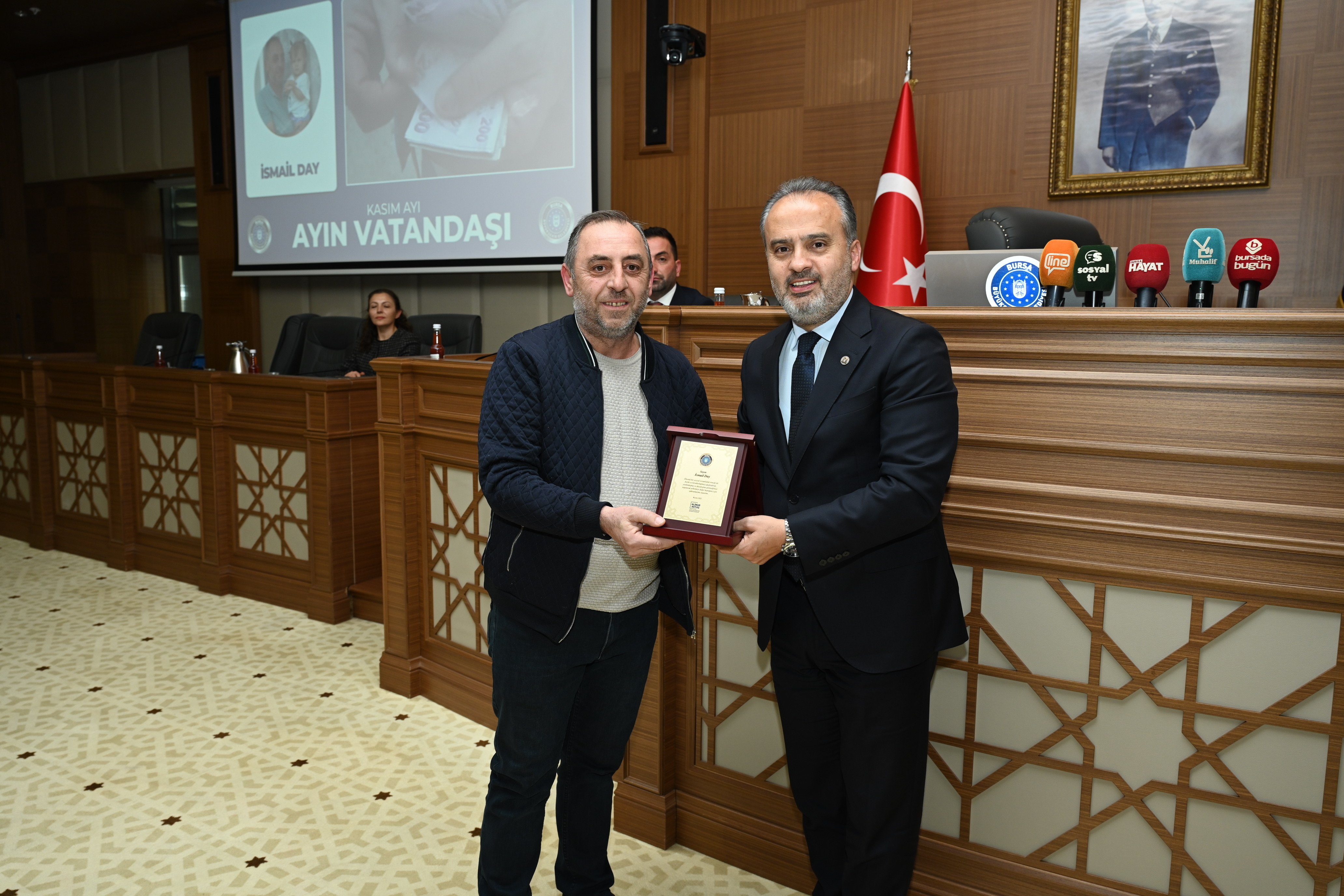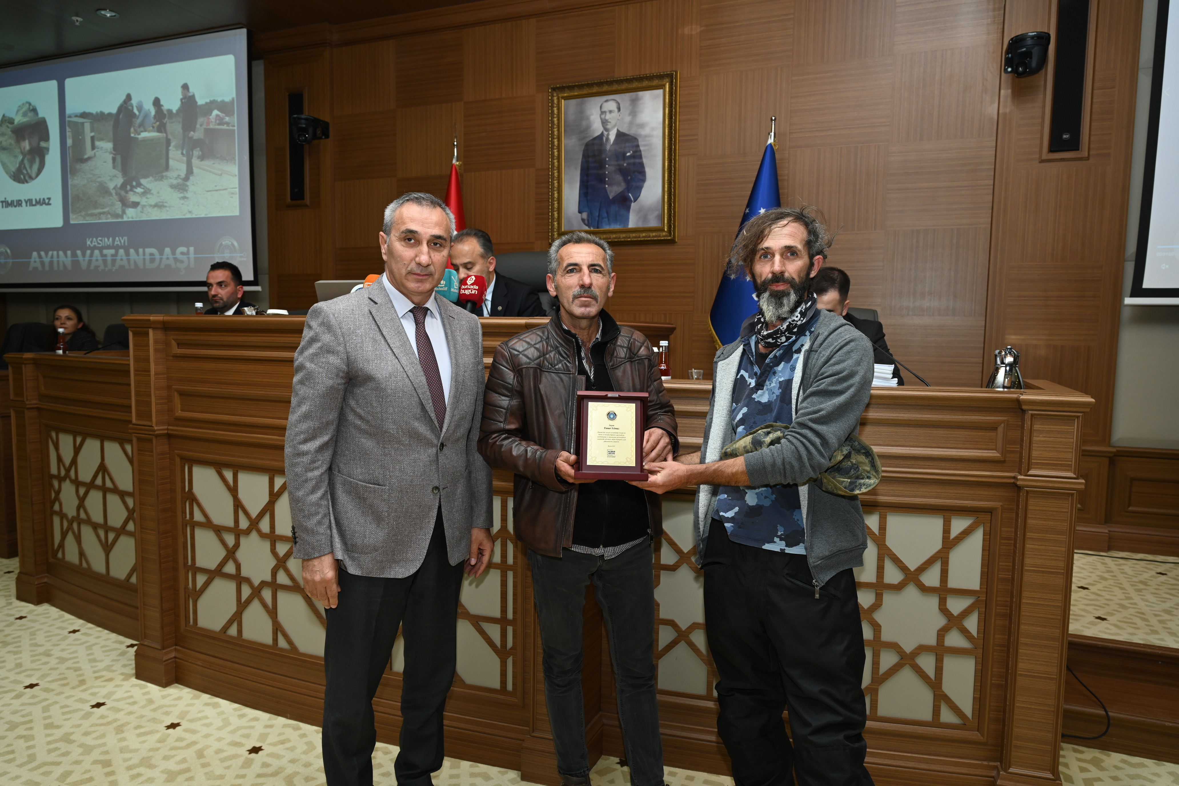 BURSA – Bursa Büyükşehir Belediye Meclisi’nin Kasım ayı olağan toplantısında, topluma örnek davranışlarda bulunan vatandaşlar ödüllendirildi.
