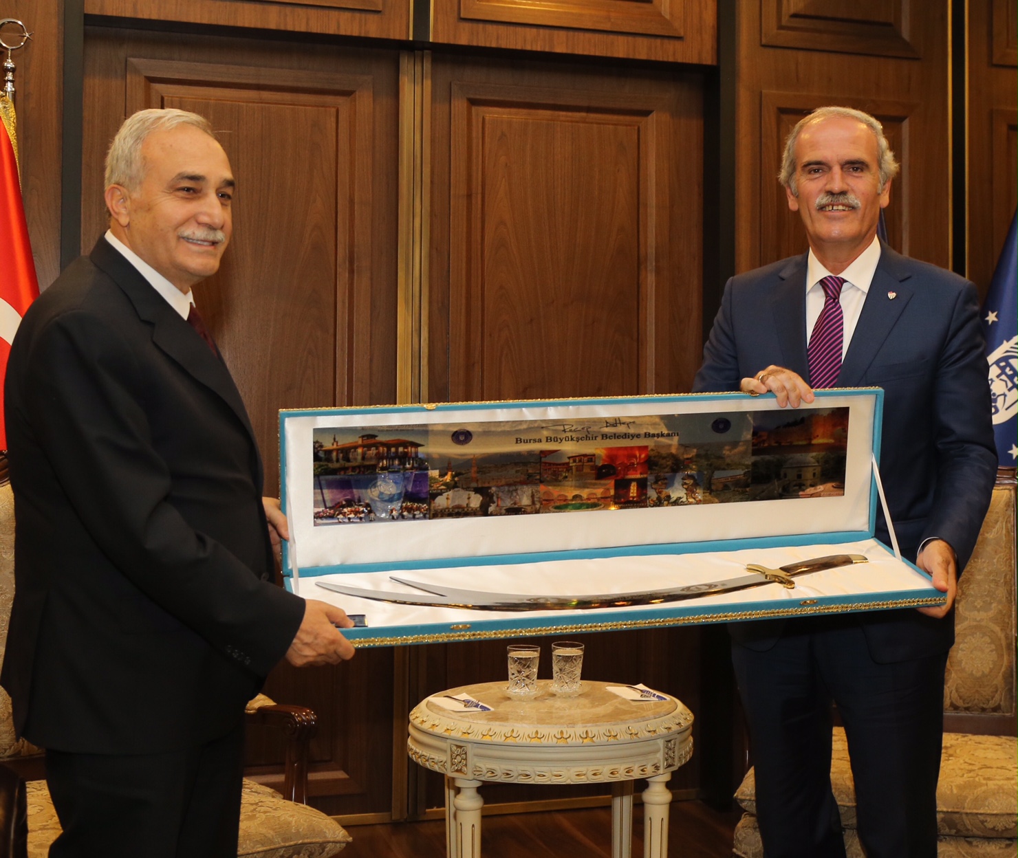 Başkan Altepe, ziyaretinden dolayı teşekkür ettiği Bakan Fakıbaba’ya Bursa işi el yapımı kılıç armağan etti. Bakan Fakıbaba, ziyaretin sonunda Büyükşehir Belediyesi’nin onur defterini imzaladı.