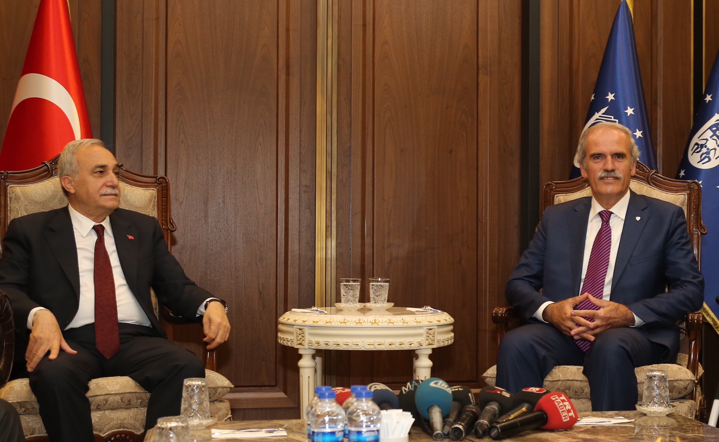 Bursa Büyükşehir Belediye Başkanı Recep Altepe, Gıda, Tarım ve Hayvancılık Bakanı Dr. Ahmet Eşref Fakıbaba’yı Büyükşehir Belediyesi Yeni Hizmet Binası’nda ağırladı. Bursa’da çeşitli temaslarda bulunan ve Büyükşehir Belediyesi’nin Bursa’da tarım ve hayvancılık alanında attığı adımları olumlu bulduğunu belirten Bakan Fakıbaba, ülke ekonomisinin gelişimi amacıyla yeni projelerinin var olduğunu ve bu noktada tarımsal yatırımlara destek vereceklerini söyledi.