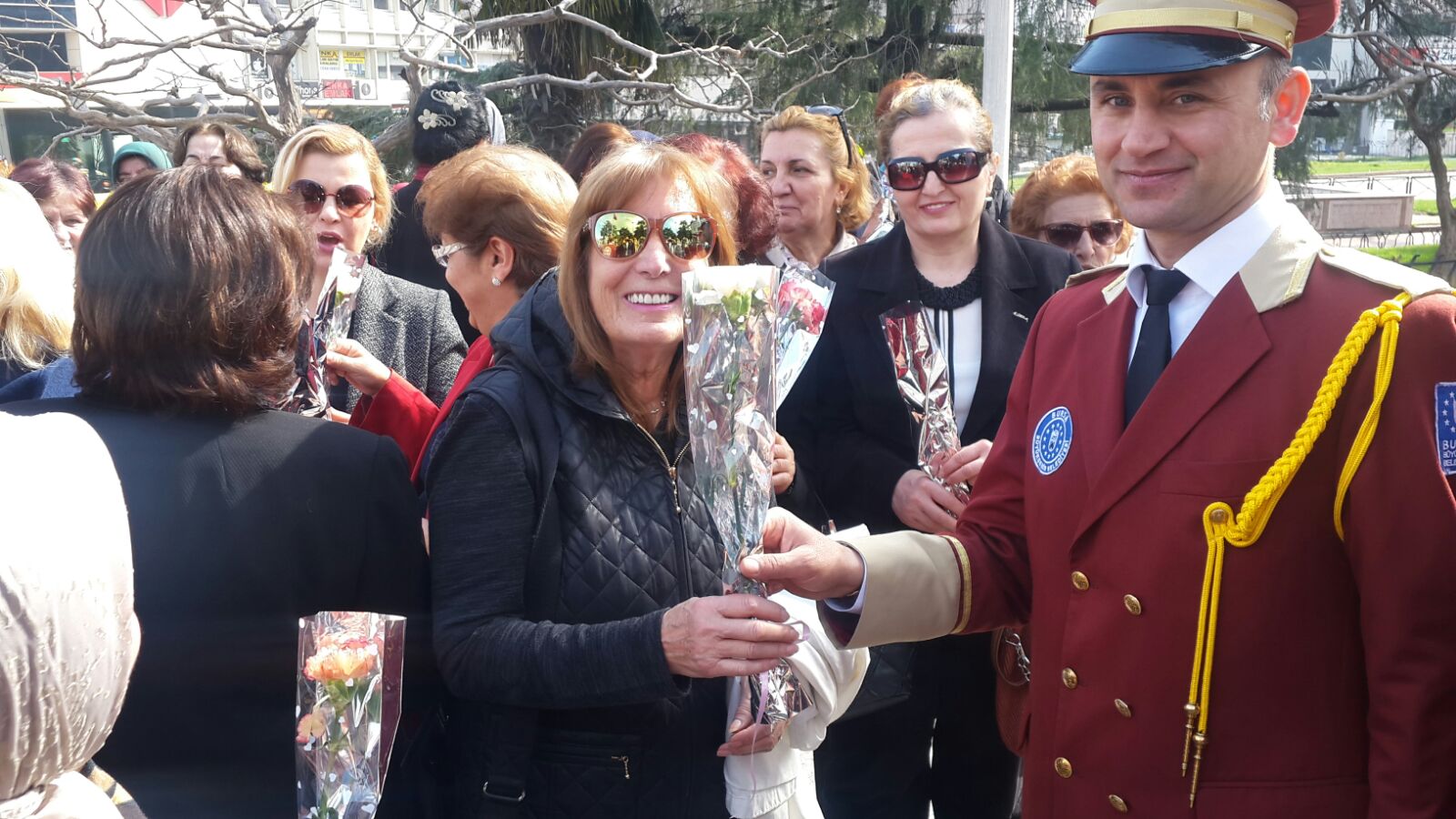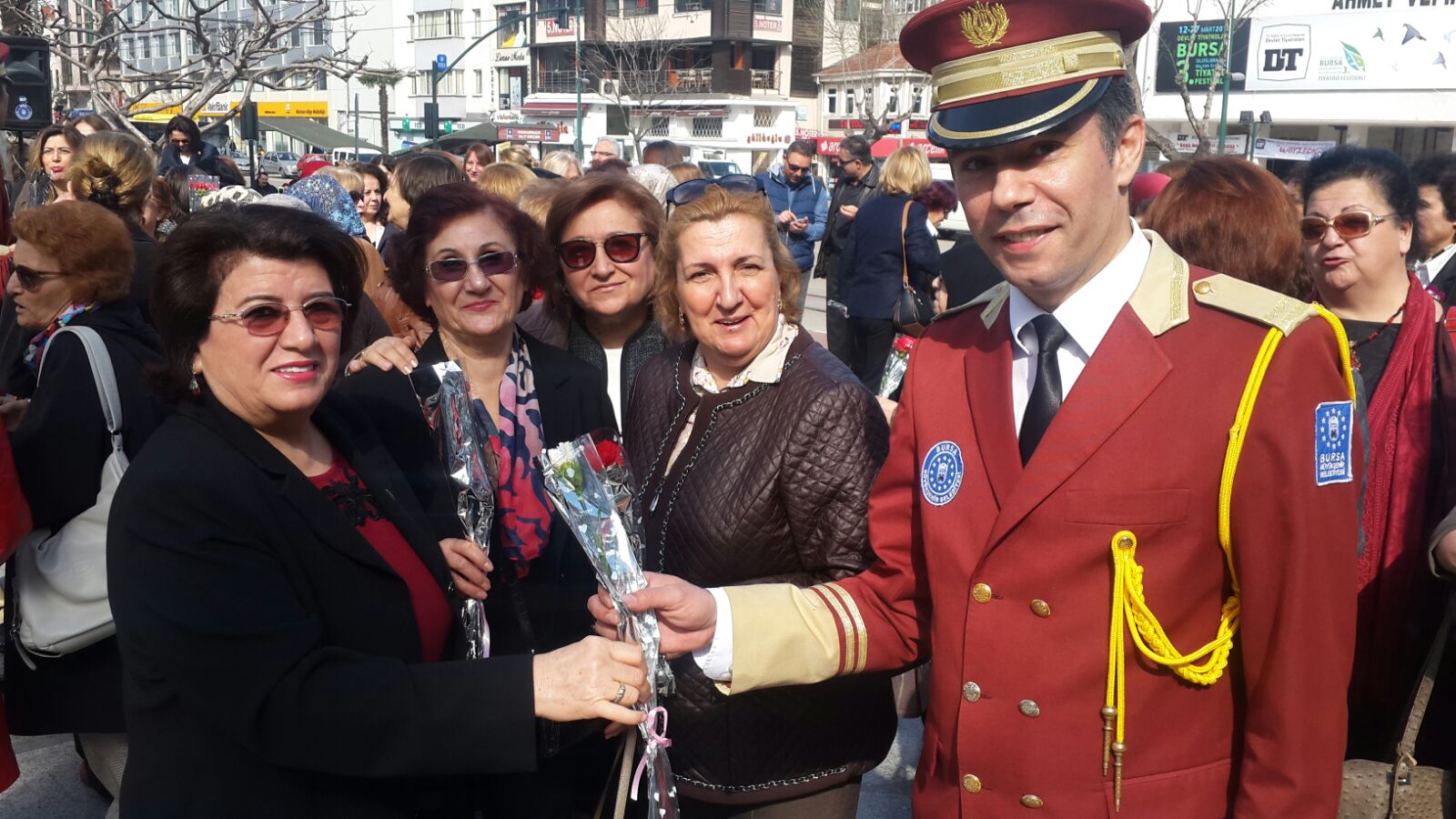 BURSA - Atatürk Anıtı önünde düzenlenen 8 Mart Dünya Kadınlar Günü etkinliklerinde İstiklal Marşı için tören alanında yerini alan Büyükşehir Belediyesi Bando Takımı, törenin ardından etkinliğe katılan tüm kadınlara karanfil dağıtarak, katılımcıların gönlünü fethetti.