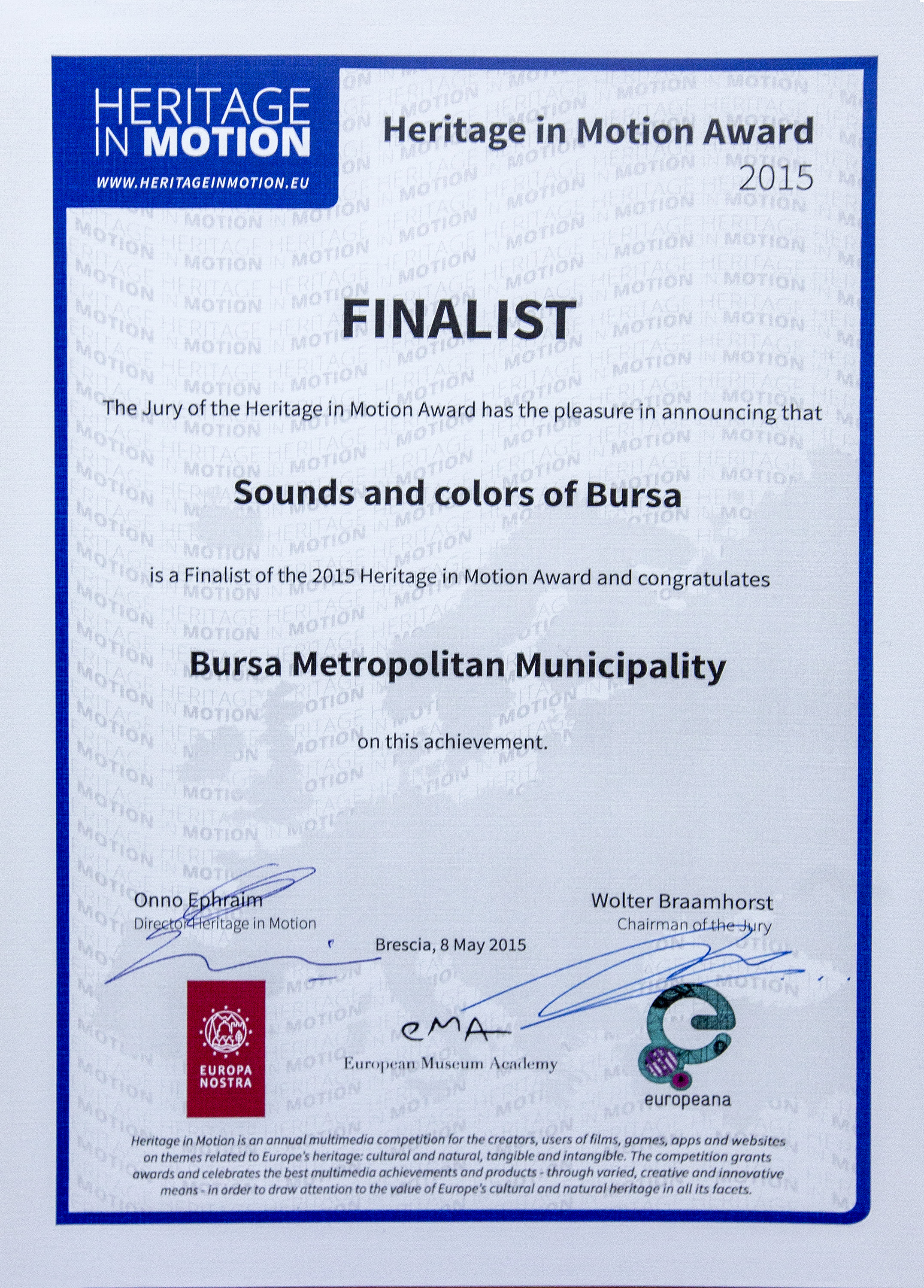 - BURSA BÜYÜKŞEHİR BELEDİYESİ TARAFINDAN TARİHİ VE KÜLTÜREL MİRASIN TANITIMI İÇİN HAZIRLANAN VE SOSYAL MEDYADA 1 AY İÇİNDE 3,5 MİLYON İZLEYİCİYE ULAŞAN “ELİMDE SAZIM BURSA’DA GÖZÜM” VİDEO KLİBİ, AVRUPA MÜZE AKADEMİSİ VE EUROPA NOSTRA TARAFINDAN BAŞARI BELGESİ İLE ÖDÜLLENDİRİLDİ.