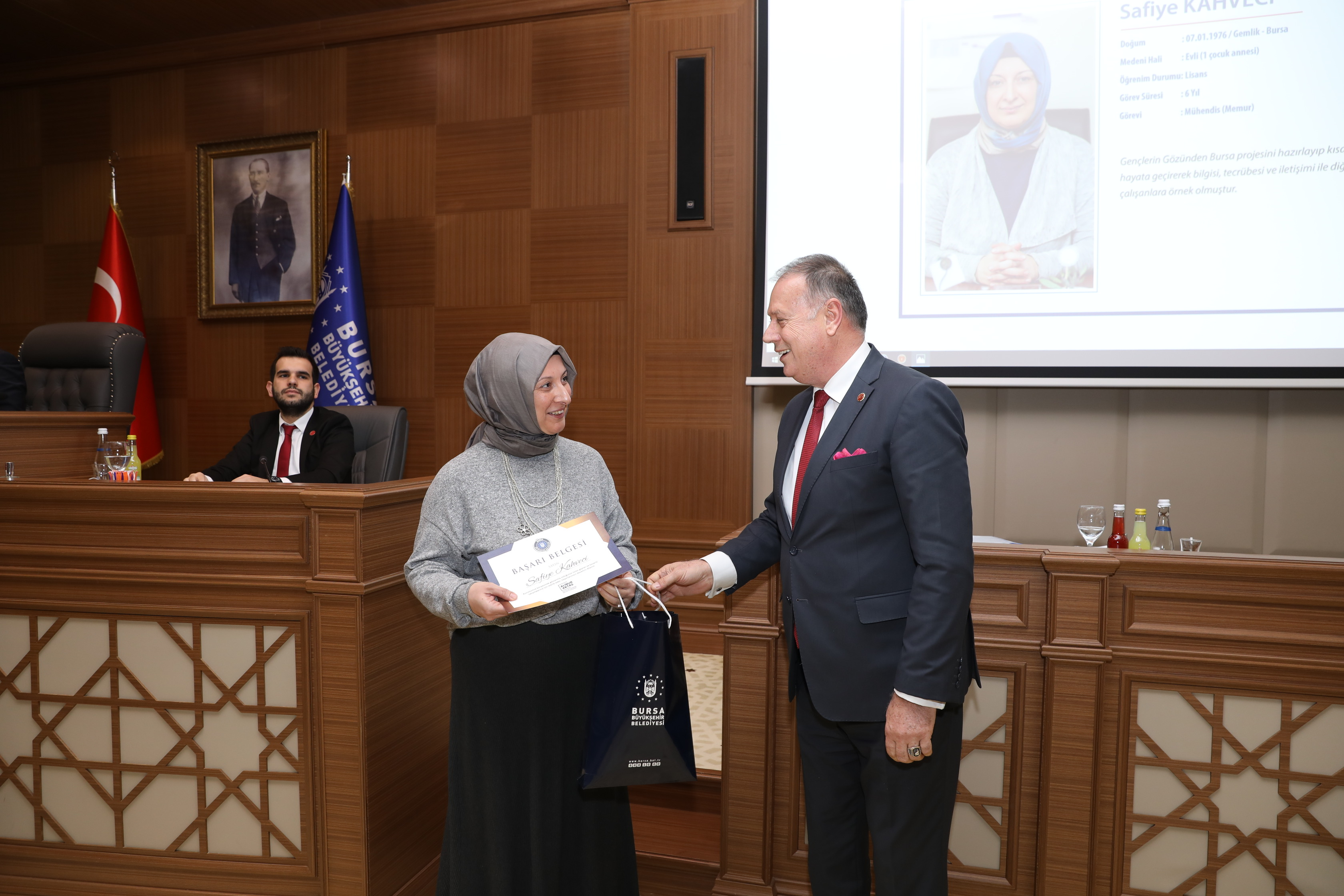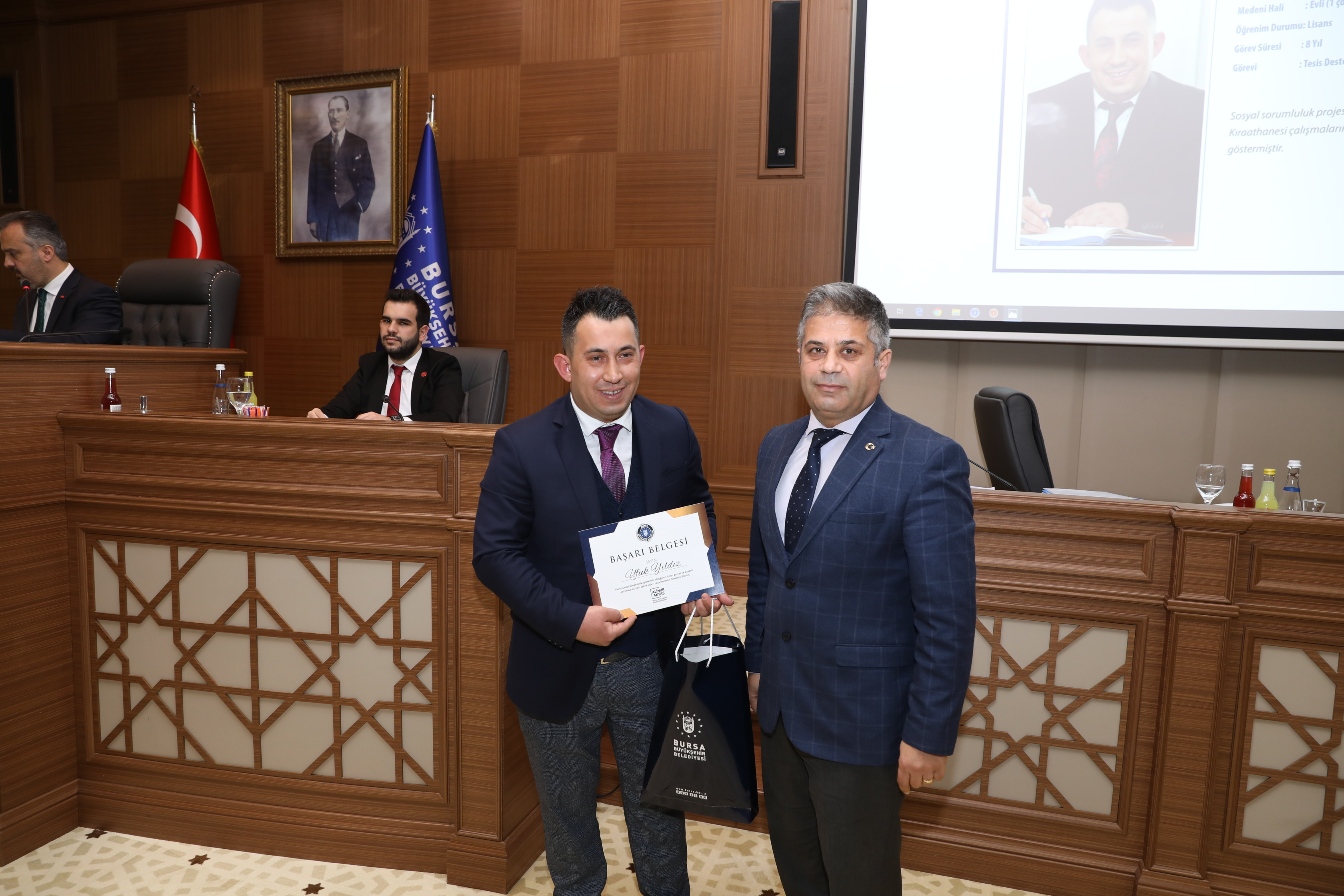‘Gençlerin Gözünden Bursa’ projesini hazırlayıp, kısa sürede hayata geçirerek bilgisi, tecrübesi ve iletişimi ile diğer çalışanlara örnek olan Mühendis Safiye Kahveci ve sosyal sorumluluk projesi olan çorba çeşmesi ve millet kıraathanesi çalışmalarının süratle bitirilmesinde gösterdiği gayret nedeniyle Ufuk Yıldız da ayın personeli oldu.